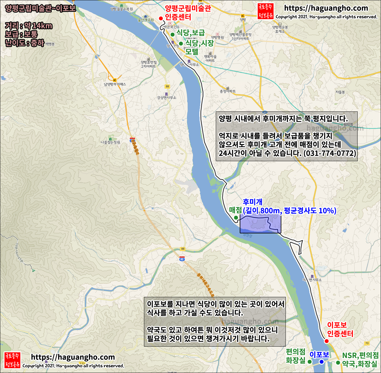 - 양평과 이포보 사이에 있는 후미개(길이 800m, 평균 경사도 10%)를 넘고 밥을 먹을지, 넘기 전에 밥을 먹을지는 당신의 선택입니다.
