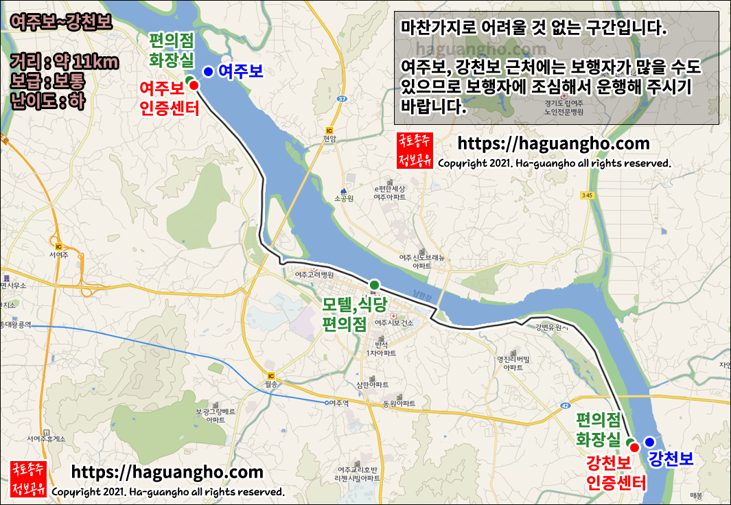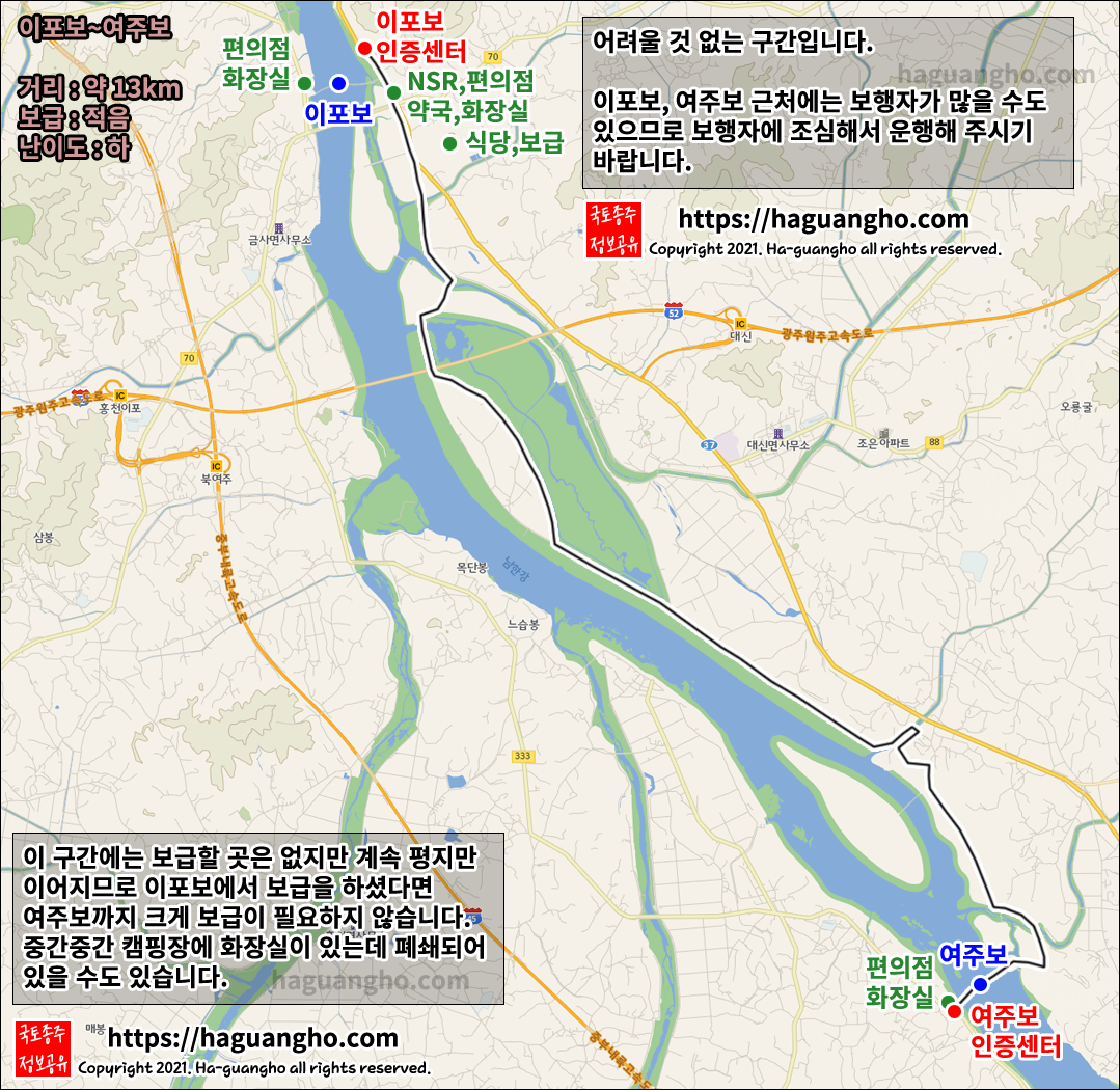- 이포보에는 매점이 있습니다. 근처에 식당도 있으므로 보급에 어려움이 없습니다. 강천보를 지나서부터는 보급이 필요한 순간에 보급을 할만한 곳이 없을 수도 있으므로 내 진행속도가 많이 느리다 싶으신 분은 여분의 물과 간식을 챙겨주세요.