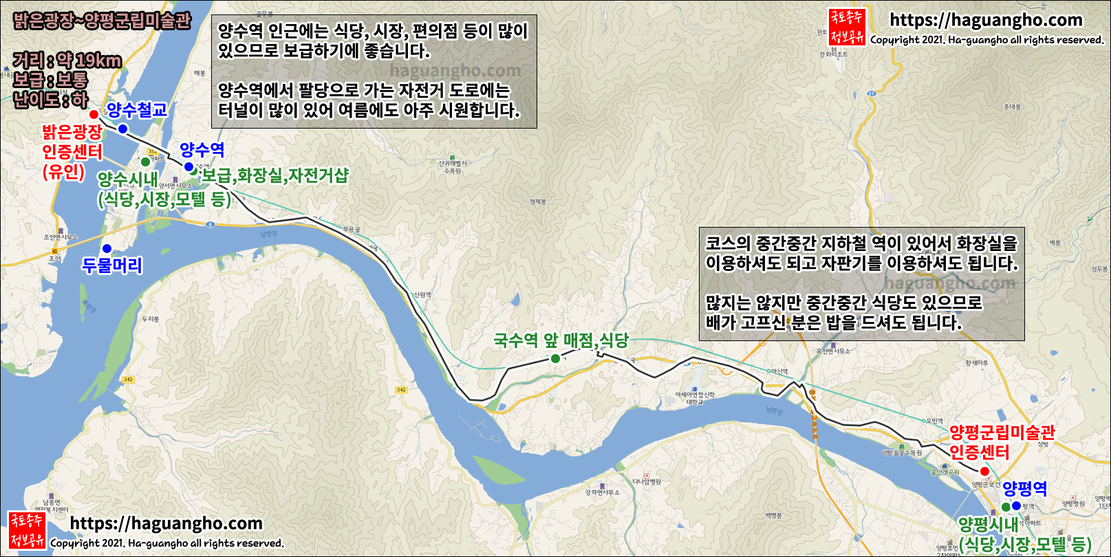 중간중간 편의점, 매점, 카페, 쉼터, 식당 등이 있으므로 보급이 전혀 어렵지 않습니다. 한강자전거길과 비슷합니다. 숙박업소는 양수역, 양평역에서 찾으시면 되고 화장실은 코스 중의 지하철(팔당역, 운길산역, 양수역 등등) 역사의 화장실을 이용하셔도 됩니다.