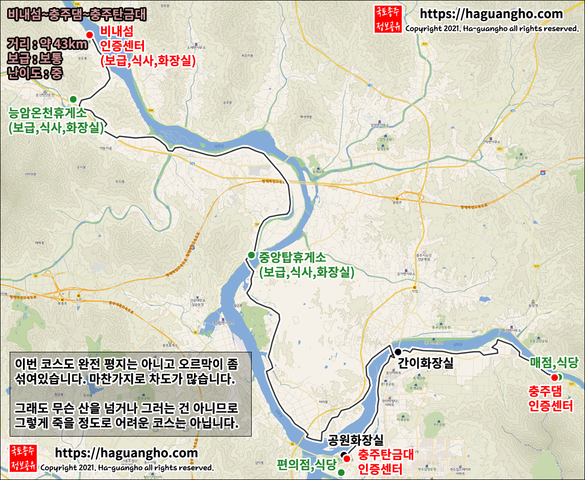 - 충주댐 인증센터는 국토종주에 들어가지 않습니다. 다만, 한강종주에 포함이 되므로 그랜드 슬램을 노리는 분이라면 반드시 들러서 도장을 찍어주세요. 개발자 개인의 의견으로는 '나는 안 할거야' 라고 생각하셨다가 나중에 후회하지 마시고 그냥 무조건 찍기를 권합니다. 한 시간 정도 돌아간다고 해서 뭐 어떻게 안 됩니다.