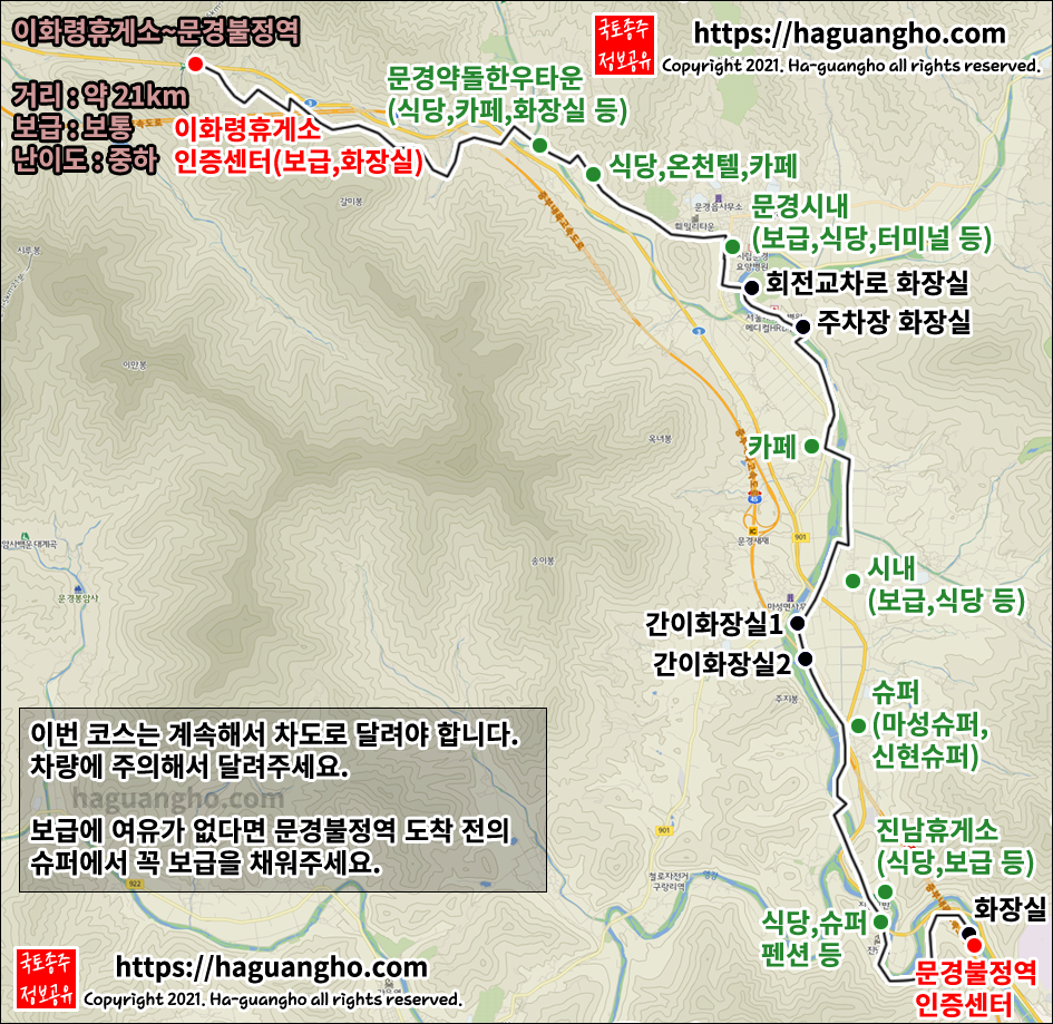- 이번 코스는 국토종주 중 최대의 난코스인 이화령(길이 4.9km, 평균 경사도 6%)이 있는 코스입니다. 개발자는 개인적으로 이화령의 바로 전에 있는 소조령(길이 2.1km, 평균 경사도 5%)이 더 힘든 느낌이었습니다.