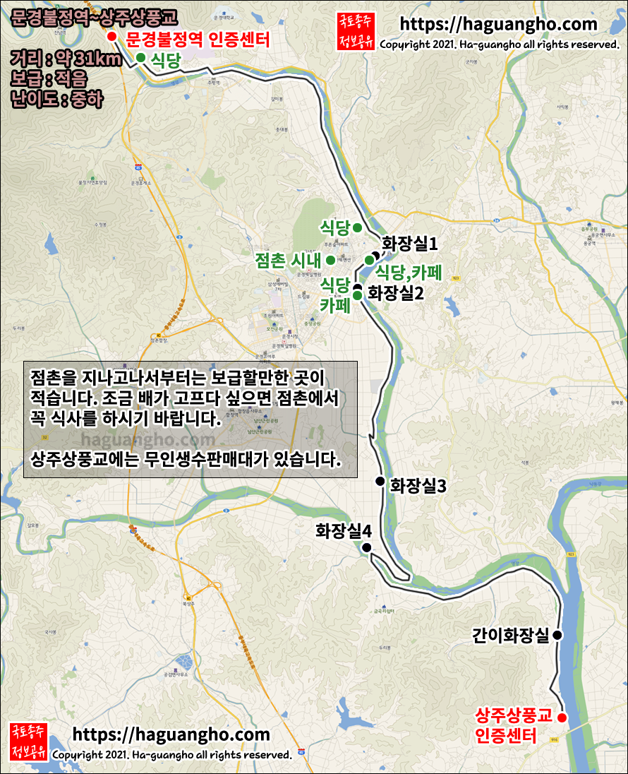 상주상풍교의 경우 매협재를 넘어가야 식당이 있으므로 식사를 원하시는 분은 매협재를 넘어 경천대까지 가셔야 합니다. 이 구간은 유난히 보급을 할 수 있는 장소가 적었던 기억이 있습니다.