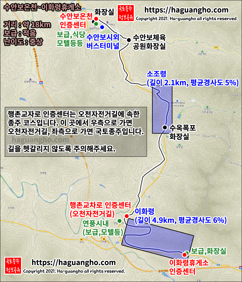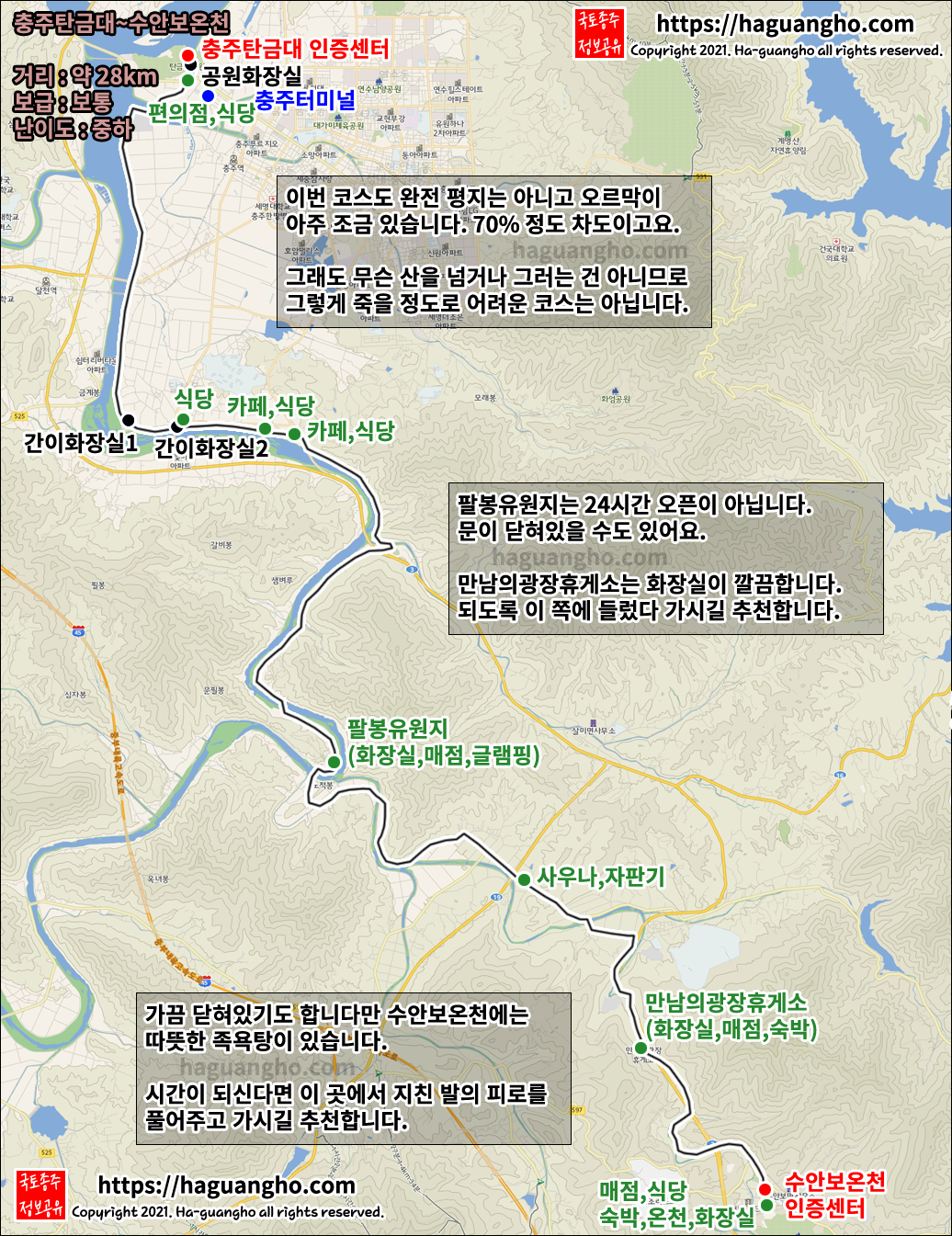수안보온천은 관광지이므로 식당과 보급도 가능하며 족욕을 할 수 있는 족욕탕이 있으니 시간이 되신다면 지친 발을 풀러 들렀다 가시는 것도 추천합니다. (코로나 등의 여파로 운영하지 않을 수도 있습니다.)