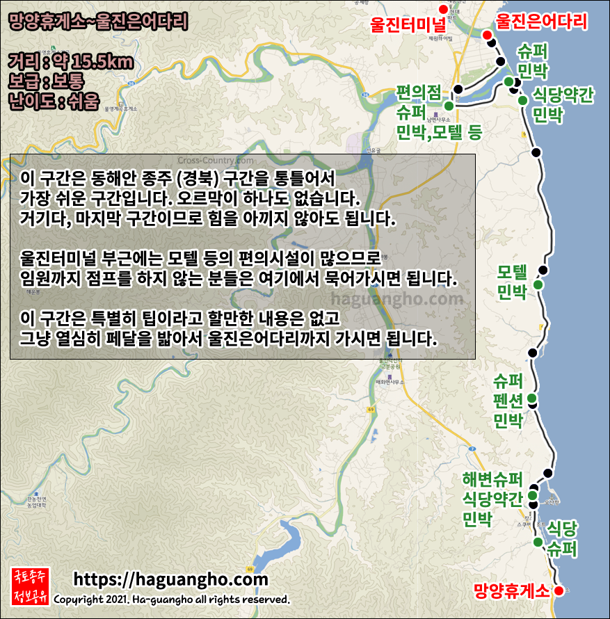 마지막 구간은 업힐이 없어서 난이도는 높지 않은 편입니다. 지금까지의 구간을 넘어왔다면 하품이 나올 수도 있습니다. 개발자는 울진터미널에서 임원으로 버스를 타고 점프 했는데 울진터미널에서 임원까지 자전거를 타고 가신다면 업힐이 많고 야간에는 어두우므로 되도록 해가 떠있을 때 달리는 것을 추천합니다.