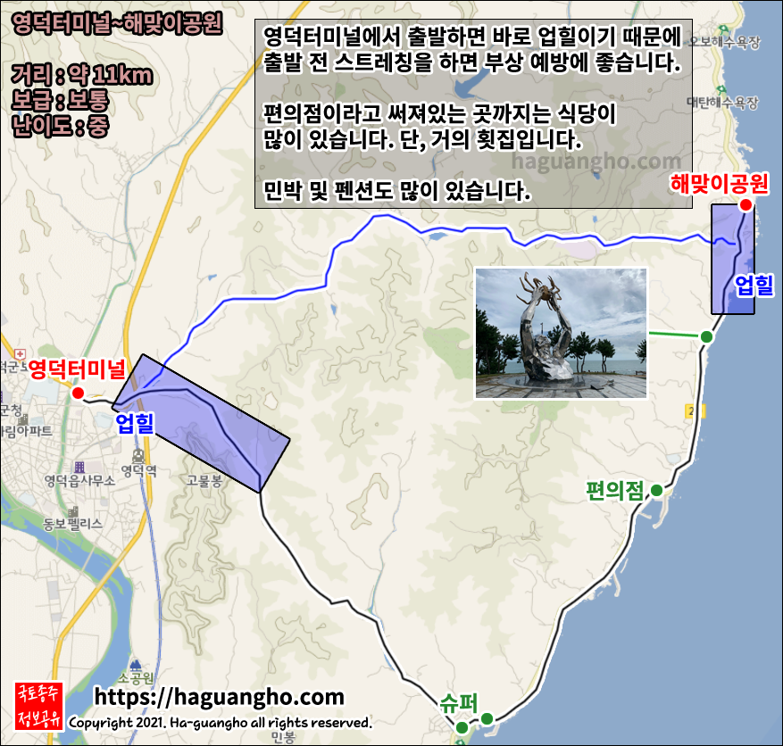 보편적으로 많이 이용하는 영덕터미널에서 해맞이공원까지의 루트입니다. 영덕터미널이 아닌 강구터미널을 통해서 가는 방법도 있습니다. 영덕터미널에서 해맞이공원까지 가는 거리와 별 차이가 없으므로 강구터미널이 가깝다면 강구터미널을 이용하셔도 좋습니다. 이 경우 이미지 상의 '슈퍼' 라고 써진 곳에서 만나게 됩니다. 강구 쪽에서 출발하는 게 체력 소모는 확실하게 줄일 수 있습니다.