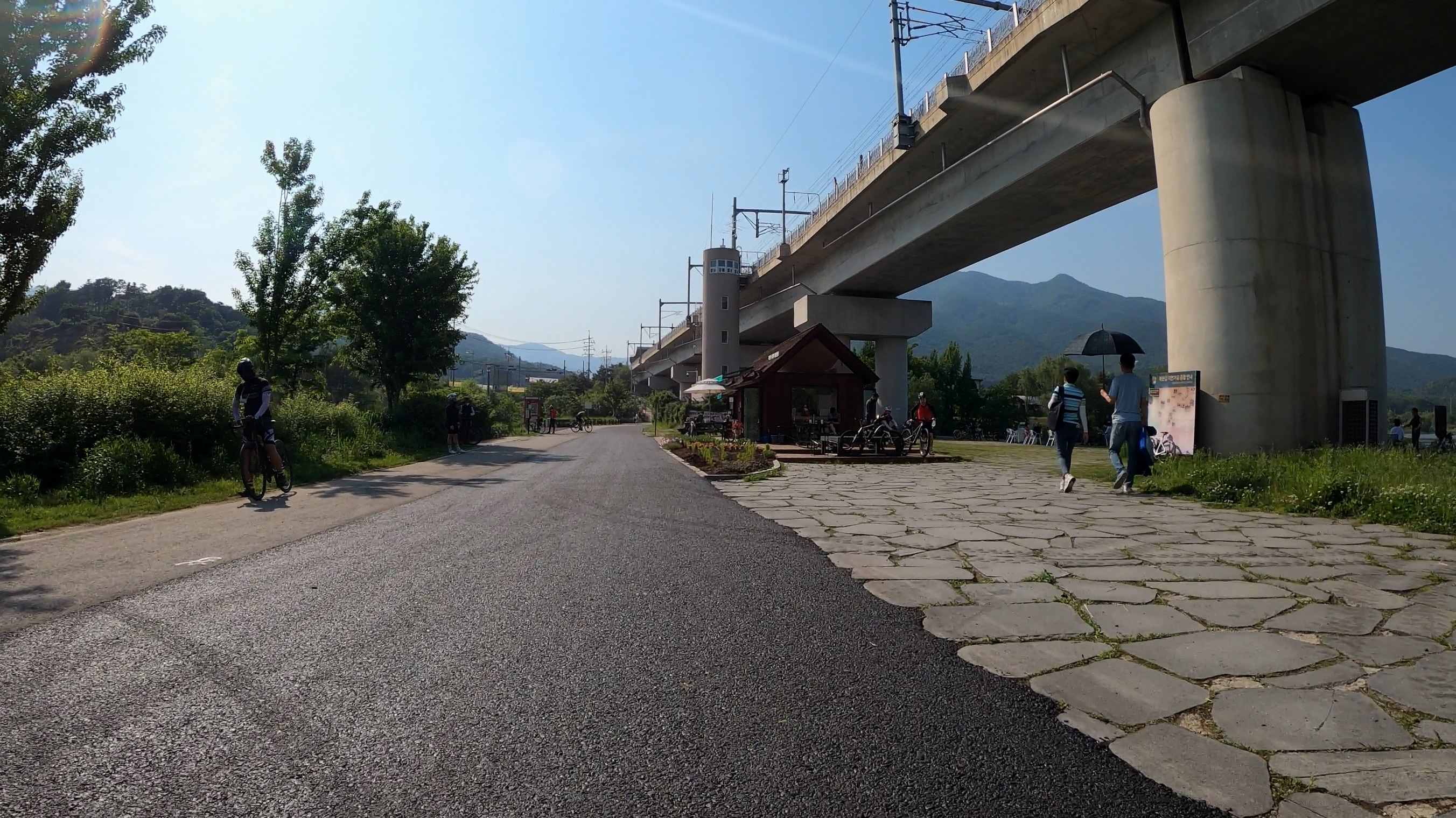 강천보 인증센터로 가는 길에는 공원이 많아야 보행자에 항상 주의해야 한다. 여기는 주말이 아니더라도 항상 사람이 많은 것 같은 느낌이다. 대여 자전거를 비롯하여 전기 자전거, 보행자 등등 주의해야 할 것이 많으니 항상 정신을 똑바로 차려야 한다.