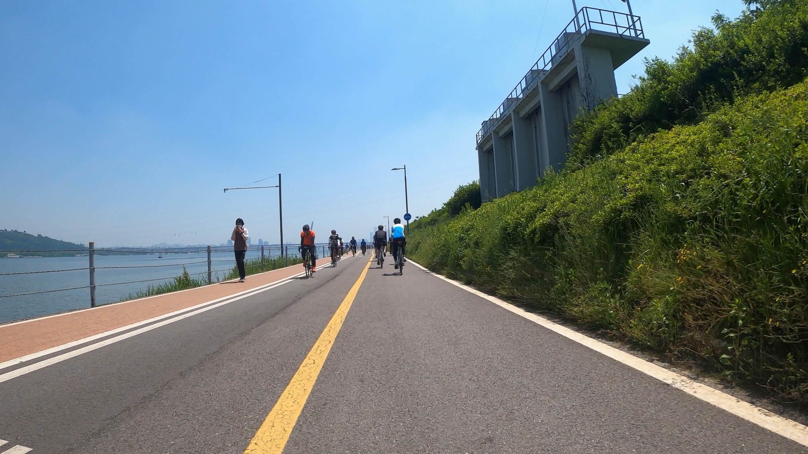 사실 아라한강갑문 인증센터로 가는 길에 대한 내용은 특별히 쓸만한 내용이 없다. 보급할 곳도 많고 화장실도 많고 딱히 어려운 코스도 아니고 몇 번이고 와봤던 코스이기 때문에 새로울 것 없이 그냥 길을 따라 설렁설렁 달리다보면 어느덧 목적지인 아라한강갑문 인증센터에 도착할 수 있다. 그런데 정말 이 날따라 자전거를 타러 나온 사람들이 얼마나 많던지 도저히 추월을 할 수가 없어서 어차피 빨리 달릴 생각도 없었기도 하고 그냥 앞에 가는 사람의 뒤에 붙어서 설렁설렁 왔다.