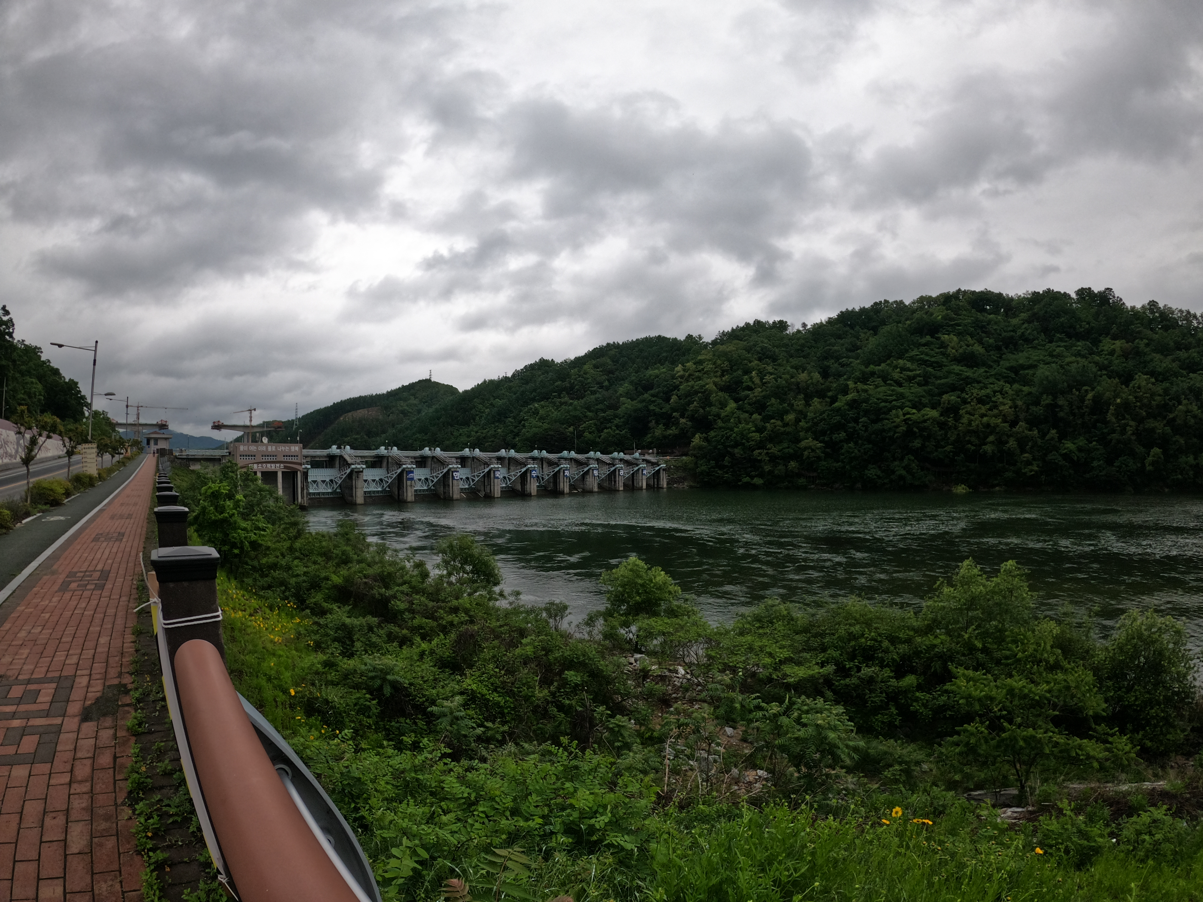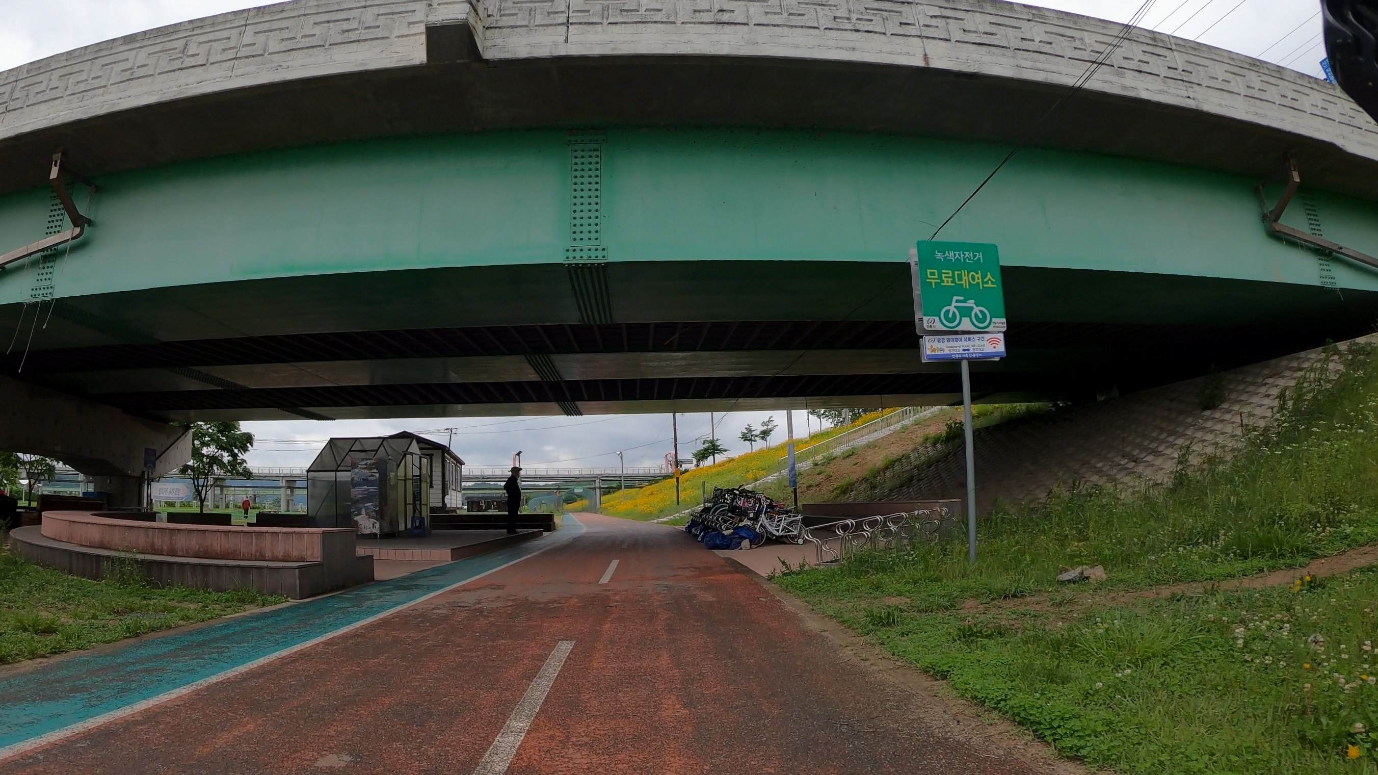 참고로 안동댐 인증센터에서 내려오다보면 위에서 말한 공사 구간에 도착하기 전에 왠지 인도로 올라가라고 하는 것 같은 곳이 있는데 무시하고 공원을 통해 진행하다가 다리(자전거 대여소)가 보이면 위로 올라가면 된다. 인도로 달리기에는 길이 너무 엉망으로 되어있다.