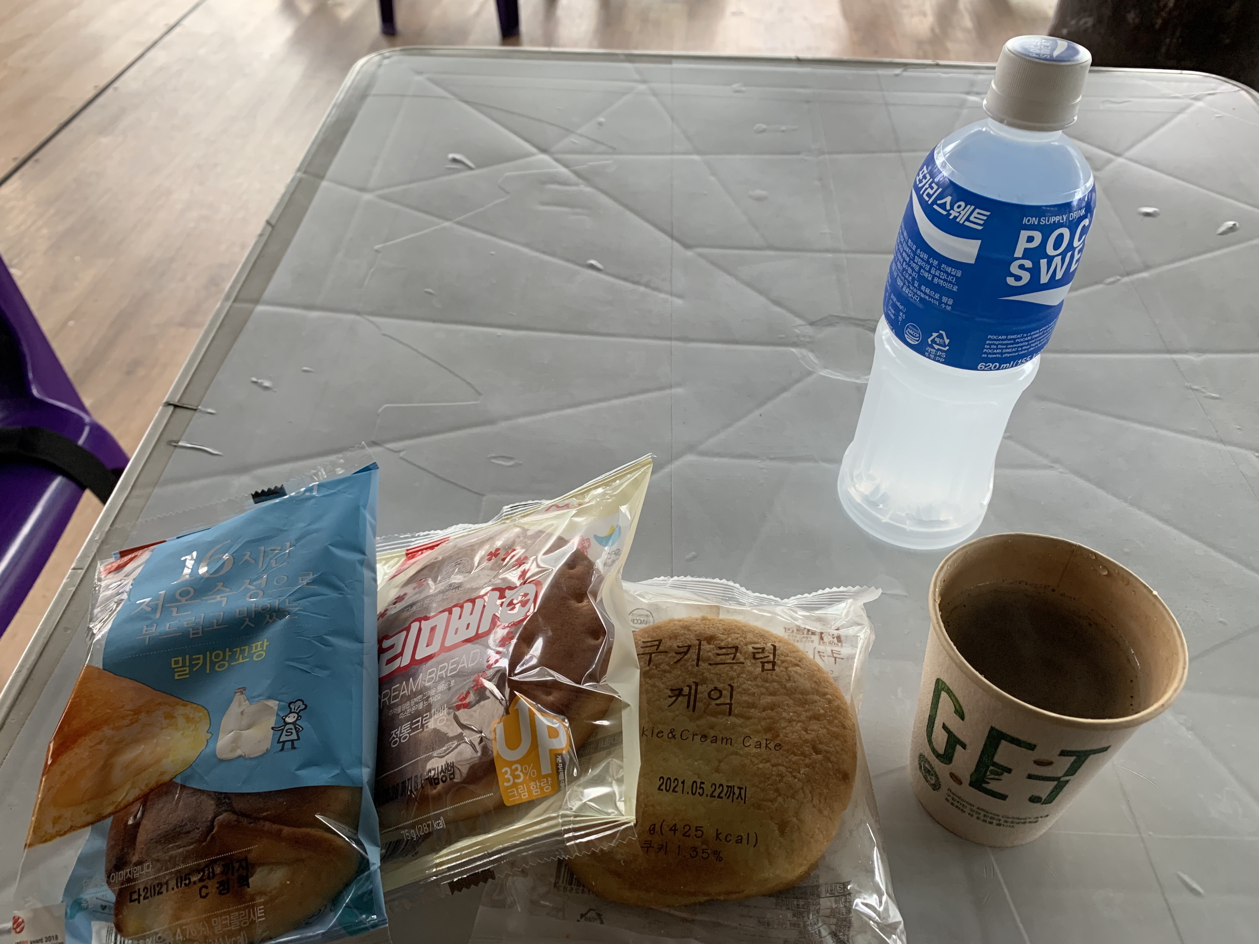 안동물문화관 바로 옆에 안동댐 인증센터가 있다. 인증샷 한 방 남겨주고 근처 편의점에 들러서 간단하게 빵과 커피 타임을 갖고 출발한다. 이 중에 크림빵만 바로 먹고 쿠키크림케익은 상주상풍교 인증센터에서, 밀키앙꼬팡은 다음날 아침으로 먹었다.