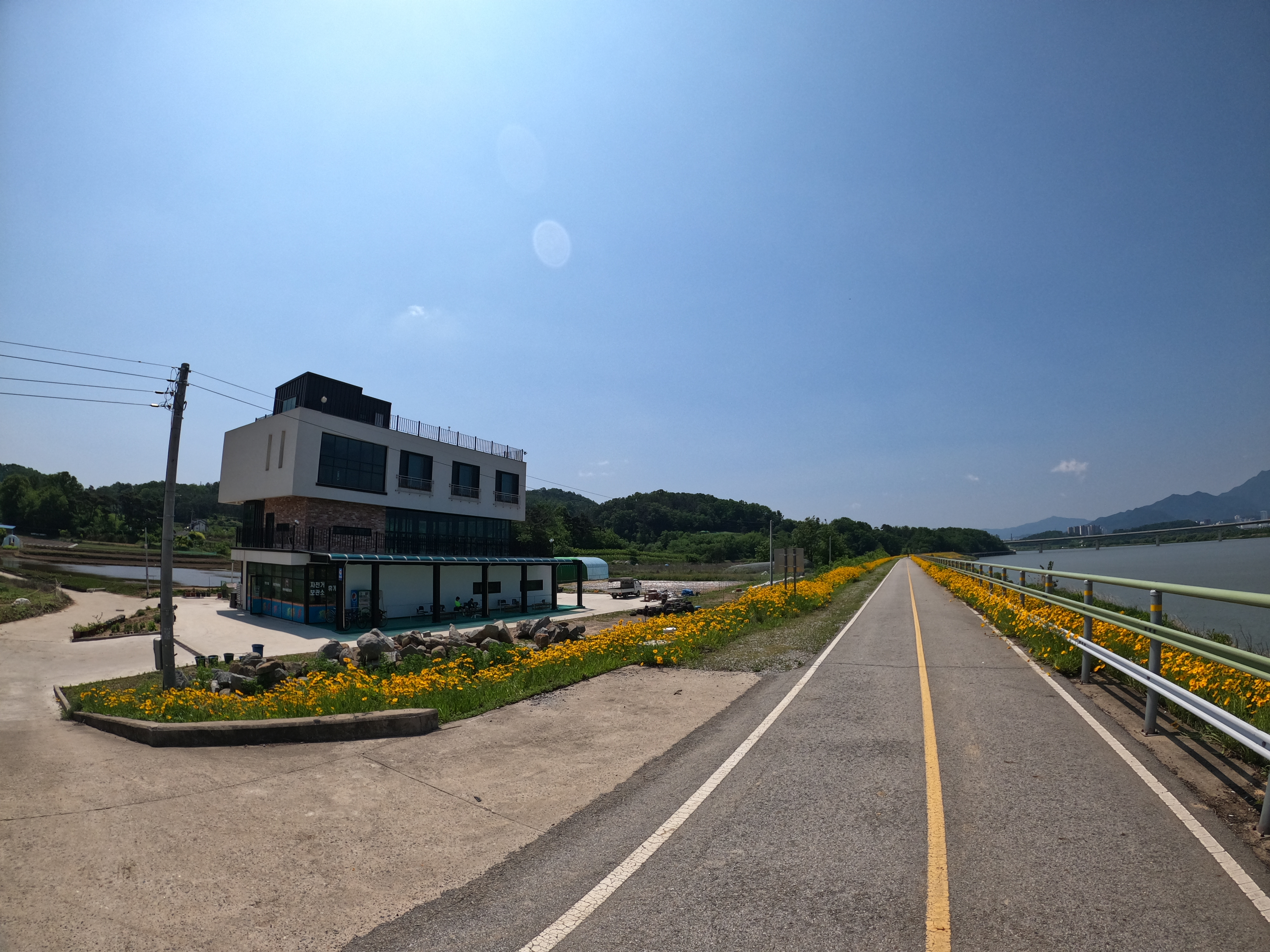 그리고, 네이버 지도 및 다음 지도에는 나와 있지 않지만 여기(지도보기)에 자전거 휴게소가 생겨있었다. 간단한 매점과 자판기가 있으므로 저녁 늦은 시간에 지나가더라도 보급이 가능할 것 같다. 아침에 먹은 빵 만으로는 부족하다는 생각이 들던 참이라 물도 채울 겸 컵라면을 하나 먹고 가기로 했다.