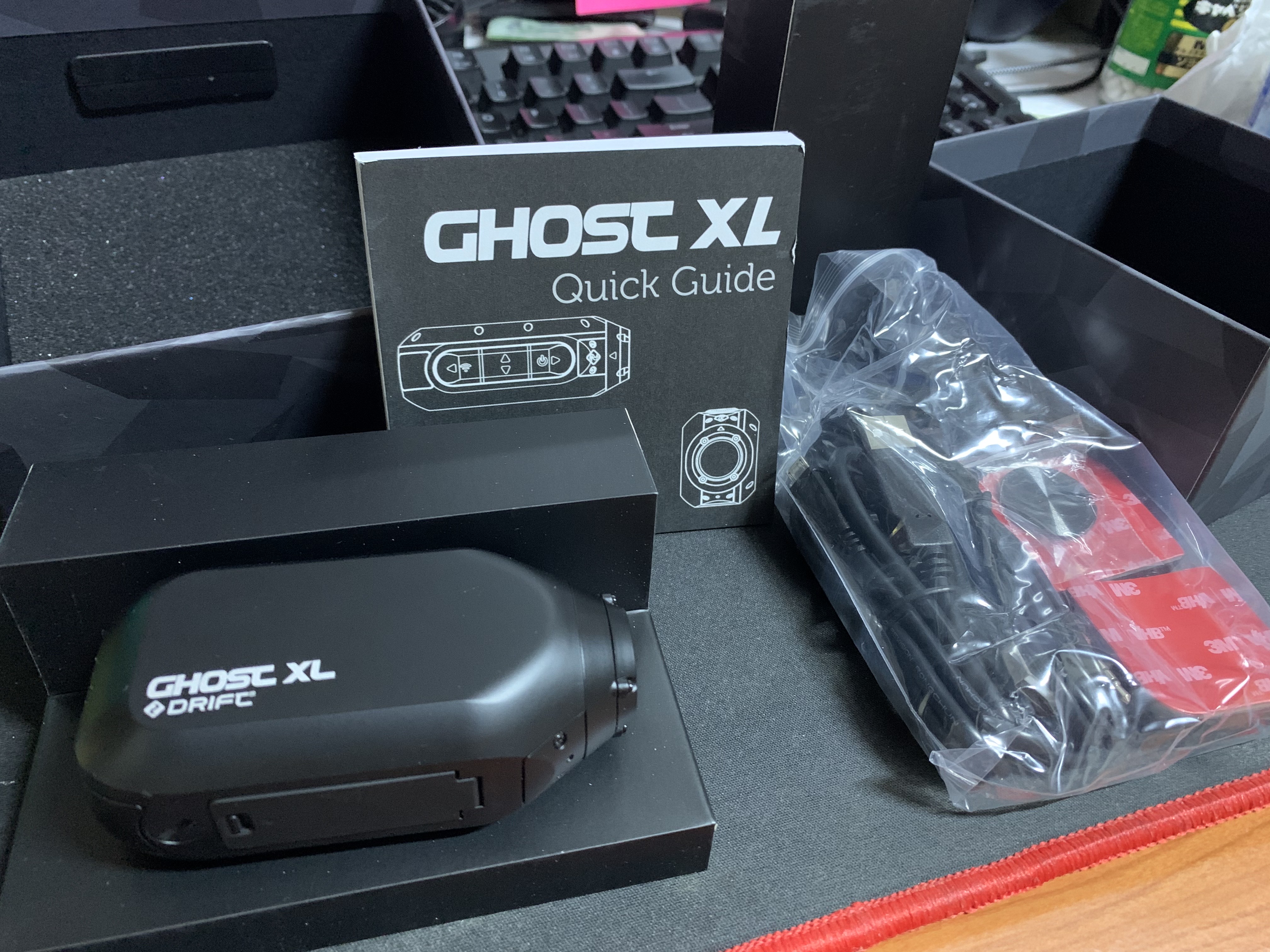 구성품은 군더더기 없이 본체, 설명서, 케이블, 3M 스티커 정도가 들어있다. 원래 Ghost XL 은 오토바이 라이더들이 헬멧에 붙이고 많이 사용하던 제품이지 자전거를 위해 나온 제품이 아니라서 그런가 자전거용 마운트는 들어있지 않다. 그래서 고프로용 마운트를 따로 11달러 주고 구매를 했는데 이 놈은 대체 언제 오는건지? 같은 날 구매 했는데 왜 따로 오냐?