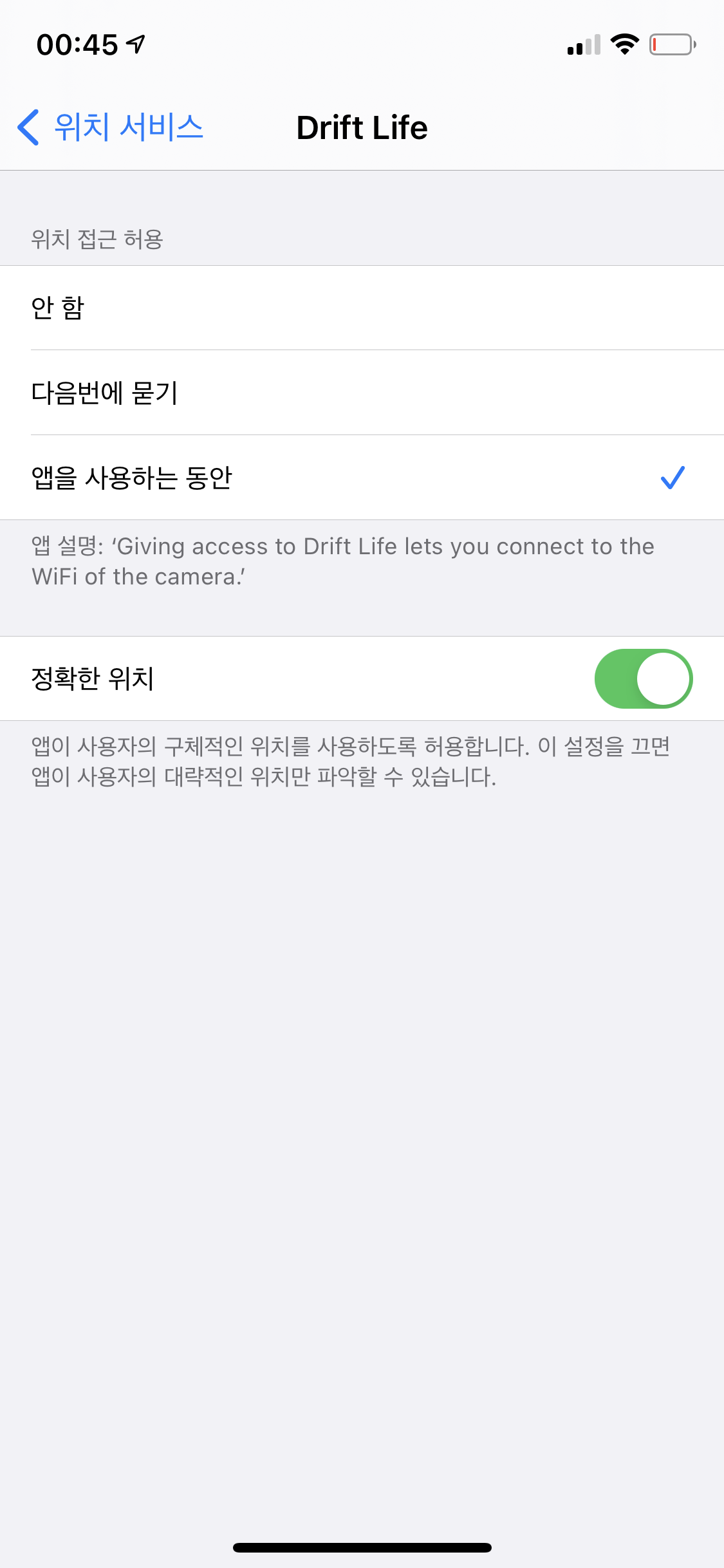 위와 같은 화면에서 다음 화면으로 넘어가지지 않는다. 다음 버튼이 눌리지 않아서 정말 얼마나 답답했던지! 와이파이를 수십, 수백 번을 연결해도 넘어가지지 않는 이 화면 때문에 진짜 짜증나 죽는 줄 알았는데 해결법은 의외로 간단하다. 위에도 적어놨듯이 설정에서 Drift Life 어플의 위치 사용을 허용해주면 된다.