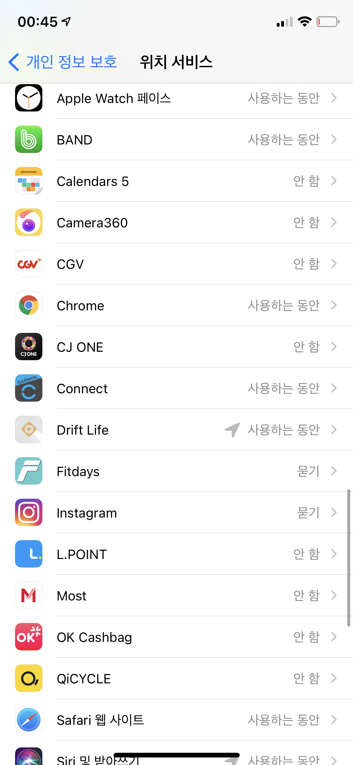 Drift Life 어플을 처음 실행할 때 위치 사용을 허용한 사람은 이런 증상이 없었을 것이다. 나처럼 일단 거부를 누르는 사람들만 이런 현상과 마주하게 되는데 위치 사용을 설정하려면 아래와 같은 순서대로 들어가면 된다.