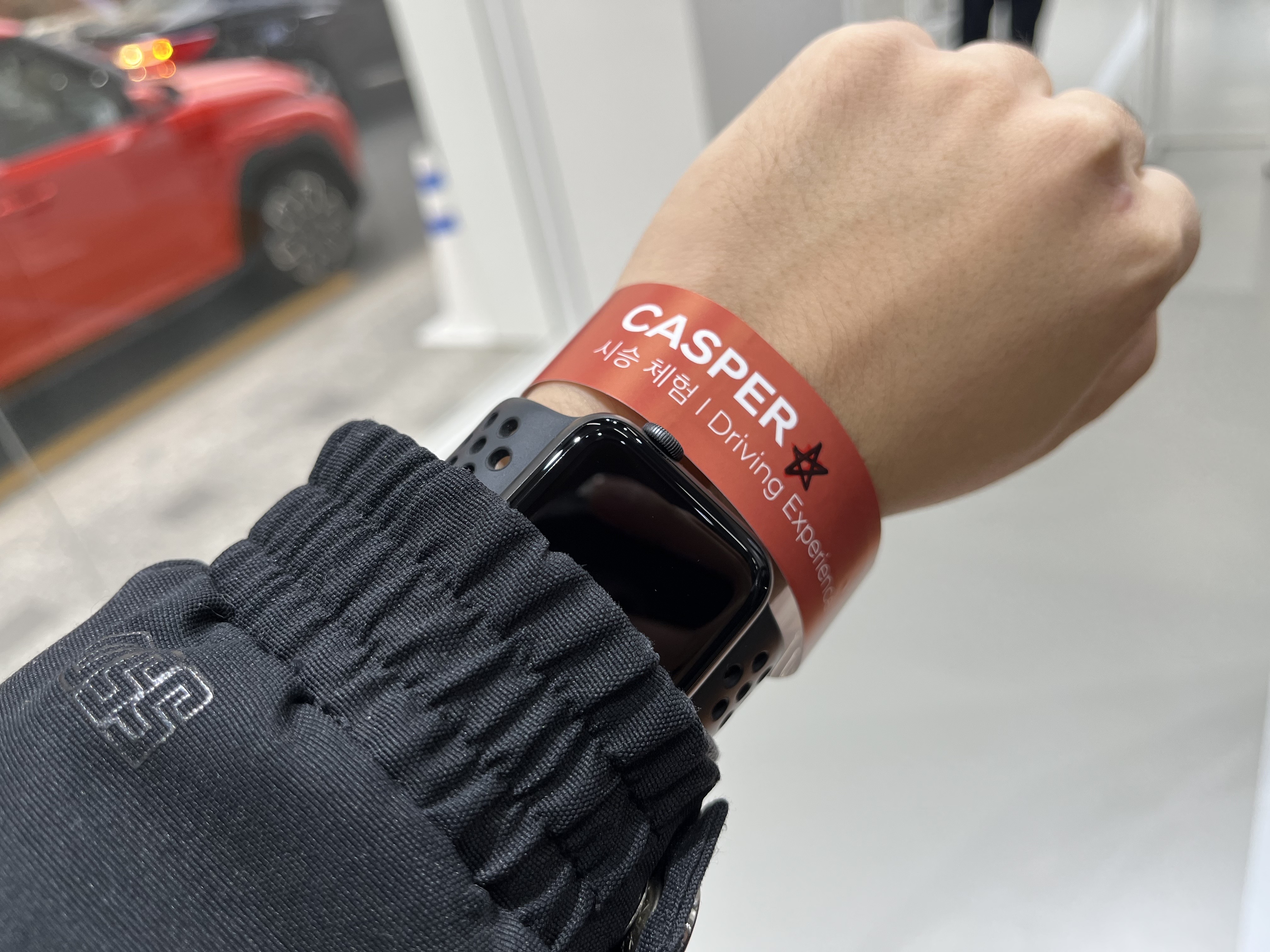 팔찌는 아니고 그 콘서트 입장 티켓 같은 종이 티켓이다. 왼팔에 워치가 있어서 오른팔에 차고 싶었는데 무조건 왼쪽에 해야 한다고 여직원이 그래가지고 왼쪽에 했는데 왼쪽에 하는 거하고 오른쪽에 하는 건 무슨 차이가...? 흠. 덤으로 내 키는 160cm 이니 왼쪽의 내 사진을 보고 캐스퍼의 높이를 가늠해보면 되겠다. 솔직히 170cm 이상은 힘들지 않을까?