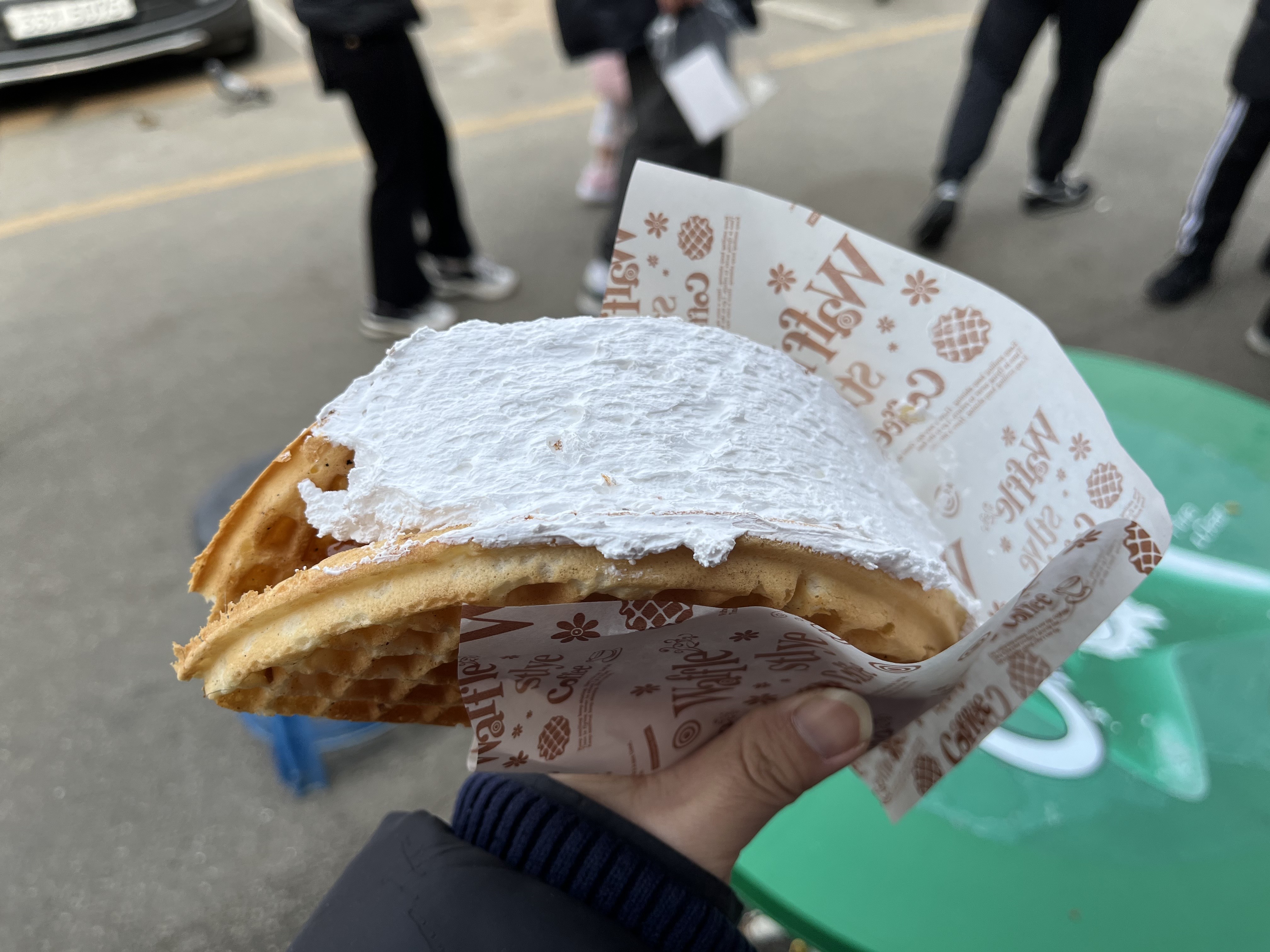 한 바퀴 둘러보고 주차장으로 돌아가던 길에 경원이가 옆자리 꼬마가 먹는 와플을 보고 와플에 꽂혀서 와플을 주문해서 먹었는데... 뭔가... 어... 음... 비쥬얼보다 생각보다... 맛은 개인간 차이가 있을 수 있으니 맛에 대한 평가는 남기지 않겠다. 하지만 경원이도 나와 비슷한 생각이었다는 사실만 남겨둔다.