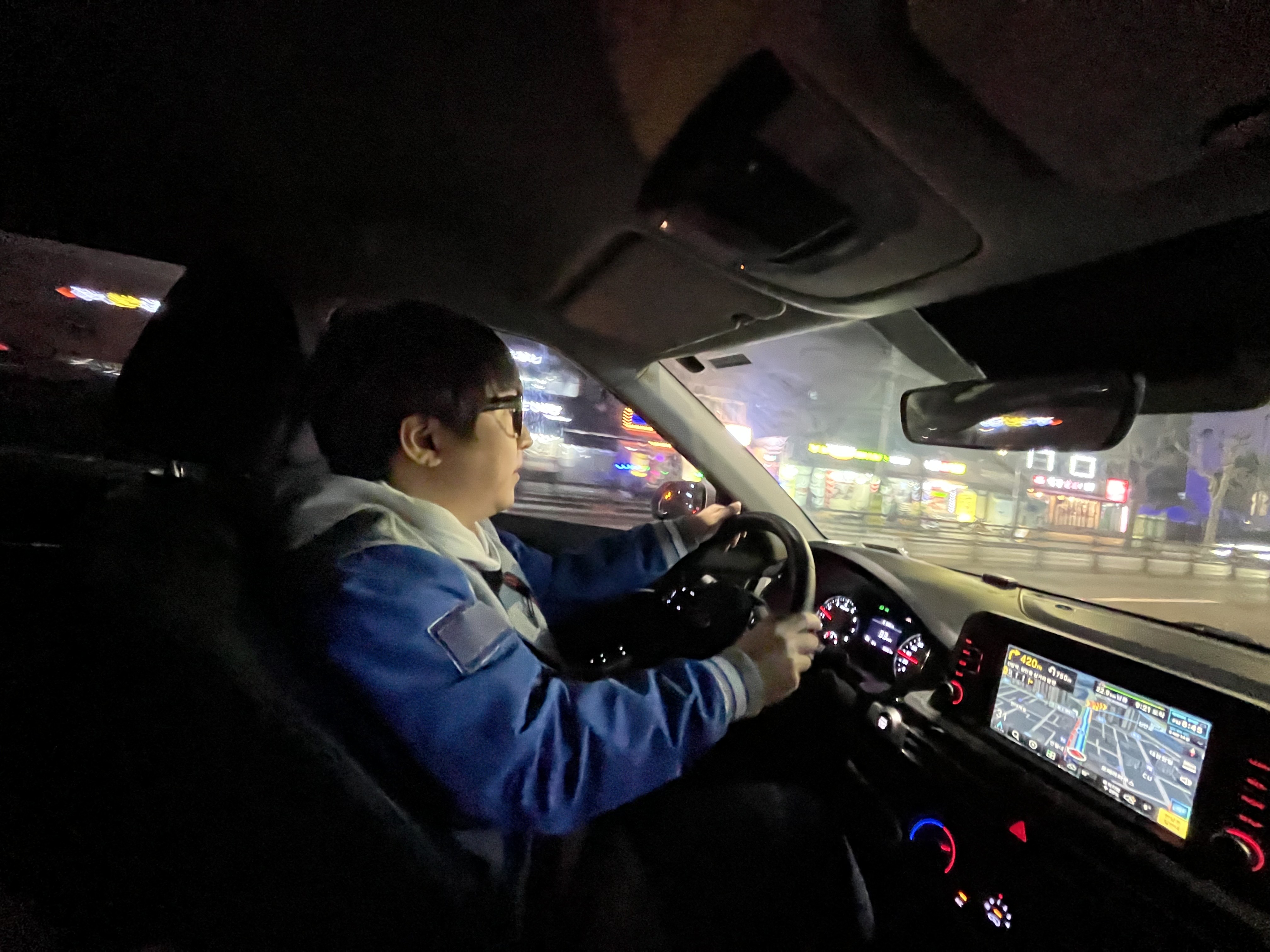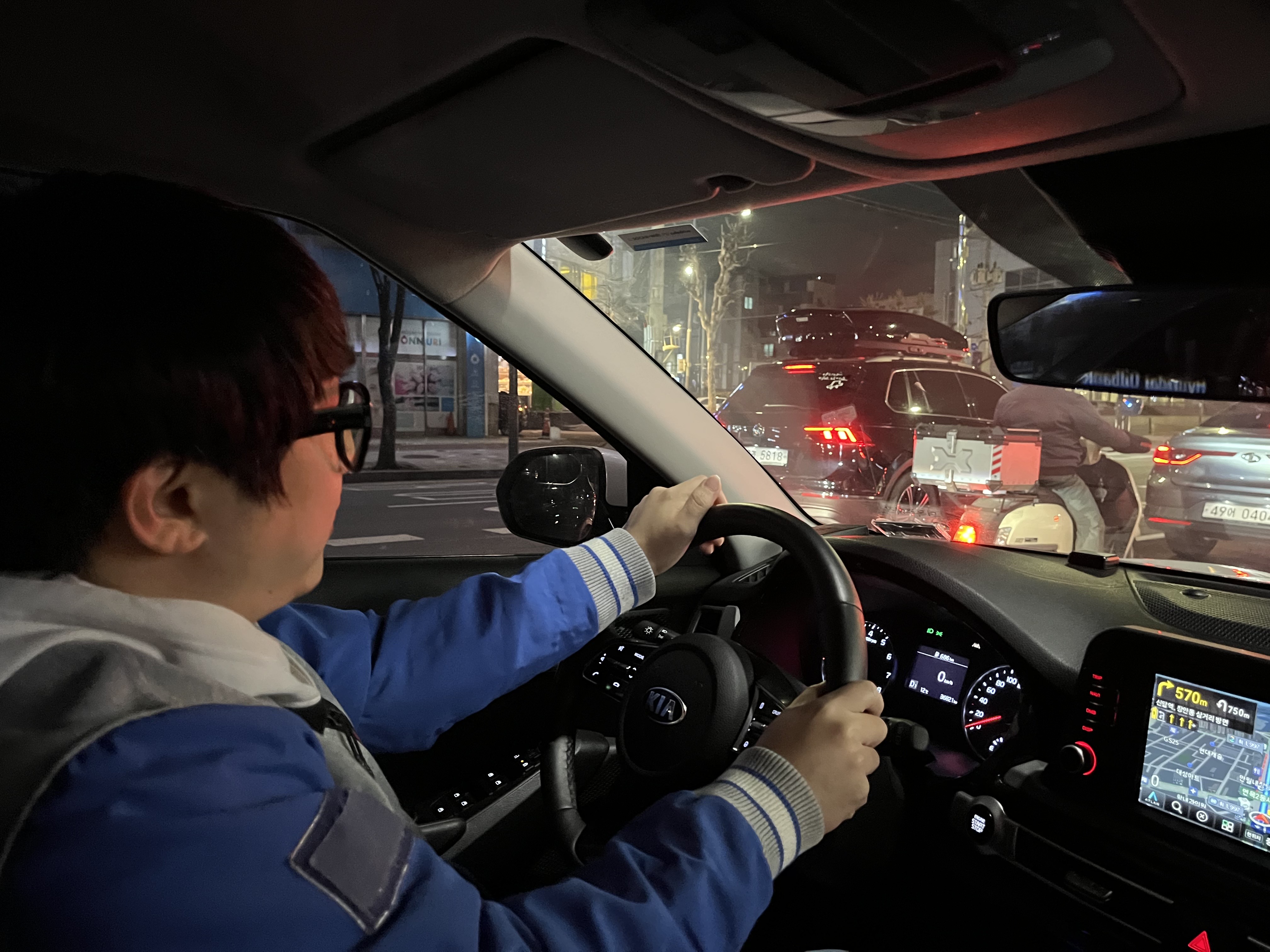 하여튼 초보운전의 야간운전 연수를 위해 주차장 밖으로! 주차장을 내려가면서 보니 브레이크가 상당히 부드러운 게 브레이크는 마음에 아주 쏙 들었다. 이 정도면 얼마든지 스무스하게 멈출 수 있지. 내가 비록 운전연수를 받는 초보운전이지만 브레이크는 잘 밟을 수 있다.