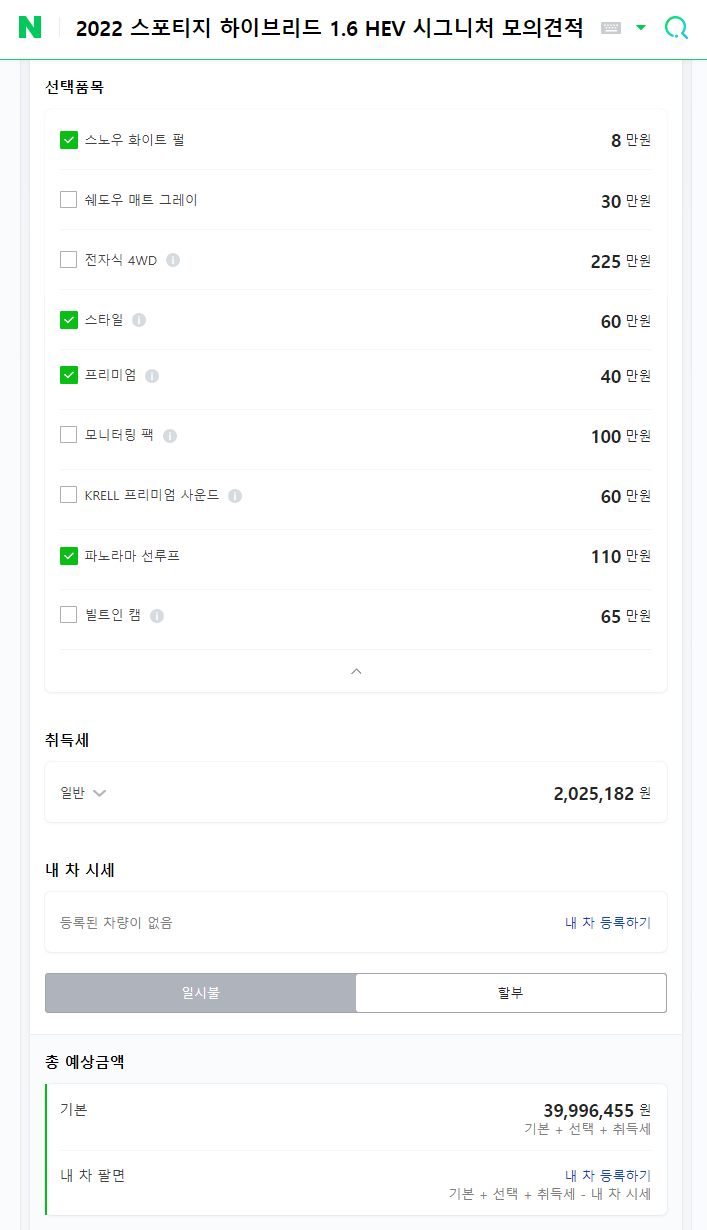 예를 들어 내가 계약한 스포티지 하이브리드 시그니처 모델로 비교를 해보도록 하자. 왼쪽은 네이버에서 낸 견적이고 오른쪽은 기아 공식 홈페이지에서 낸 견적이다.