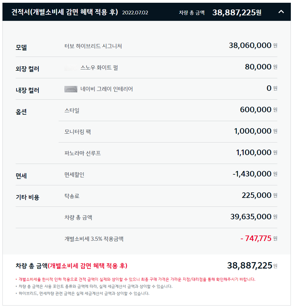 그럼 이제 여기에서 면세할인, 탁송료를 제외하고 현재 하이브리드 차량의 경우 개별소비세 할인이 적용되므로 747,775원을 제외하면 38,887,225원이 된다.