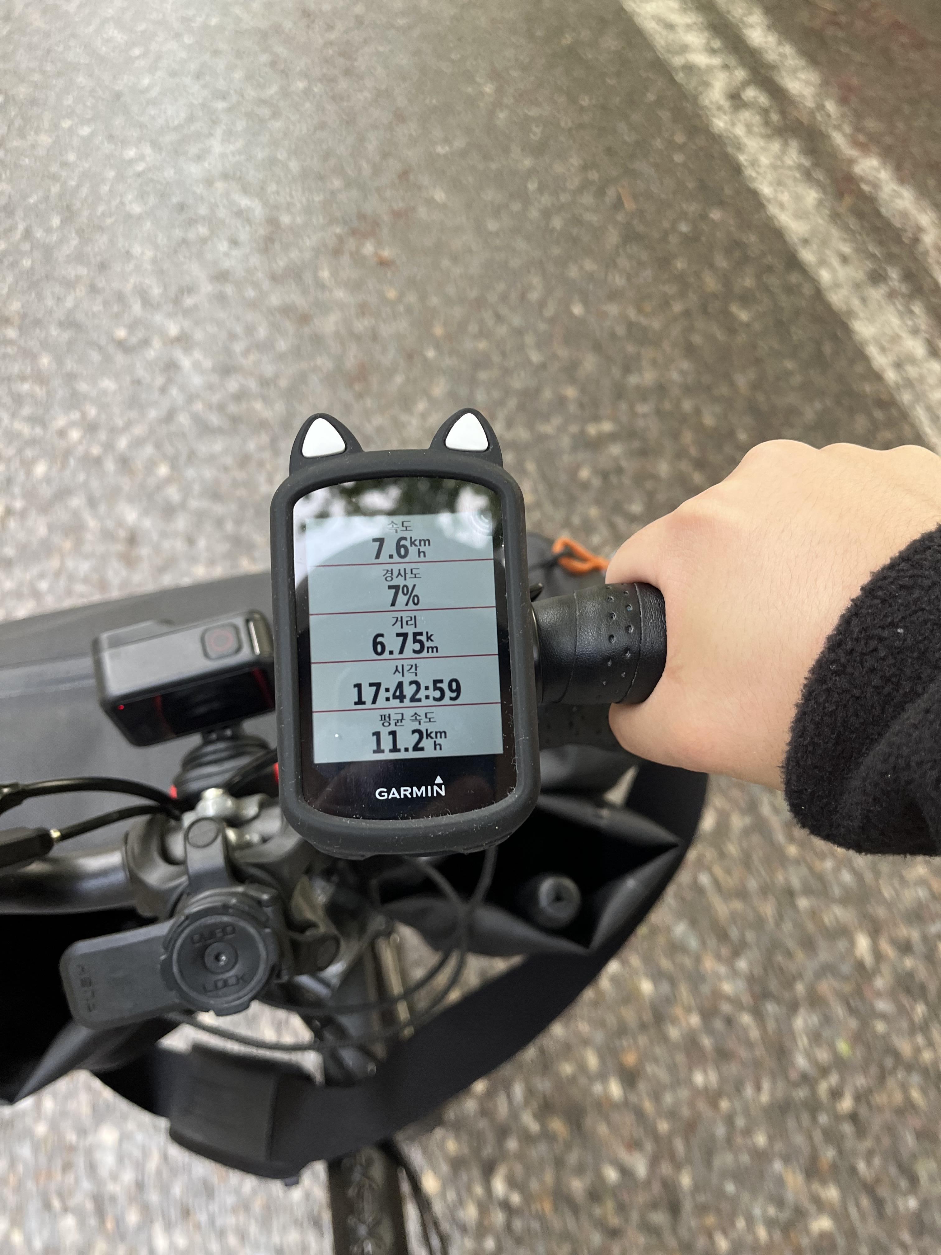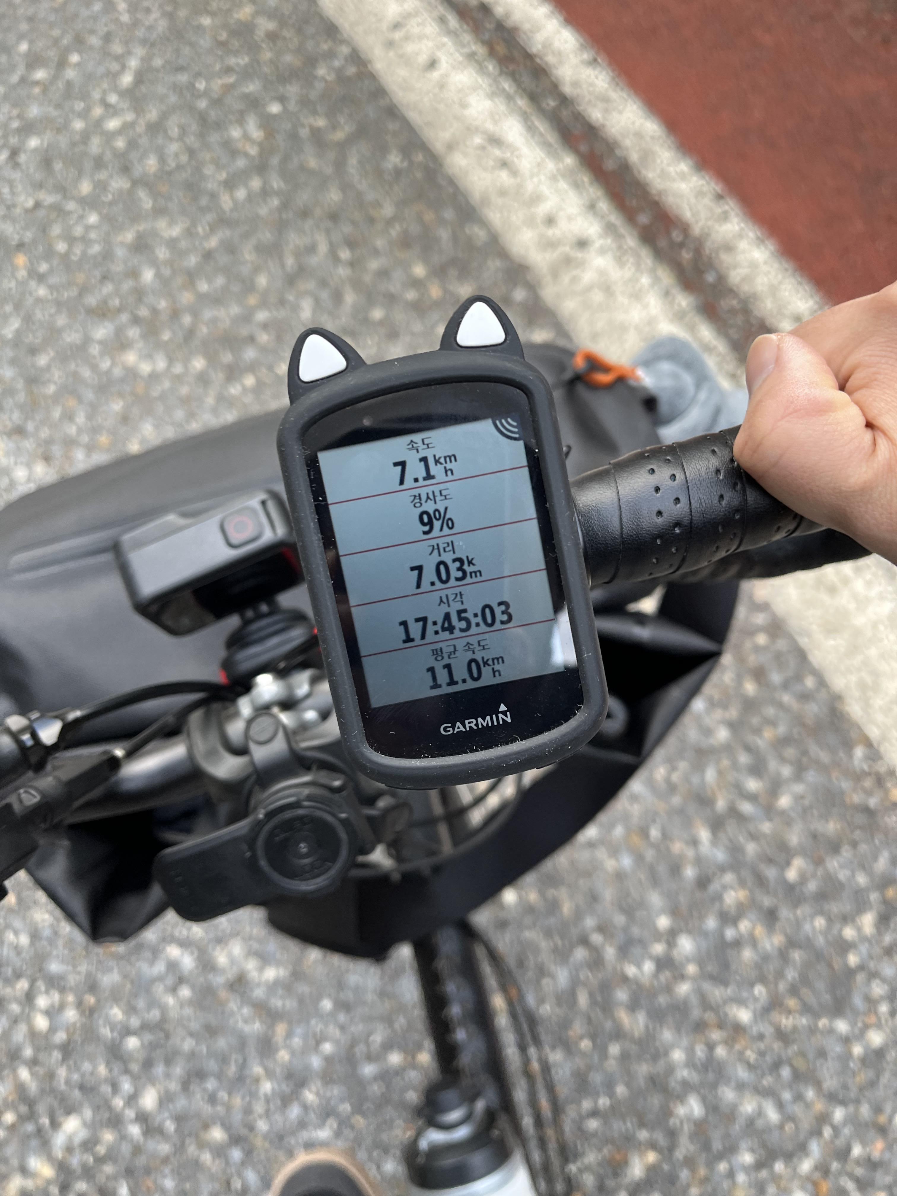 가민에 계속해서 찍히던 7% 와 9% 는 거짓말이 아닐까 싶을 정도로 너무나도 여유롭게 올라올 수 있었는데 어느 정도였냐면 자전거를 타고 올라오면서 카톡도 하고 전화도 할 수 있을 정도였다. 당연히 속도는 느렸지만 로드를 타던 때보다 훨씬 쉽게 올라온 기분이었다. 이게 바로 44T 체인링의 힘인가? 아니면 이거 설마 뒷바람이 밀어준건가?
