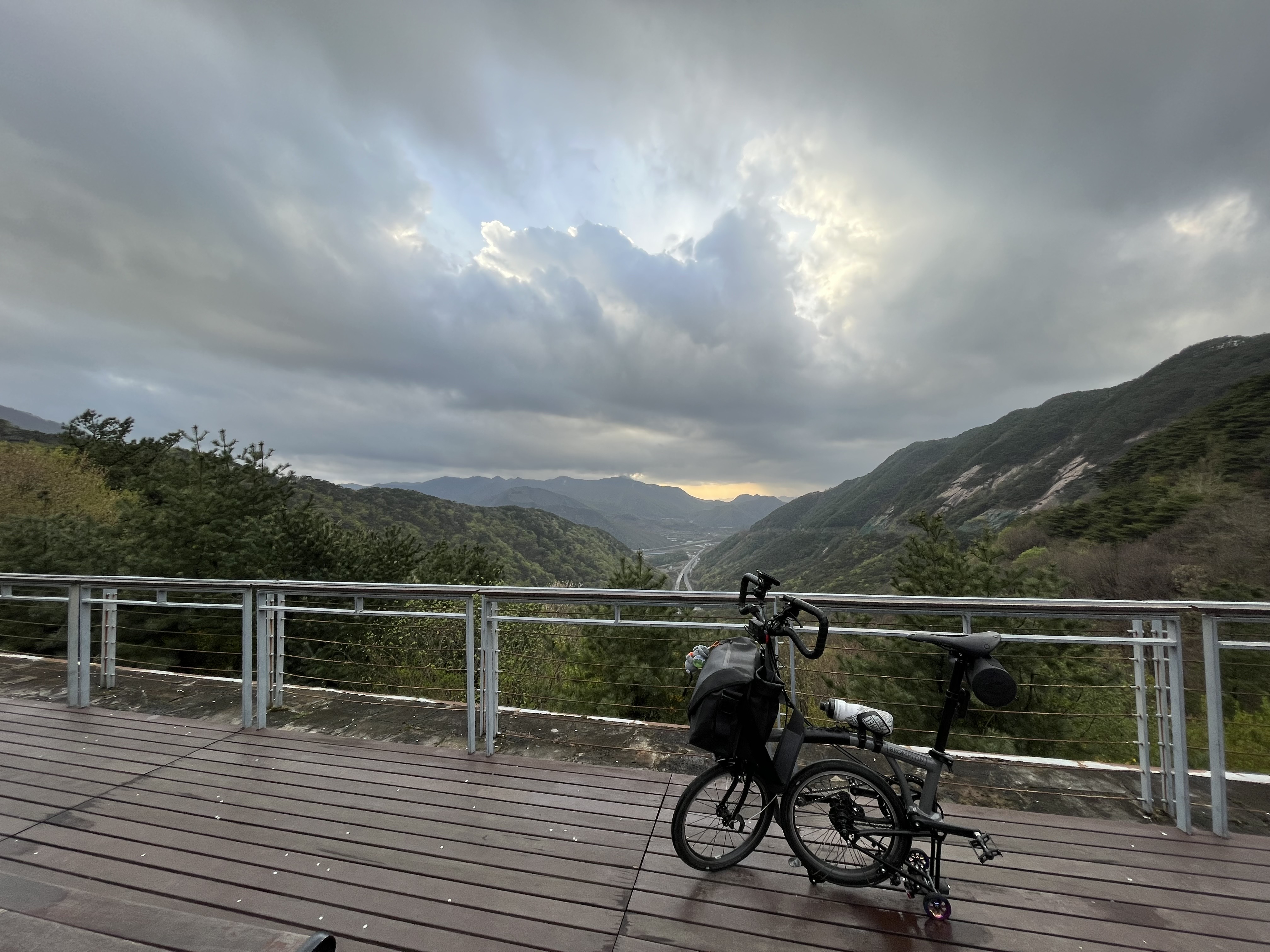 이화령도 올라가는 내내 바닥이 젖어있었지만 업힐을 하는 도중에는 전혀 걱정이 되지 않았다. 내 브롬톤 P라인에는 머드가드가 달려있기 때문이 아니라 어차피 천천히 올라갈 거라서 물이 튀길 염려가 없었다고 하는 게 맞겠다. 다운힐은 걱정이었지만...