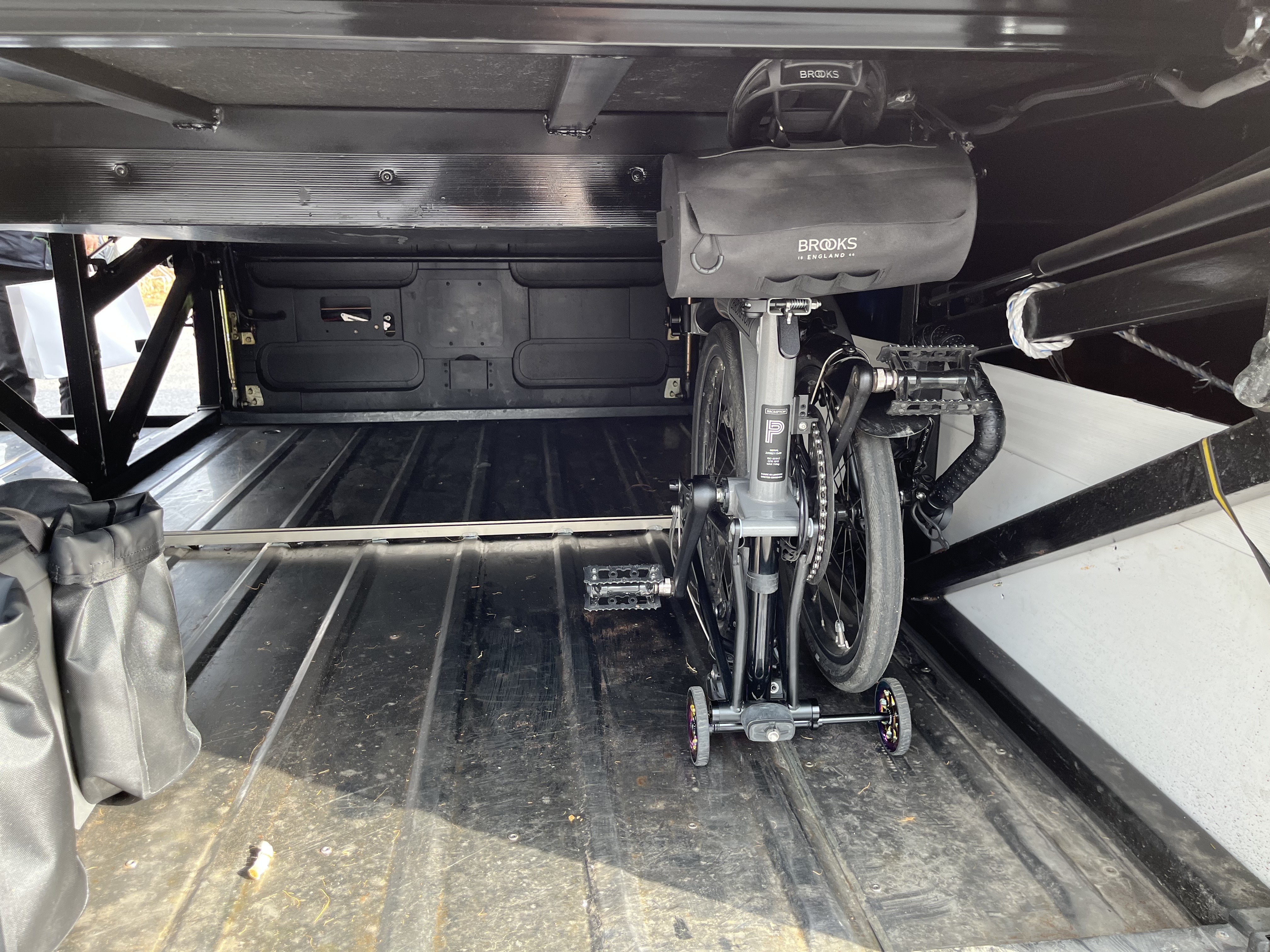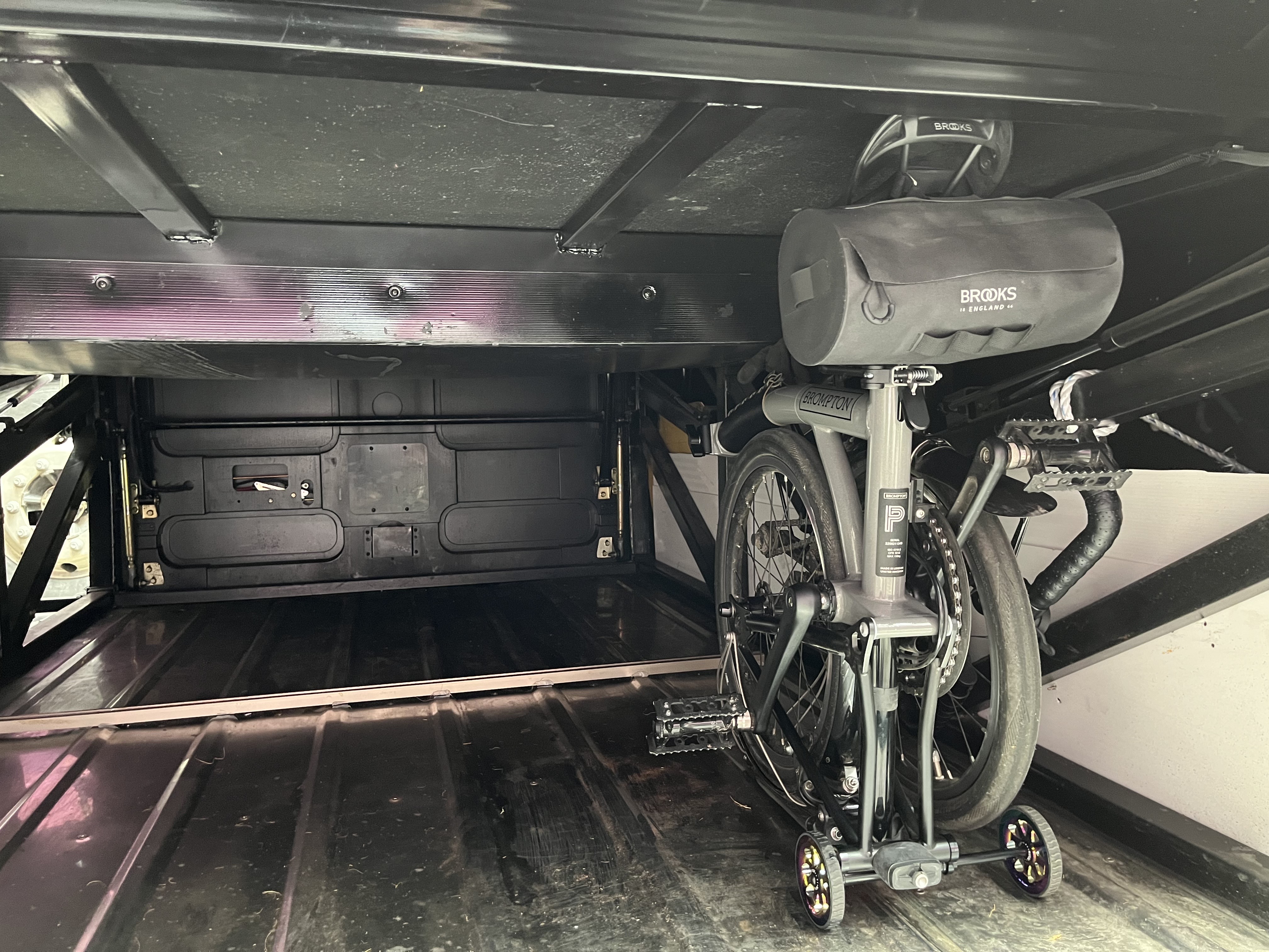 고속버스를 탈 때 짐칸에 브롬톤을 어떻게 넣어야 할지 고민이 되는 분이 있다면 위의 사진처럼 브롬톤을 세워서 넣고 싯포스트를 쭉 뽑아서 짐칸의 천장에 닿도록 해두면 된다. 주의할 점은 싯포스트를 뽑을 때 쭉쭉 힘을 줘서 뽑아야지 안장을 보호하겠다고 어설프게 걸쳐두면 넘어지기 때문에 주의하자.