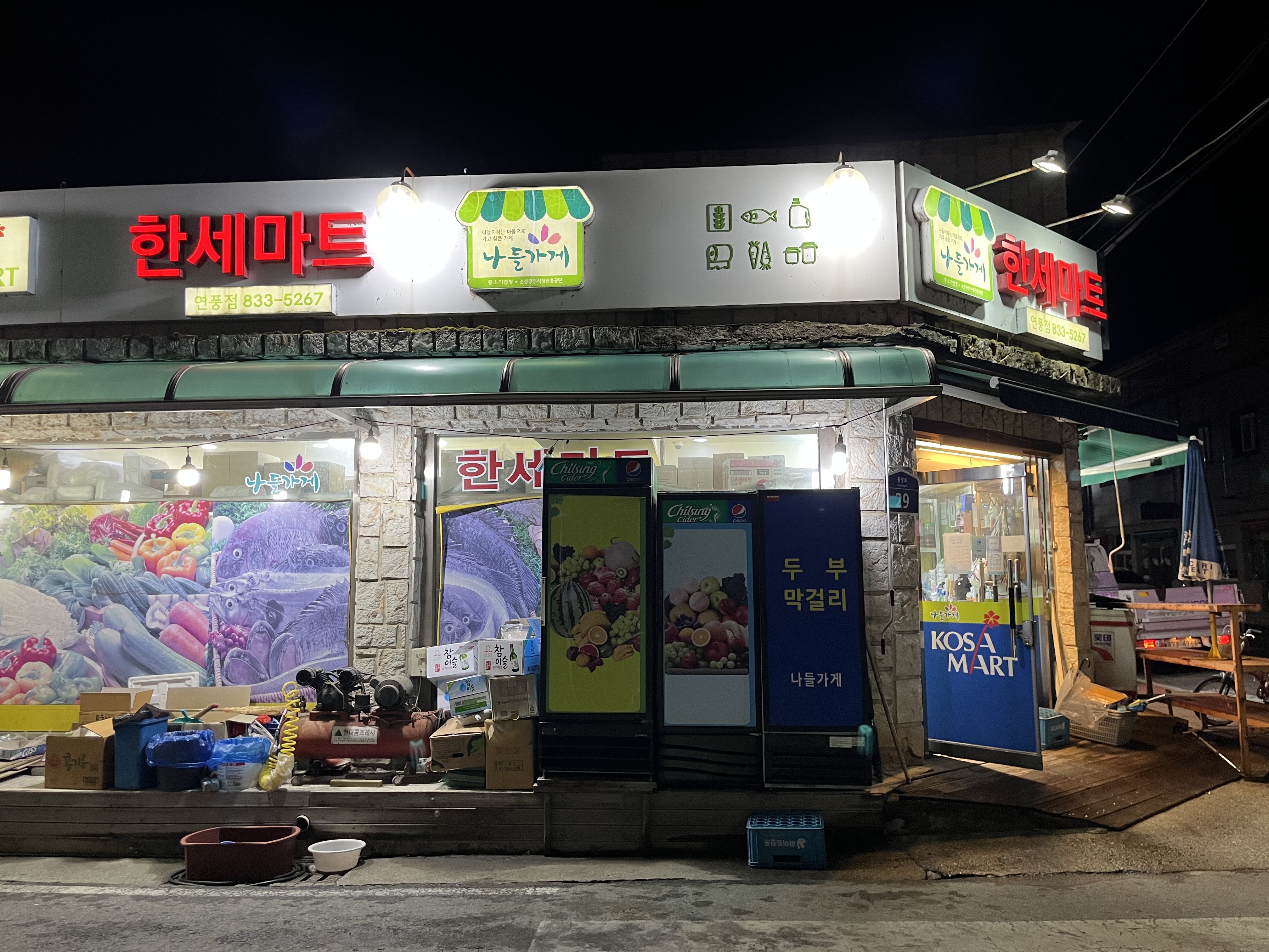 동네가 작다고 해서 마트가 이것만 있는 건 아니고 바로 옆에 코사마트도 같이 있다. 한잔님이 지도로 찾아봤을 때 무슨 동네에 편의점이 하나도 없어서 보급을 못 할까봐 괴산터미널에서 이것저것 엄청 많이 사왔는데 마트가 있을 줄 알았으면 괜히 사왔다고 하셨다... ㅋㅋ