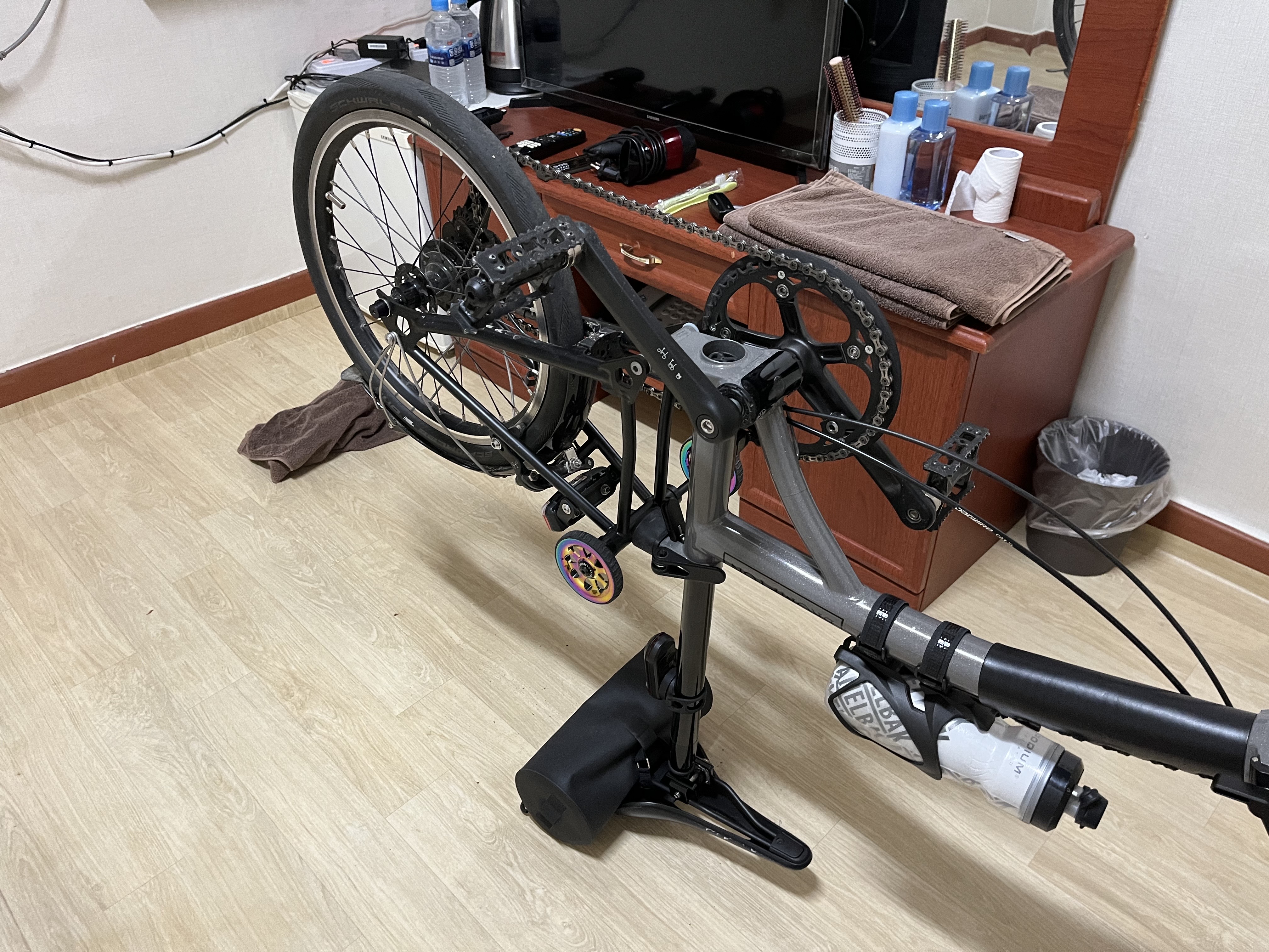 그래도 넘어지지 않을까 걱정이 되시는 분은 보통 브롬톤을 타시면 프론트 가방을 달고 다니실텐데 가방으로 앞으로 구르지 못하도록 막아두면 조금 더 안정적으로 세워둘 수 있다. 나는 프레임만 멀쩡하면 나머지 부품들은 얼마든지 교체가 가능하다고 생각하는 주의라 그렇게까지 막 하나하나 보호를 하지는 않았다.