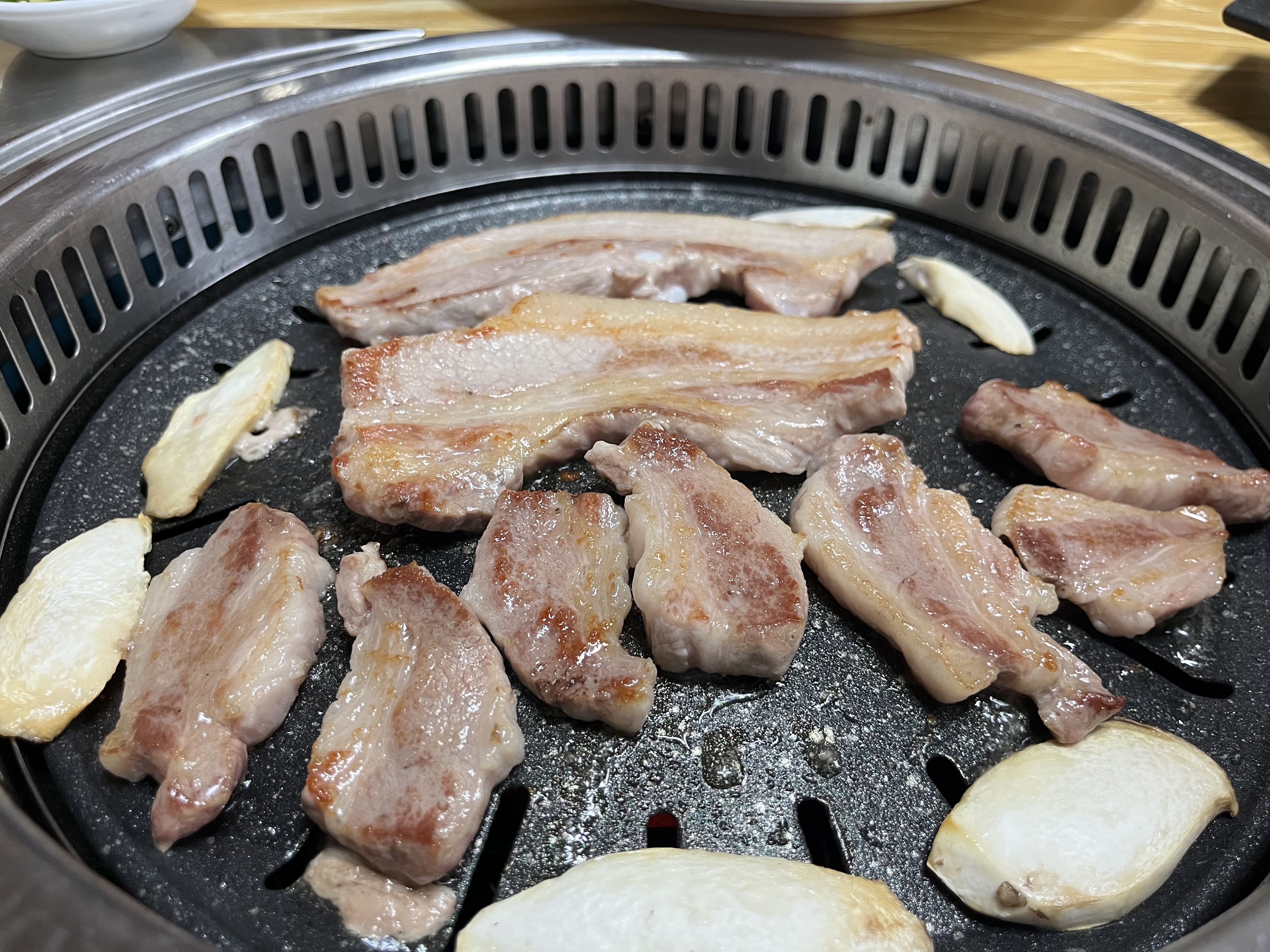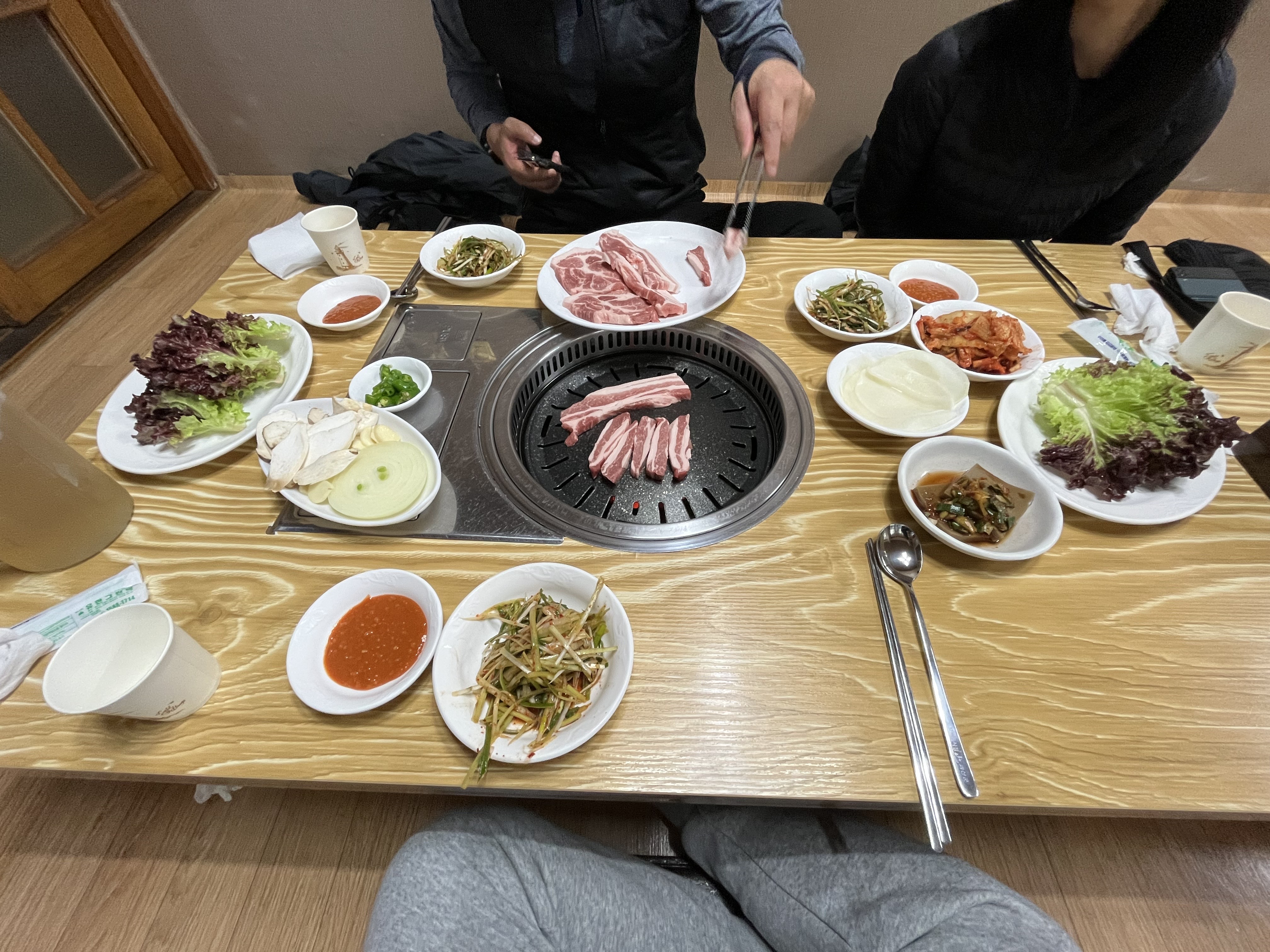 새재파크에 자전거를 가져다두고 다시 식당에 도착하니 마침 타이밍 좋게도 바로 음식이 나오기 시작했다. 가격표를 보니 생각보다 저렴한 가격에 생각보다 양이 많았는데 고기의 퀄리티는 생각보다 너무 좋아서 내가 살면서 먹어본 삼겹살 중 두 번째로 맛있었다고 해도 과언이 아닐 정도였다. 한잔님이 고기를 너무 잘 구워주셔서 그런가...? ㅋㅋ