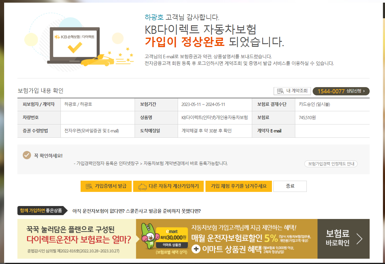 보험가입은 한 군데에서만 딱 조회해서 가입하지 말고 여기저기 보험사에서 보험료를 조회해본 후에 가입하는 것이 좋다. 내 경우에는 KB보험이 가장 저렴해서 KB보험으로 진행하기로 했다. 이것도 딜러를 통하면 편할텐데 조금이라도 보험료를 아껴보려고 다이렉트를 통해 보험 가입을 진행했다.