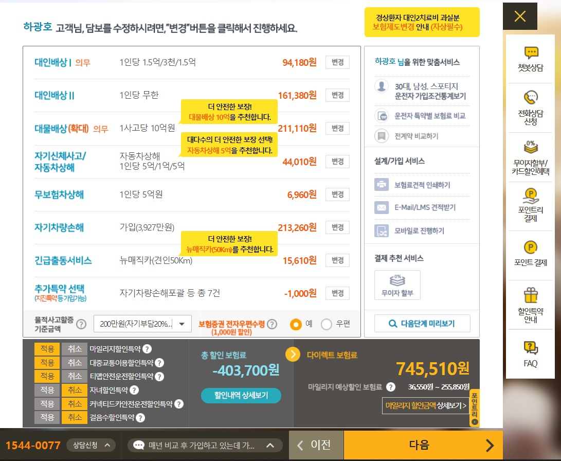 담보는 그냥 첫 차이기도 하고 초보운전이기도 하니까 제일 보장금액이 큰 것들로만 선택했다. 대인배상 무한, 대물배상 10억원, 자동차상해 5억, 무보험차상해 5억, 견인 50km 면 보험 때문에 걱정할 일은 없을 듯 하다.