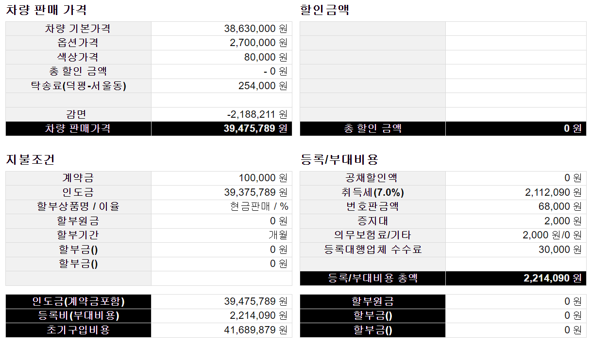 차량 금액을 결제하면 견적서에 있는 등록/부대비용을 결제해야 하는데 이것도 카드로 가능하다고 하는데 카드로 어떻게 하는지 몰라서 나는 그냥 현금으로 결제를 했다. 쉽게 말해서 취등록세인데 이것도 딜러가 계약금을 받았을 때처럼 개인 계좌로 달라고 하는 거 아냐 하고 무한 의심을 품었는데 이번엔 기아 공식 계좌를 안내해줘서 해당 계좌로 입금을 했다.