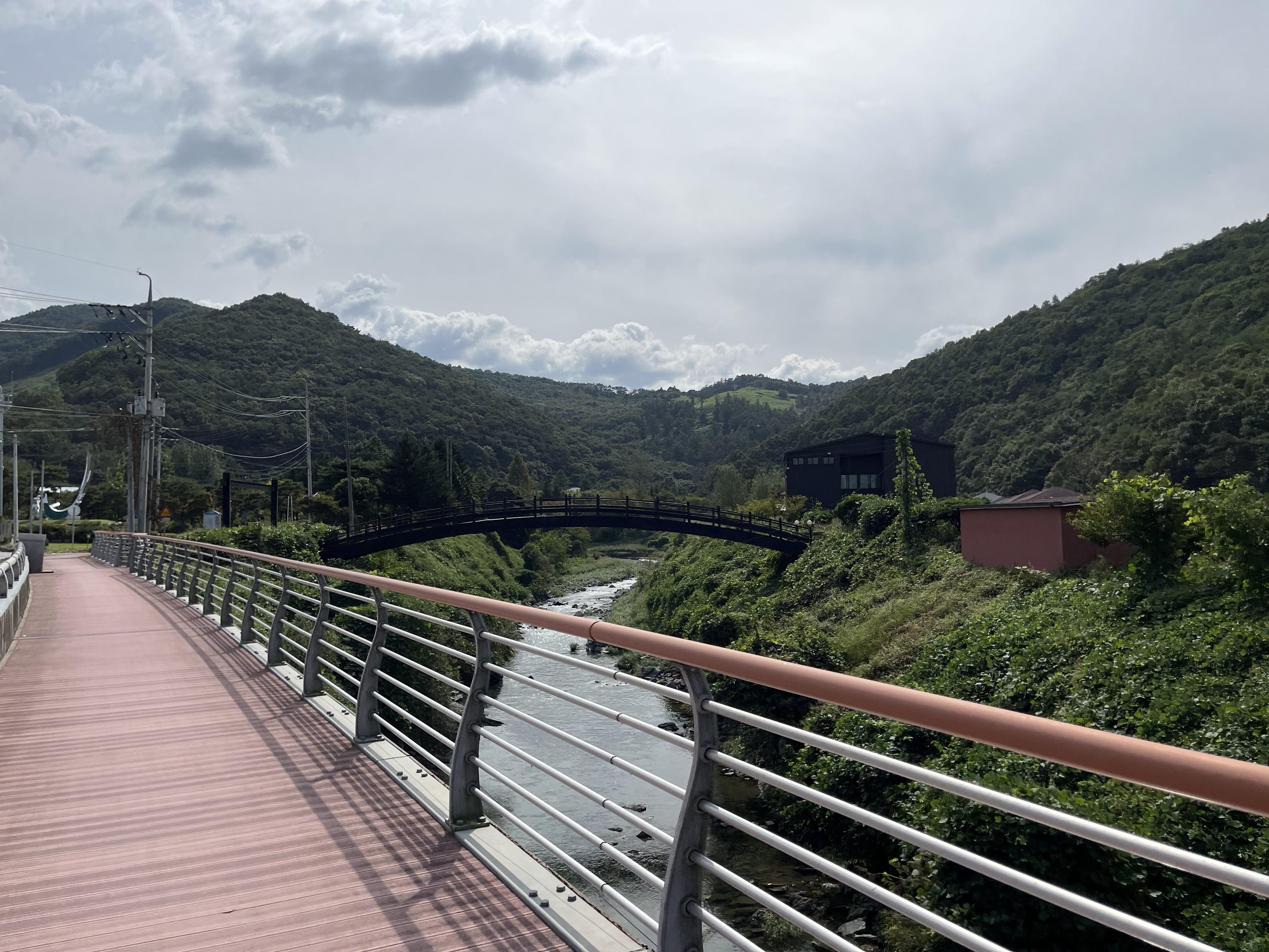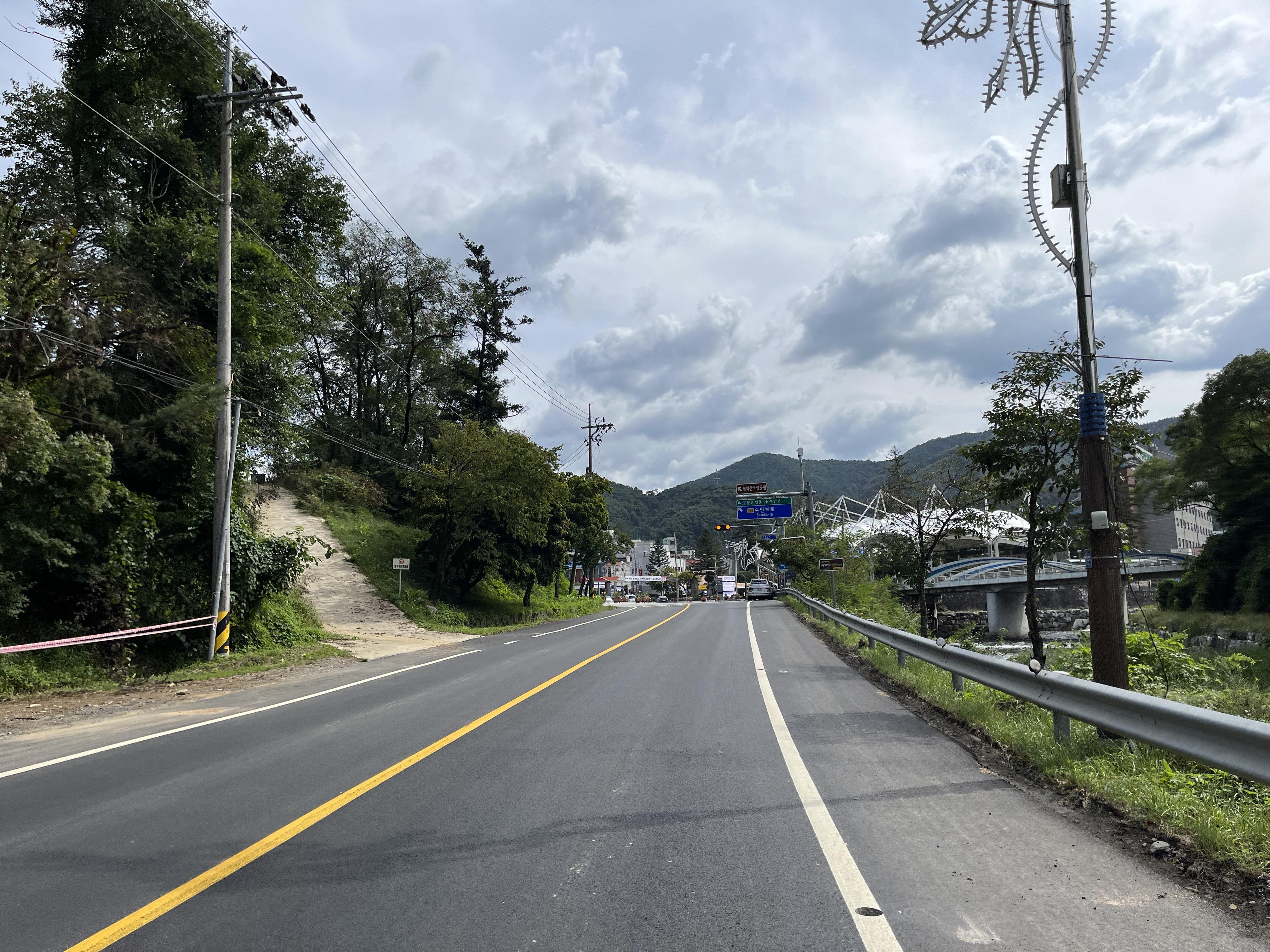 풍경 포인트에서 출발해서 달리다보면 누리끼리한 건물이 하나 나오는데 이 건물 앞에는 자판기가 있어서 음료를 보급할 수 있다. 아마 온천이니까 건물 안에 매점이나 식당도 있을 것 같기는 한데 굳이 들어가보지는 않았다. 예전에도 여기에서 콜라를 하나 마셨었는데 그렇게 기분이 좋았었지...