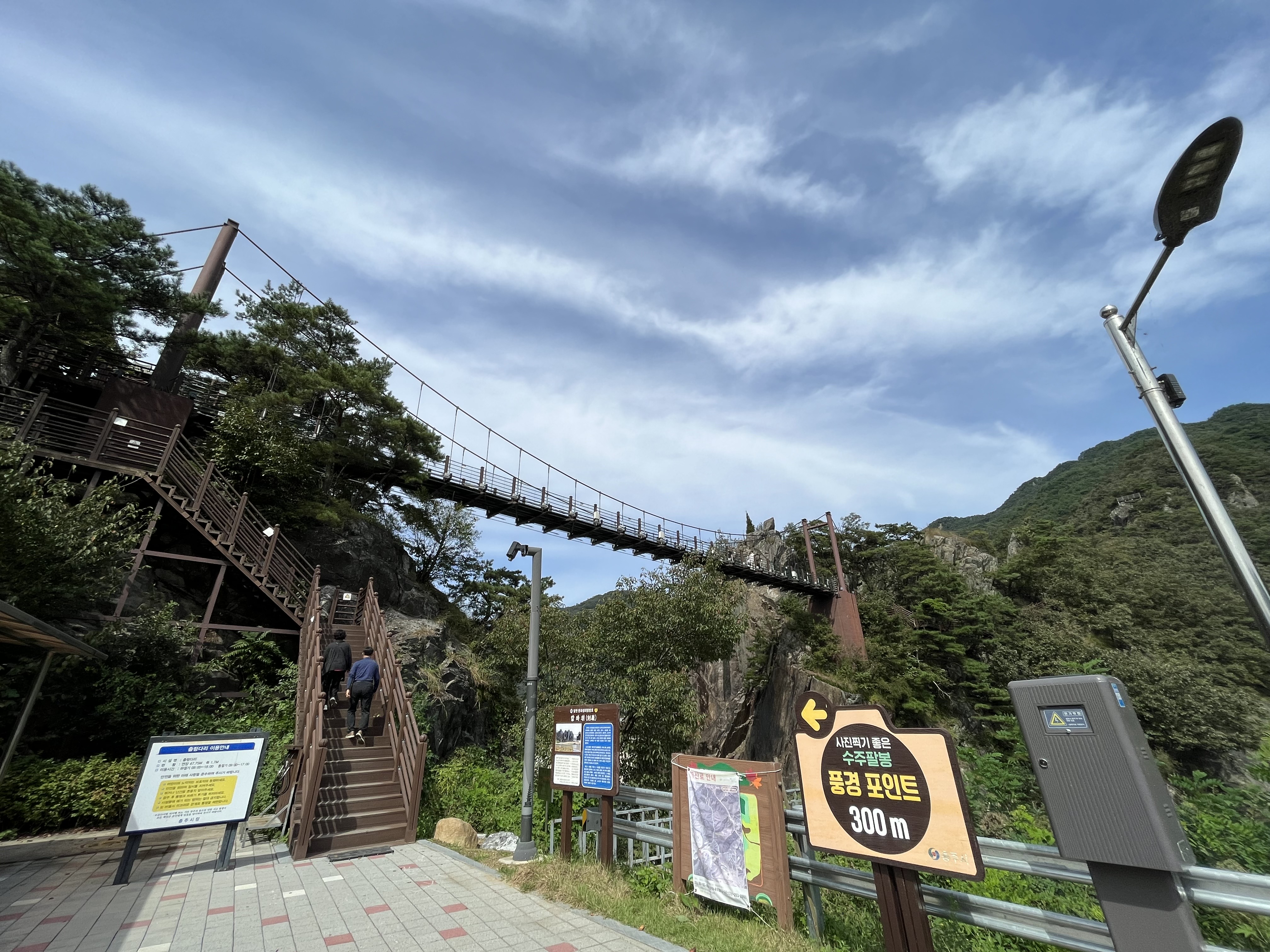 도로 옆에 마련된 자전거길을 따라서 계속 나아가다보면 글램핑, 캠핑으로도 유명한 팔봉 유원지가 나오는데 팔봉 유원지를 출발해서 조금만 더 가면 이렇게 출렁 다리가 있는 풍경 포인트도 나온다. 여기에서 충주에서 만났던 외국인 부부를 다시 만나서 약간의 대화 후 같이 사진도 한 방 남기고 헤어졌다.