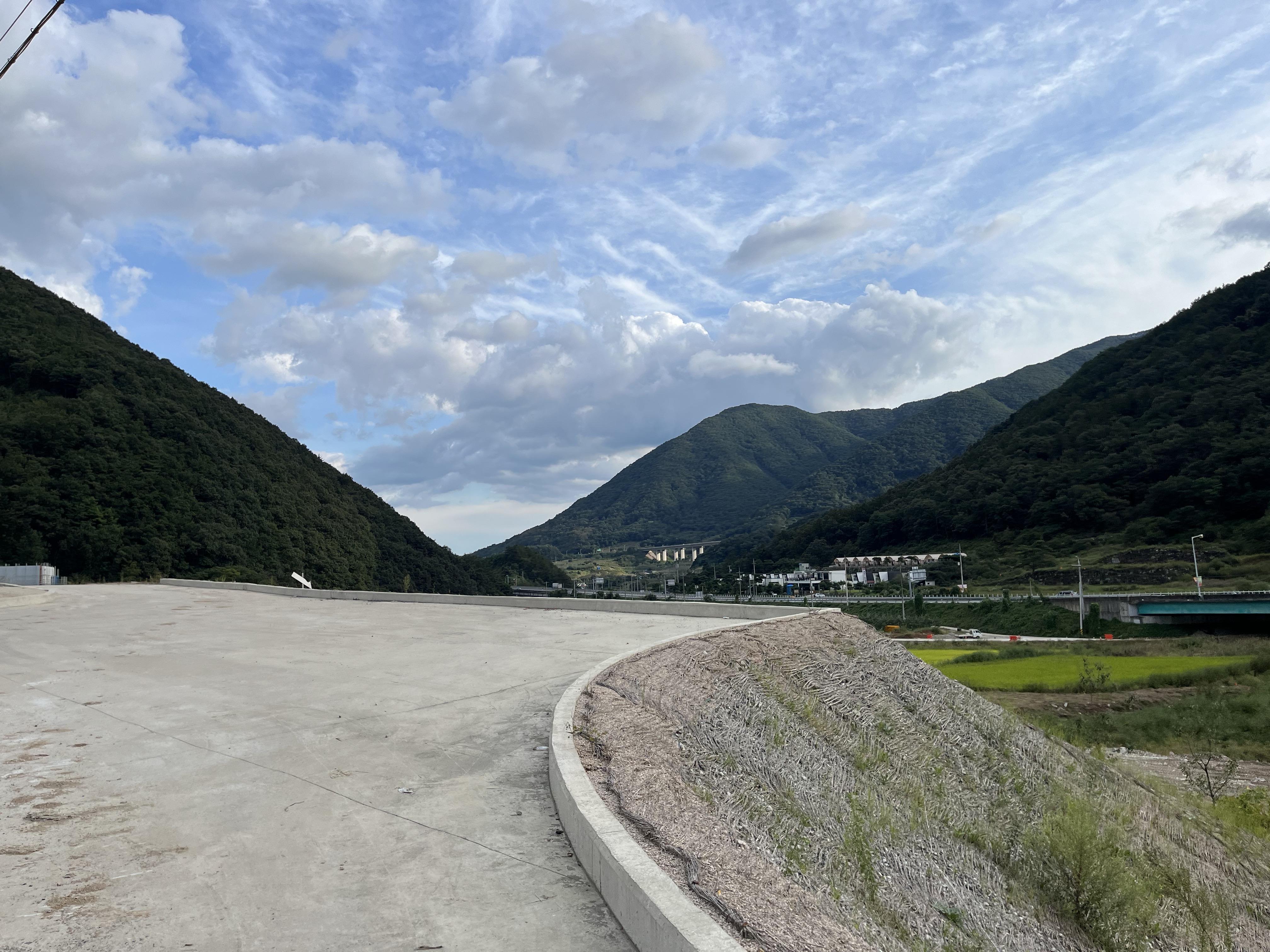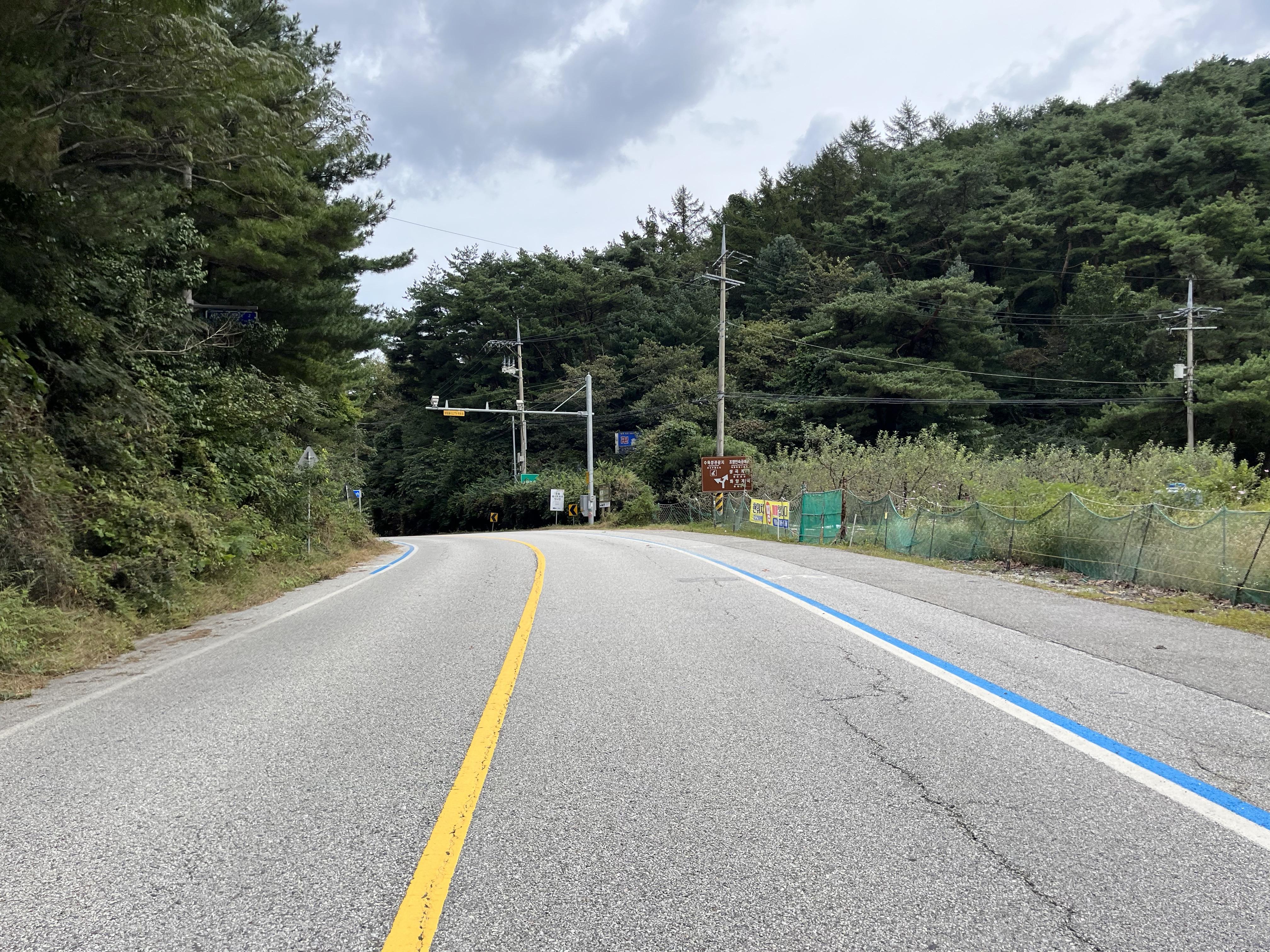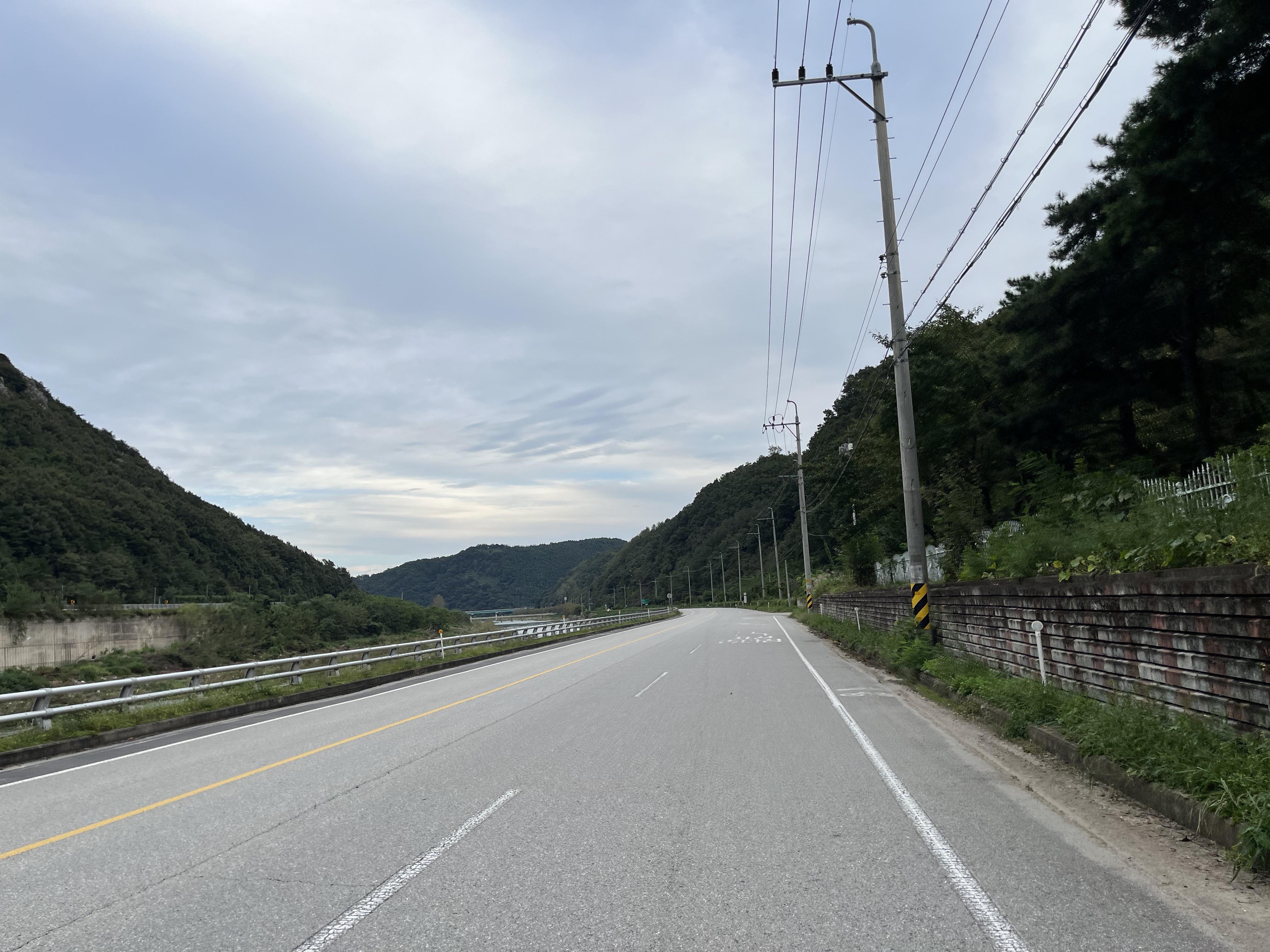그리고 내 새재 자전거길 종주 후기마다 등장하는 아래 도로... 여기는 왜 이렇게 웅장한 느낌이 드는지 모르겠다. 산세에 파묻히는 느낌의 모양이라서 그런가? 여기를 지나갈 때마다 기분이 너무 좋은 건 나만 그런가?