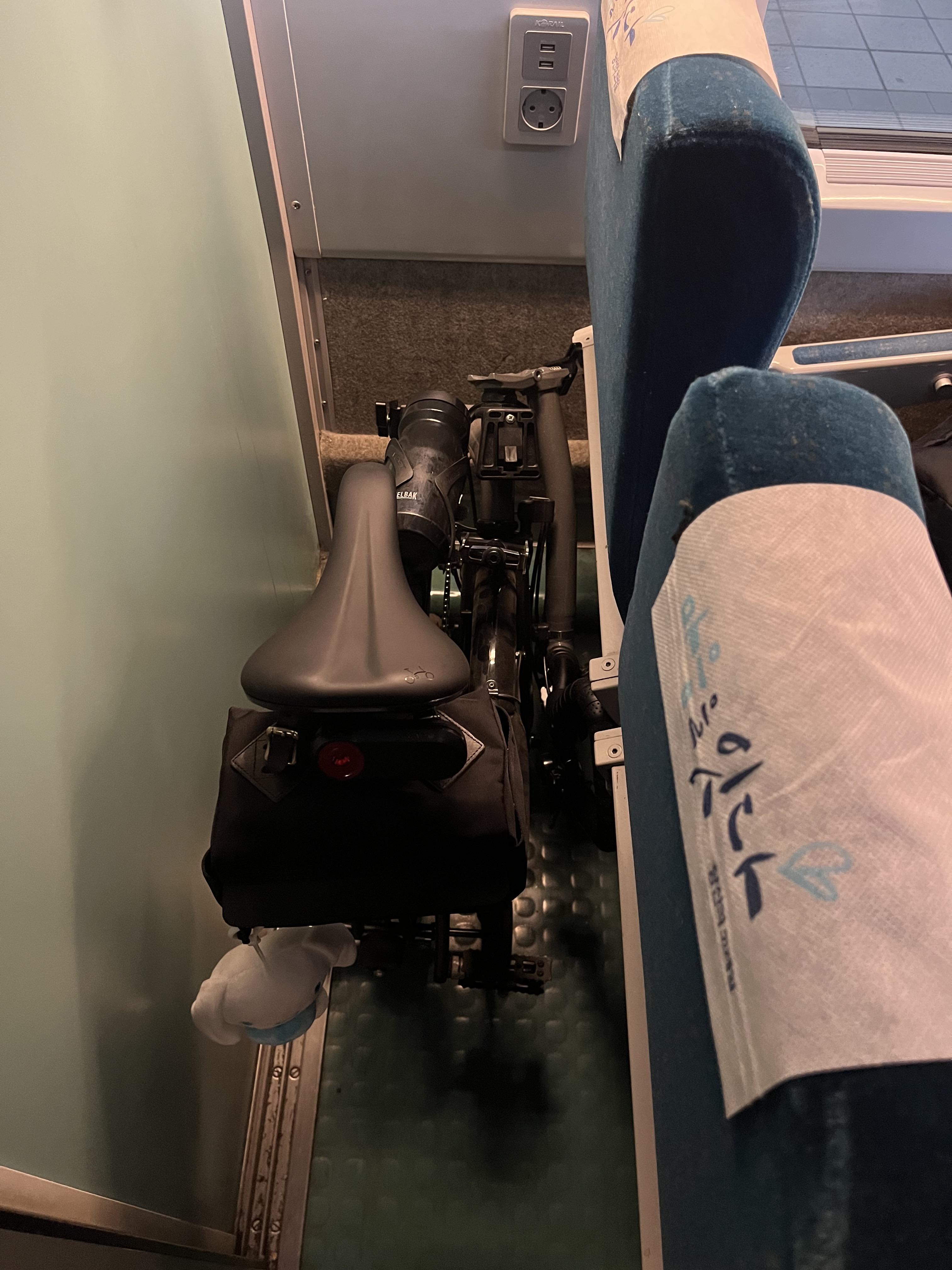 무궁화호에는 제일 뒷좌석 뒷공간에 브롬톤을 넣으면 되는데 입석으로 승차하신 분들이 자리를 차지하고 있어서 처음에는 브롬톤을 넣지 못하고 들고 있다가 역을 하나 이동한 후에 입석으로 승차하신 분들이 하차하셔서 제일 뒷좌석 뒤에 있는 공간에 브롬톤을 보관할 수 있었다.