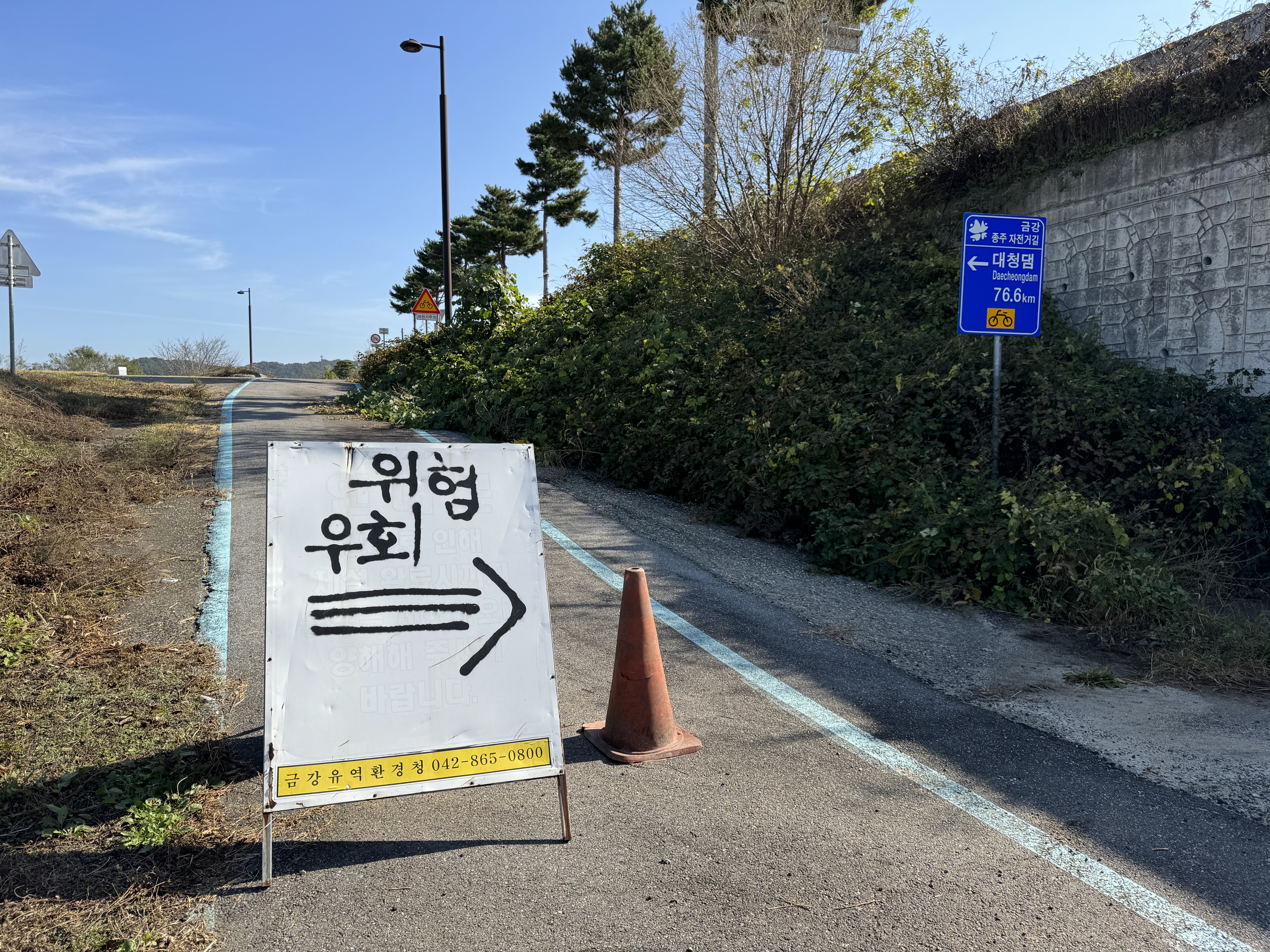 열심히 달리다보면 금강 종주 길에 있는 몇 안 되는 우회길이 또 나온다. 겉보기에는 포장이 너무 좋아서 진짜 우회해야 되는 거 맞아? 싶은데 반대편으로 가보면 우회해야 하는구나 하는 생각이 든다. 근데 우회길이 낮지만 그래도 오르막이라서 괜히 체력을 빼야해서 편하지는 않았다.