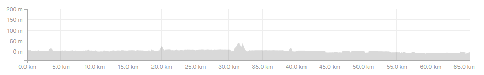 이 날의 총 거리는 65.87km 였고 획득고도는 270m 이다. 거의 평지로만 되어 있고 오르막이 이렇게나 없는데도 획득고도가 이 정도는 찍히는 구나.