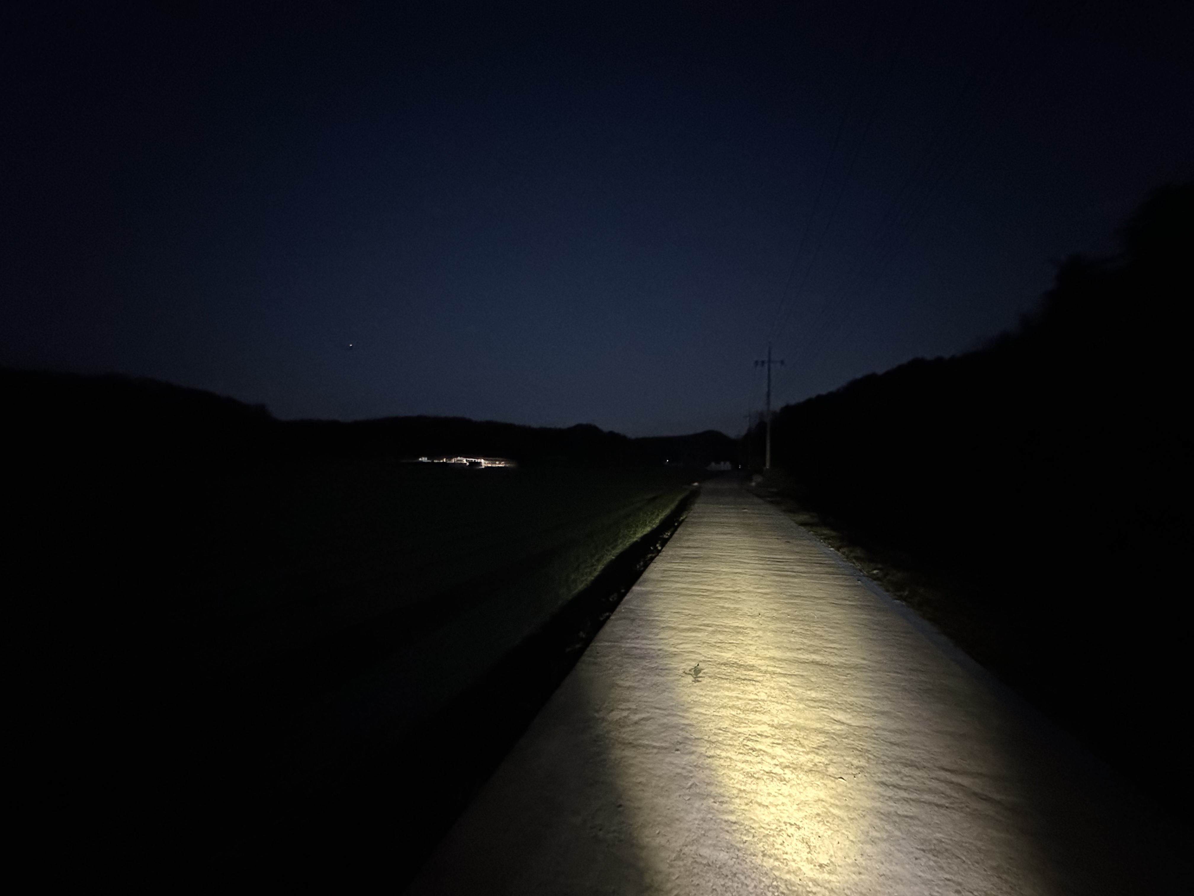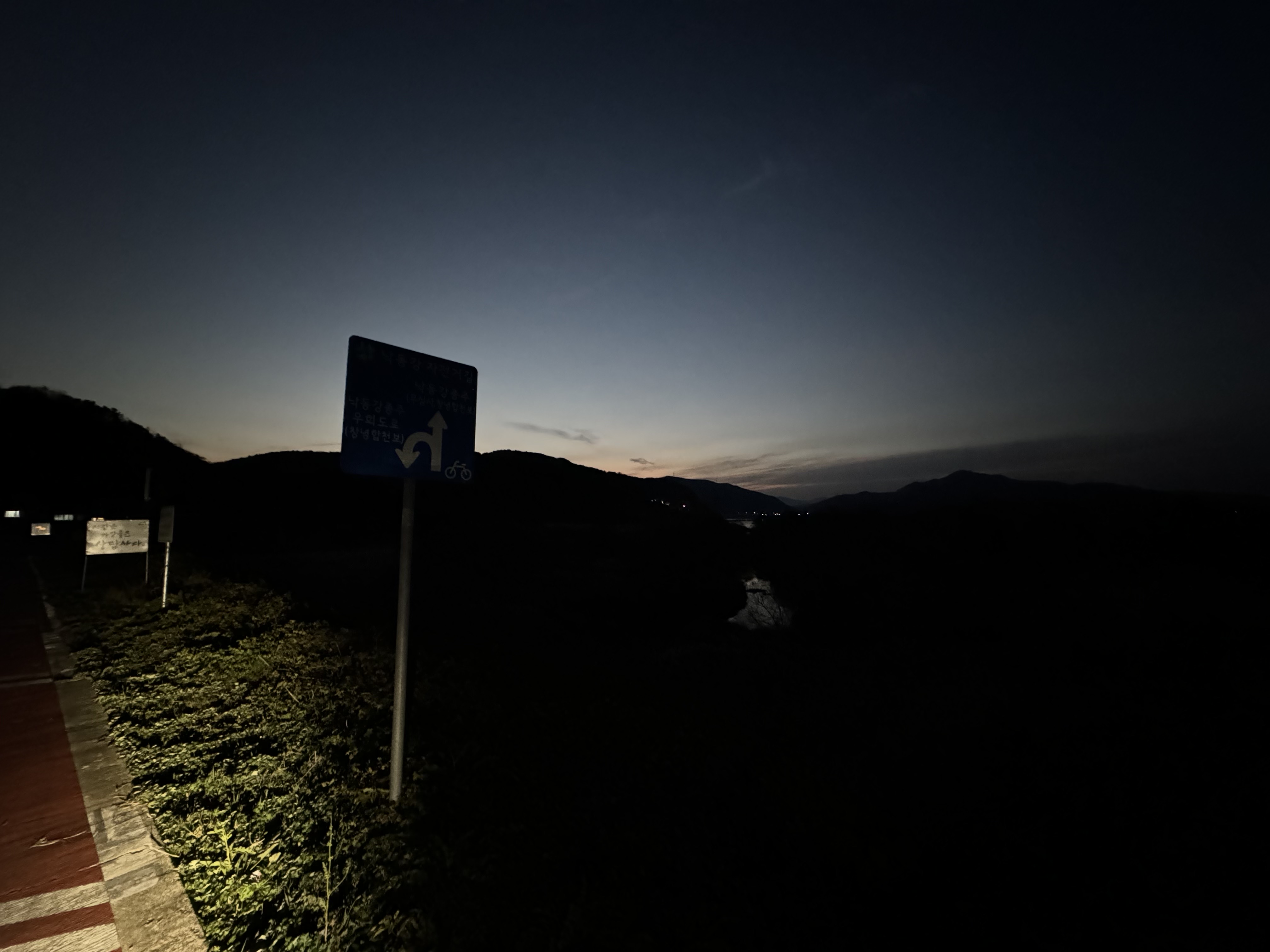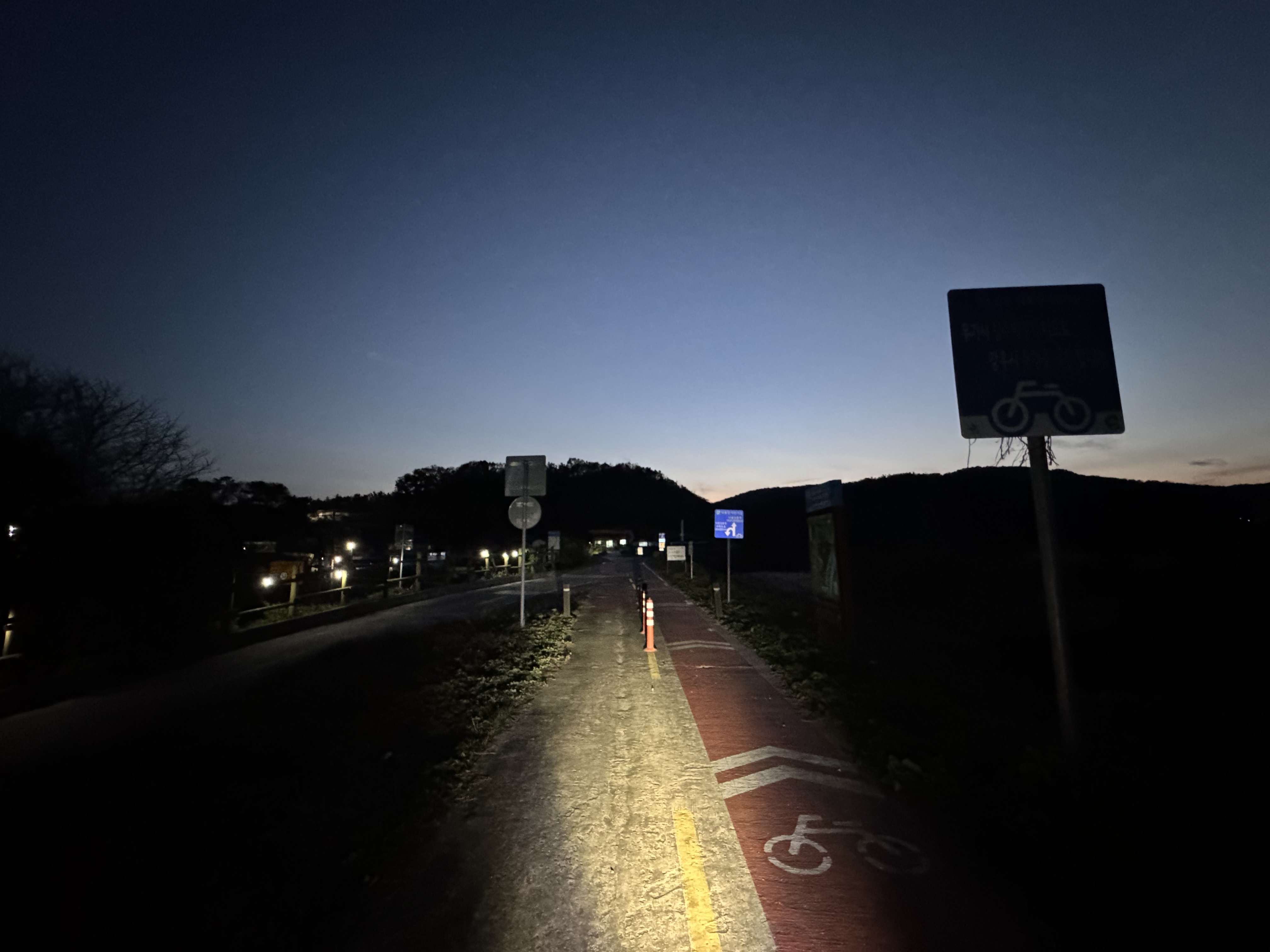 빵도 먹고 으쌰 기운 차려서 달리다 보니 어느덧 날이 완전히 져버렸다. 저 때가 아마 17시 45분인가 그랬으니 11월 낙동강의 밤은 매우 빨리 찾아오는구나 싶었다. 사실 야밤에 달리는 것 자체는 크게 문제가 되지 않는데 들개나 야생동물이 나올까봐 무서워서 조금씩 떨리기 시작했다. 18시도 안 됐는데 야밤이라기엔 좀 그런가 싶기도 하네.