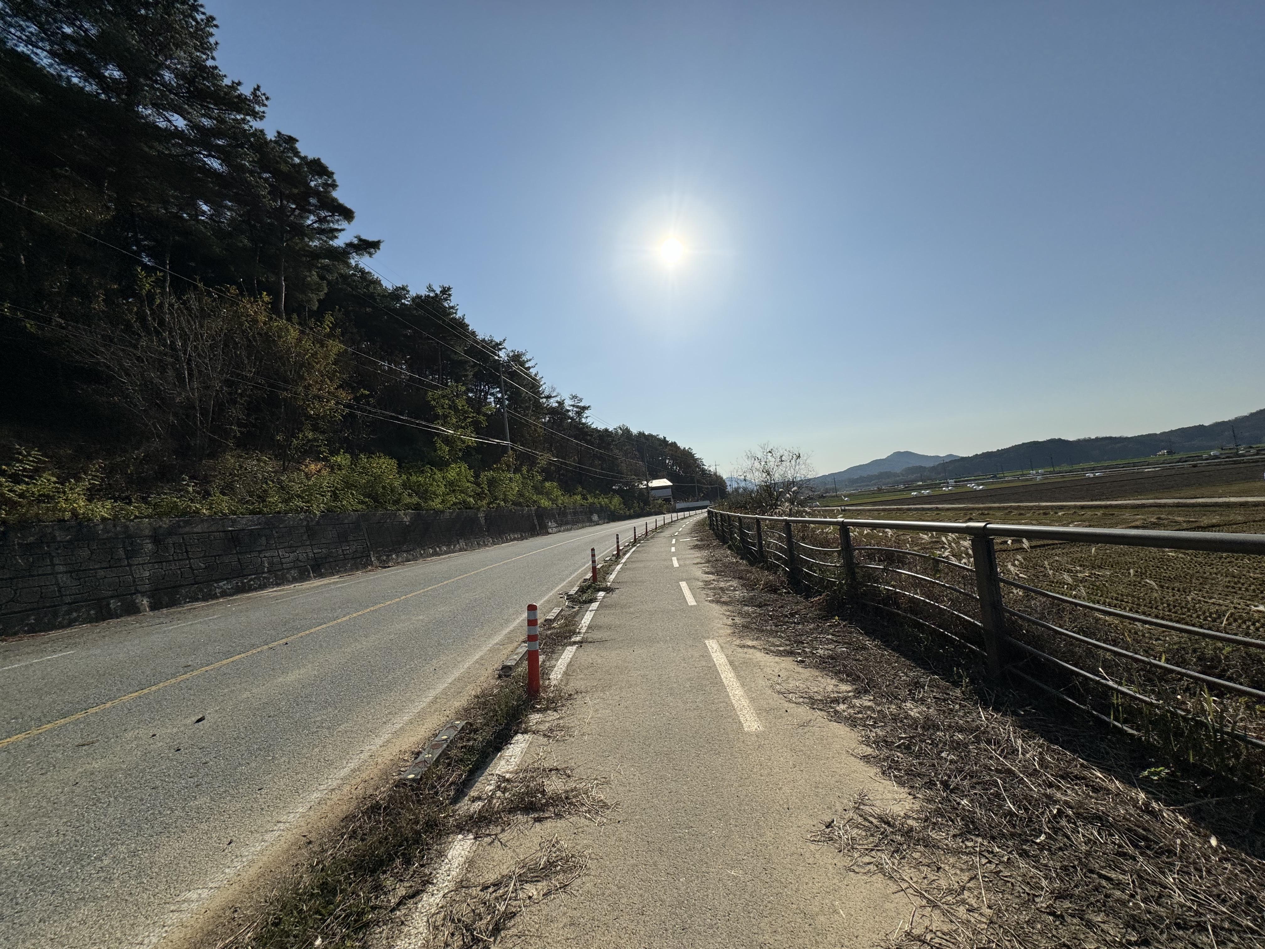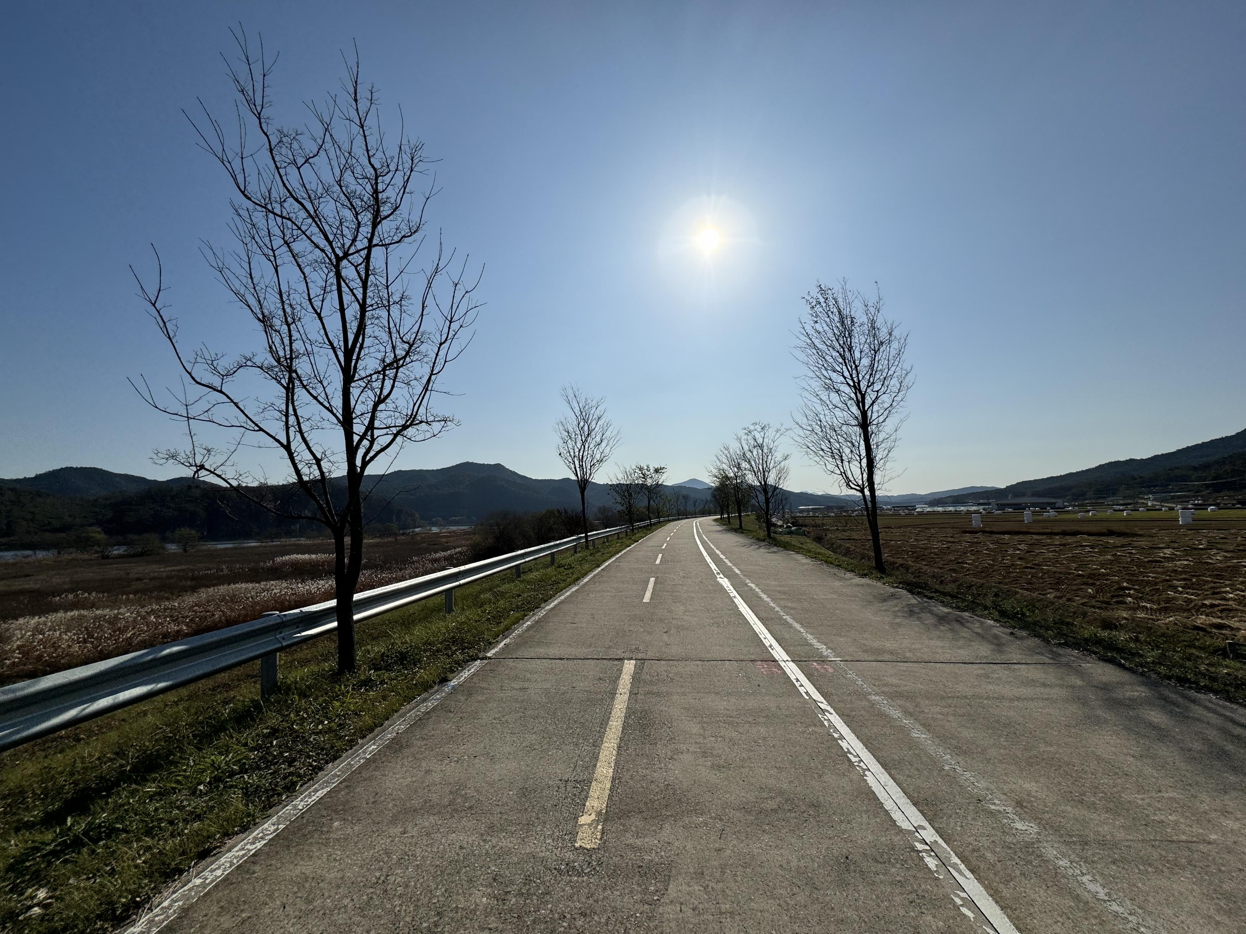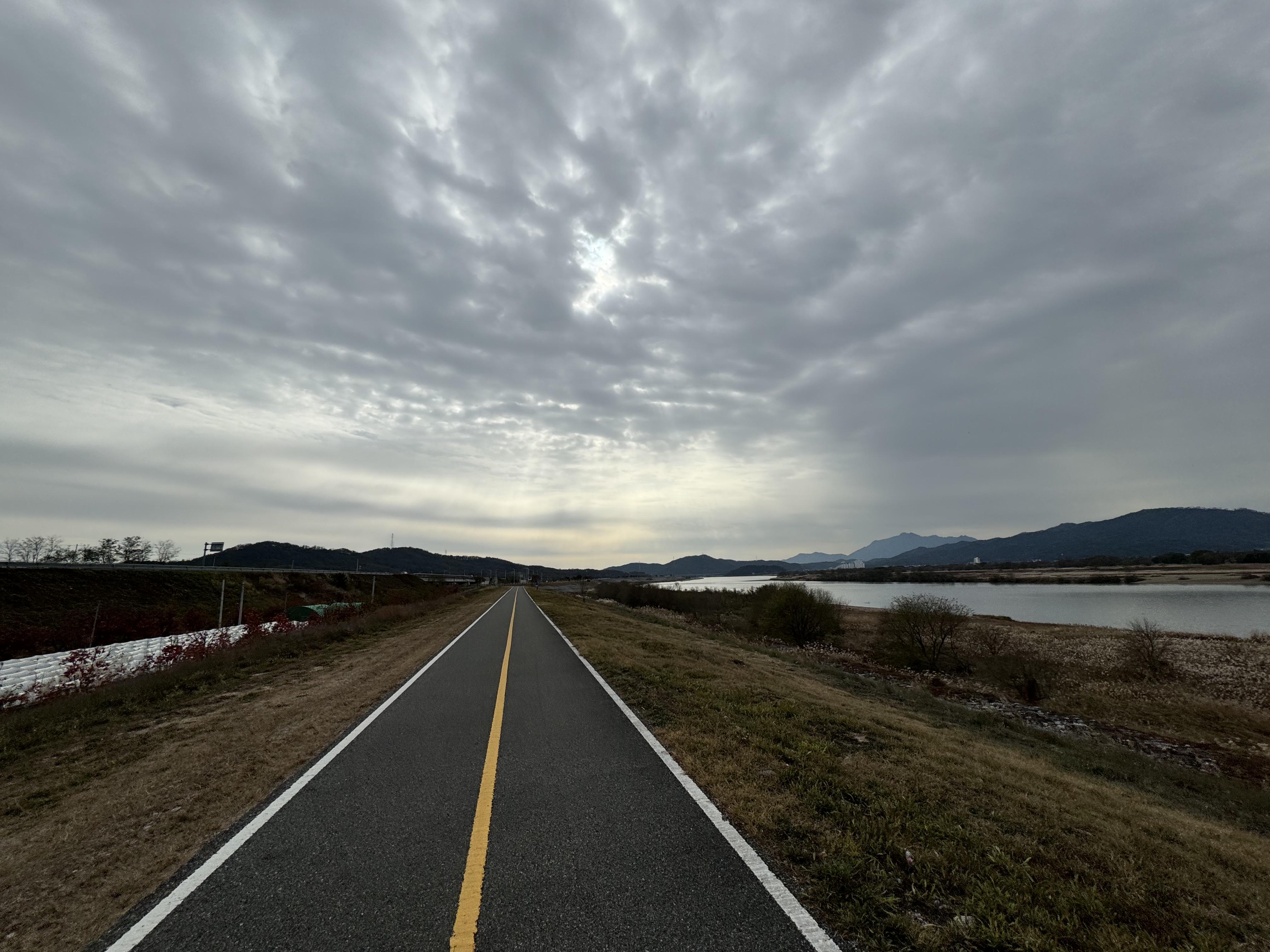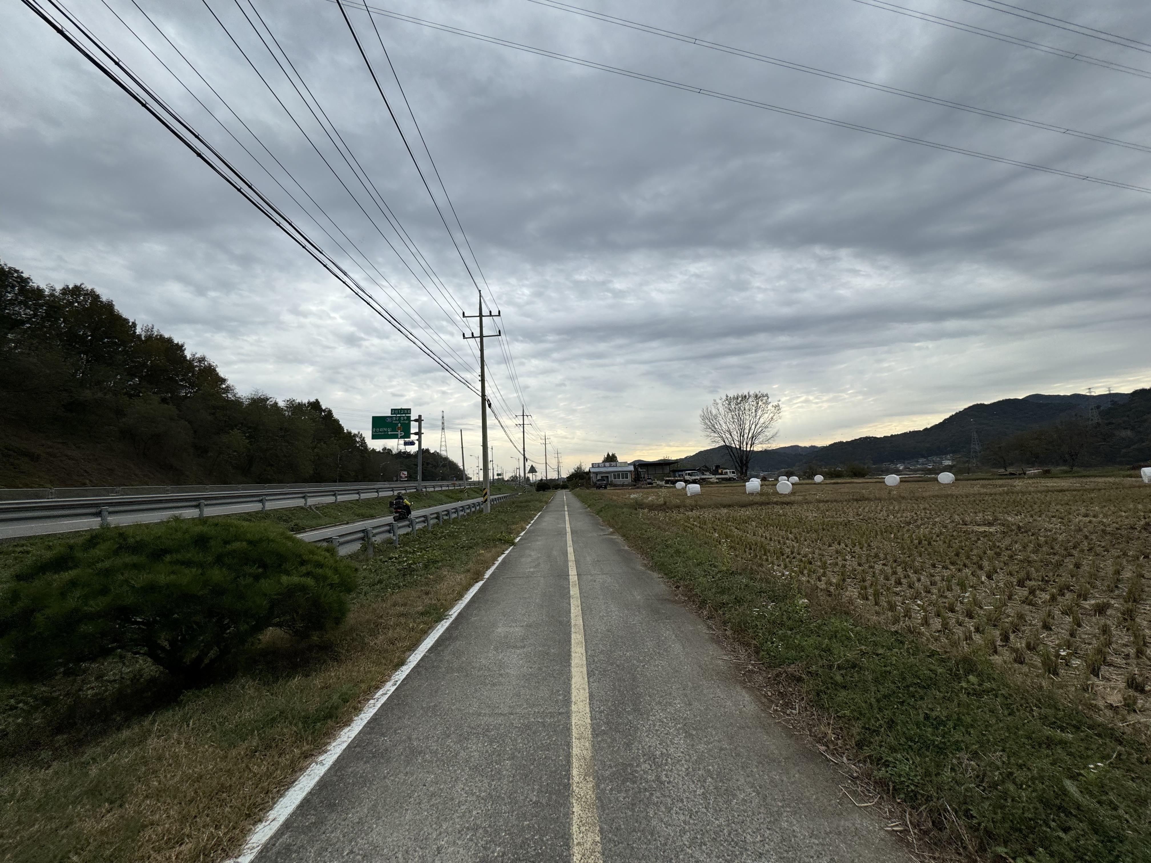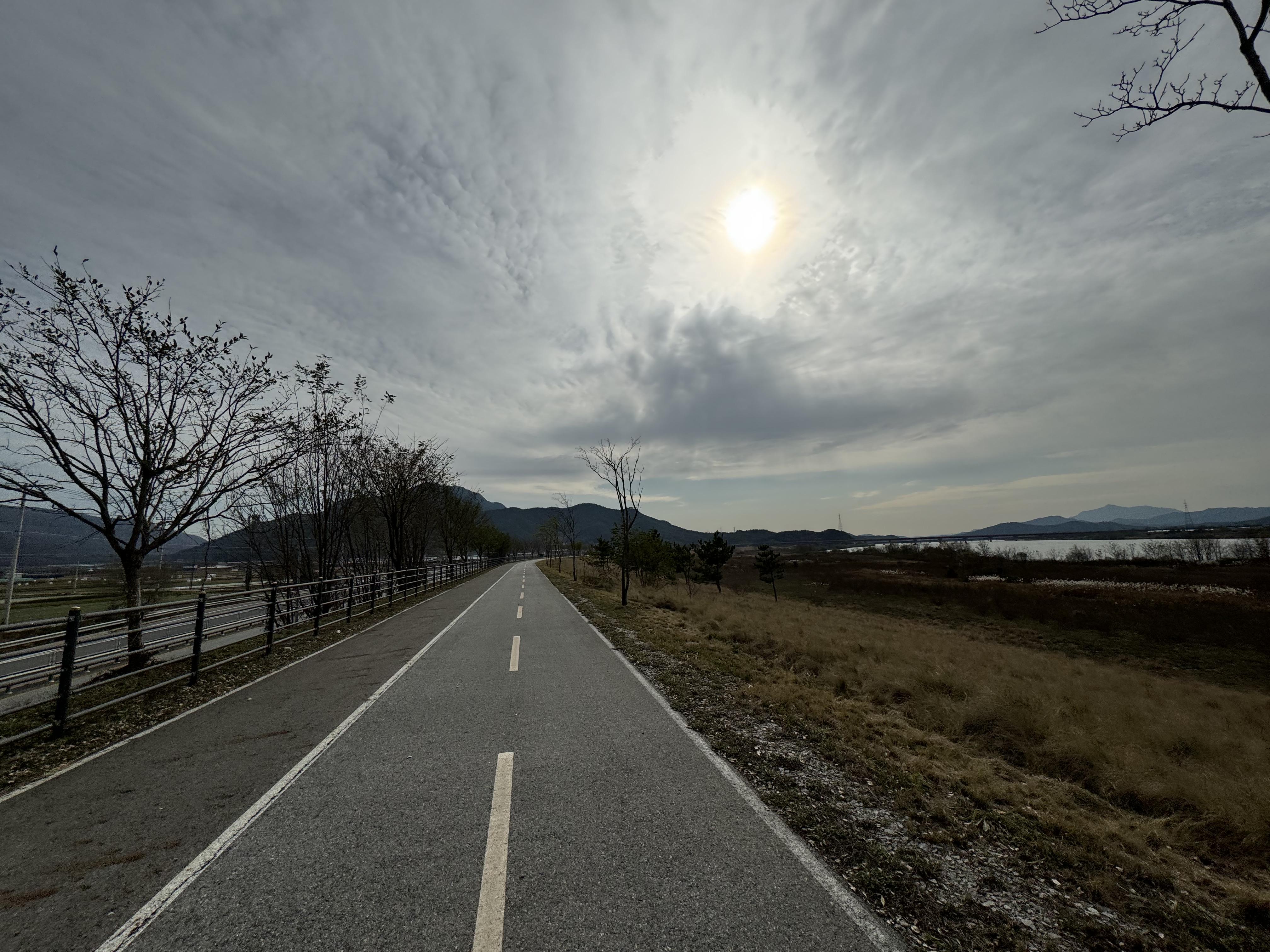 도동서원을 출발해서 달리고 있으니 이제는 그래, 밝을 때 도착하는 건 힘들겠다 싶은 순간이 찾아왔다. 그래서 배도 고픈데 빵이라도 먹고 가자 싶어서 그냥 바닥에 털썩 주저앉아 빵을 먹었다. ㅋㅋ 두 번째 사진을 찍을 때까지만 해도 가끔씩 보이던 전기 자전거를 탄 분이 있었는데 어느 순간 휑하고 날아가버려서 그 다음부터는 도저히 보이질 않았다.