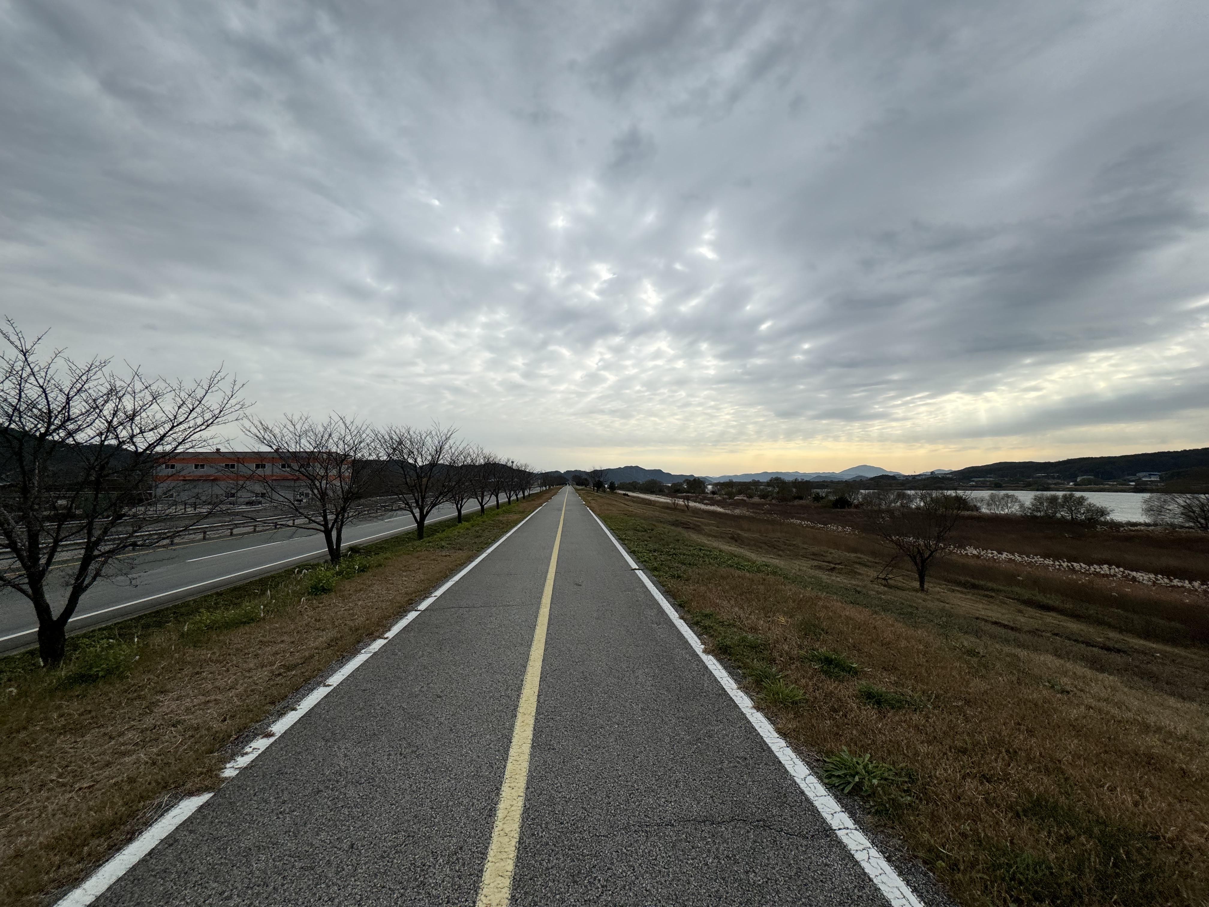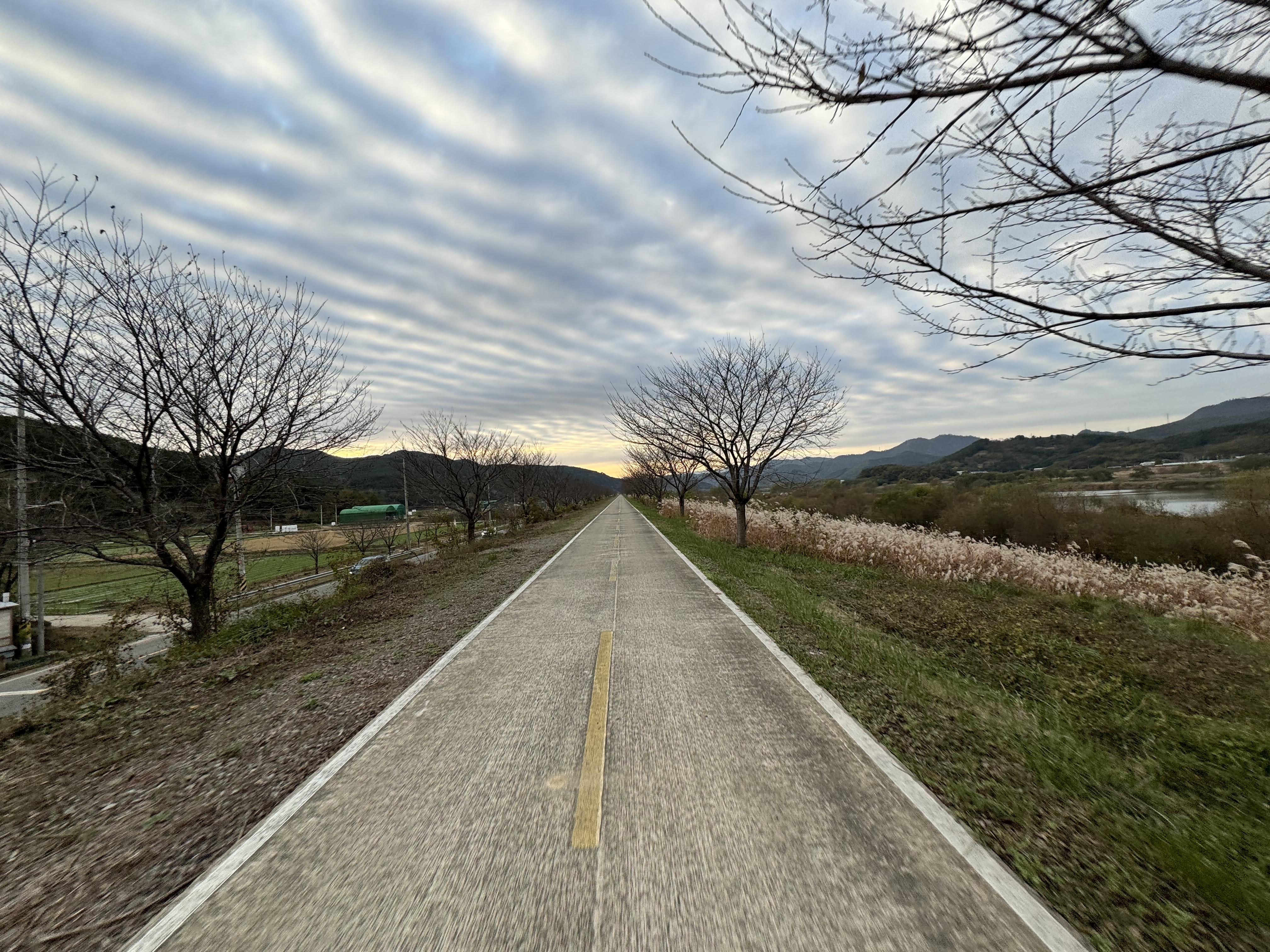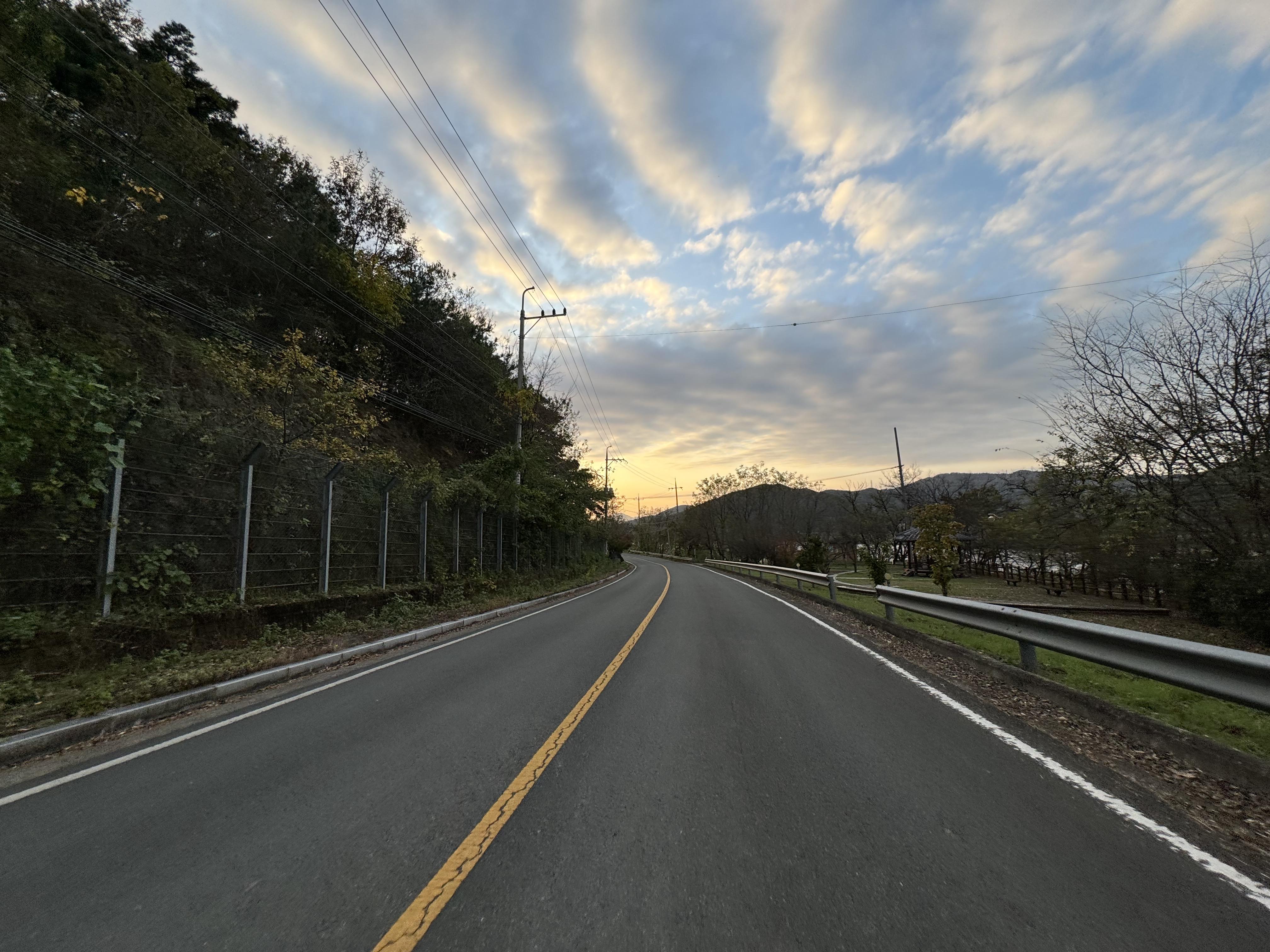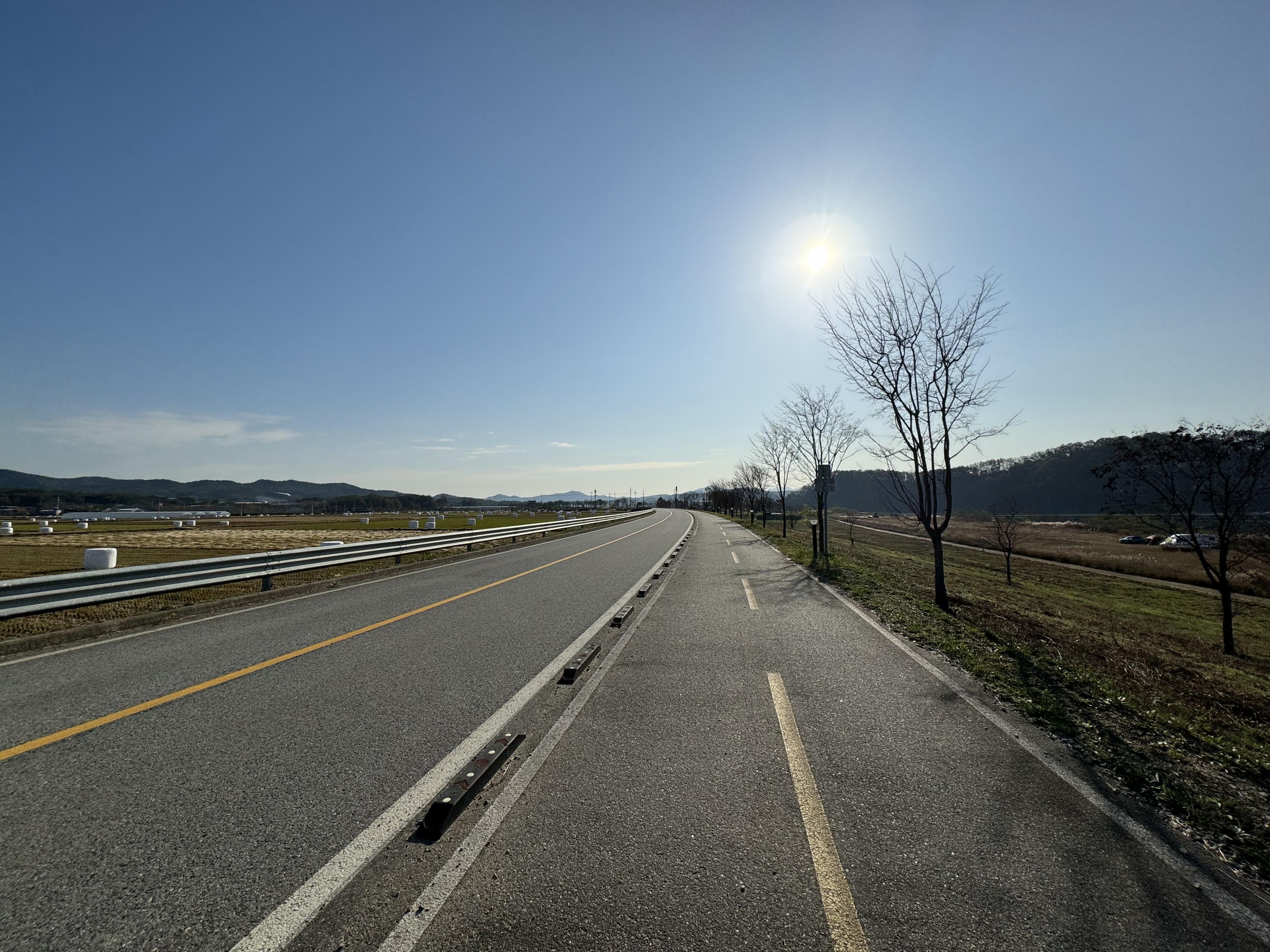 도동서원을 출발해서 달리고 있으니 이제는 그래, 밝을 때 도착하는 건 힘들겠다 싶은 순간이 찾아왔다. 그래서 배도 고픈데 빵이라도 먹고 가자 싶어서 그냥 바닥에 털썩 주저앉아 빵을 먹었다. ㅋㅋ 두 번째 사진을 찍을 때까지만 해도 가끔씩 보이던 전기 자전거를 탄 분이 있었는데 어느 순간 휑하고 날아가버려서 그 다음부터는 도저히 보이질 않았다.