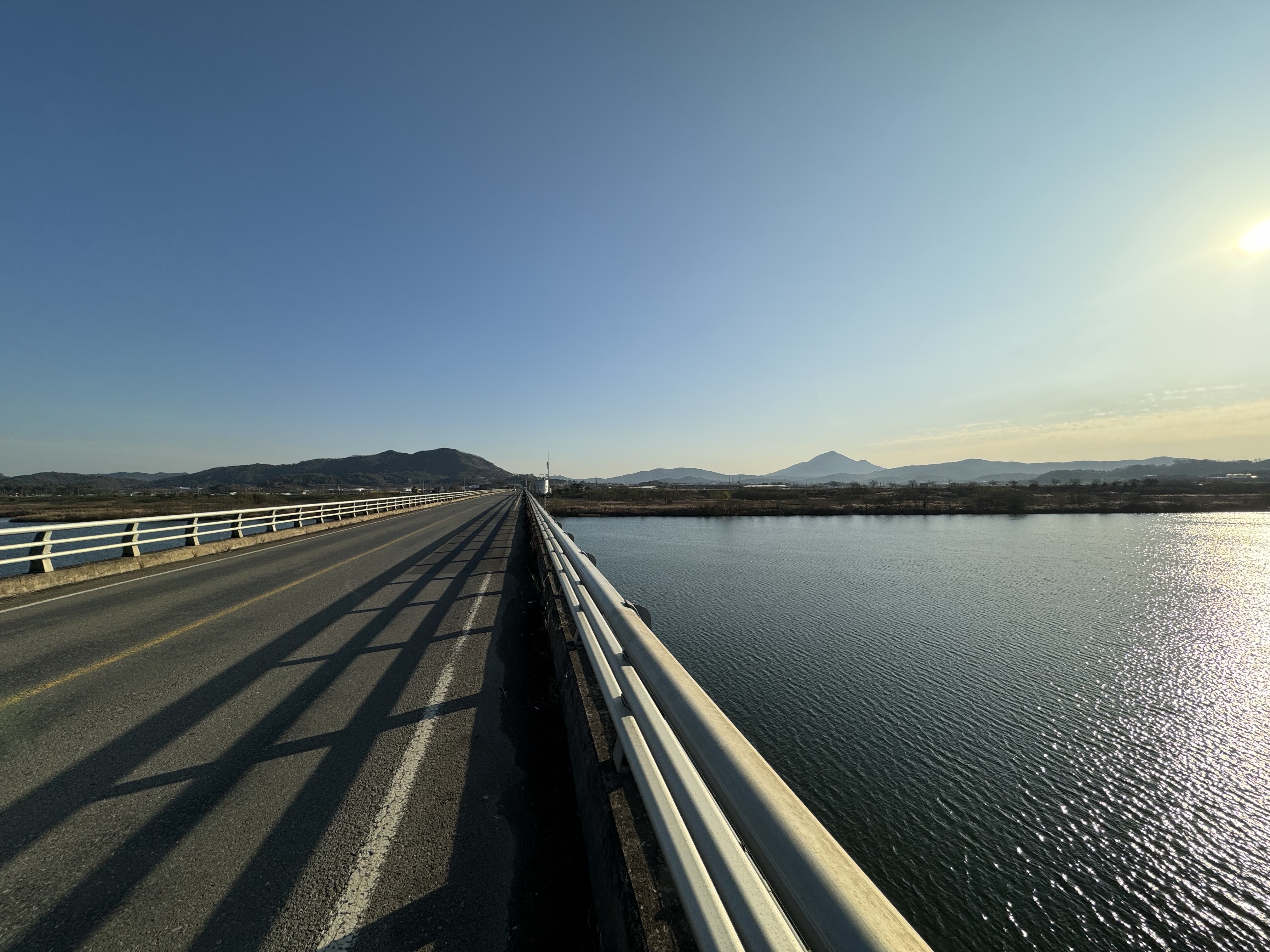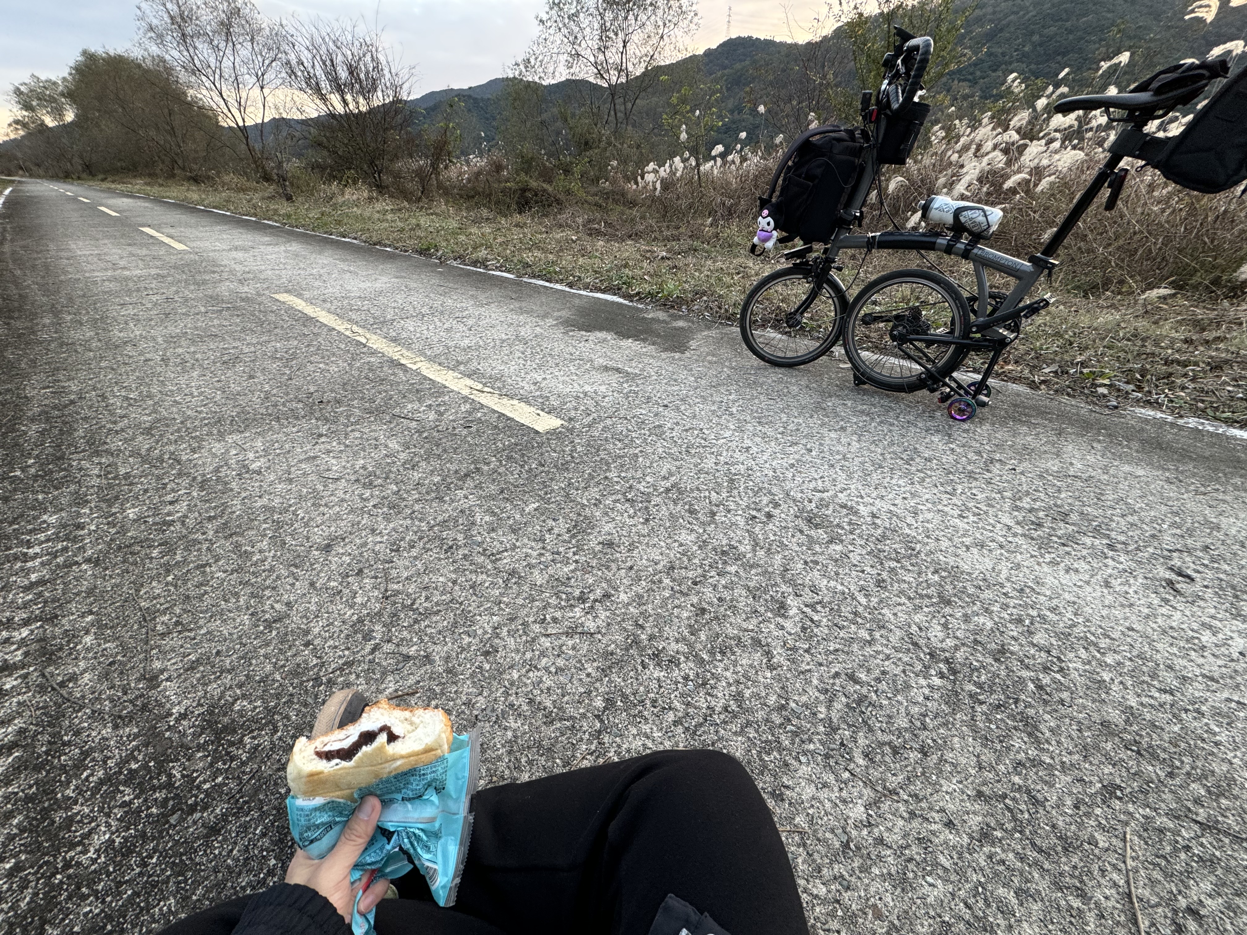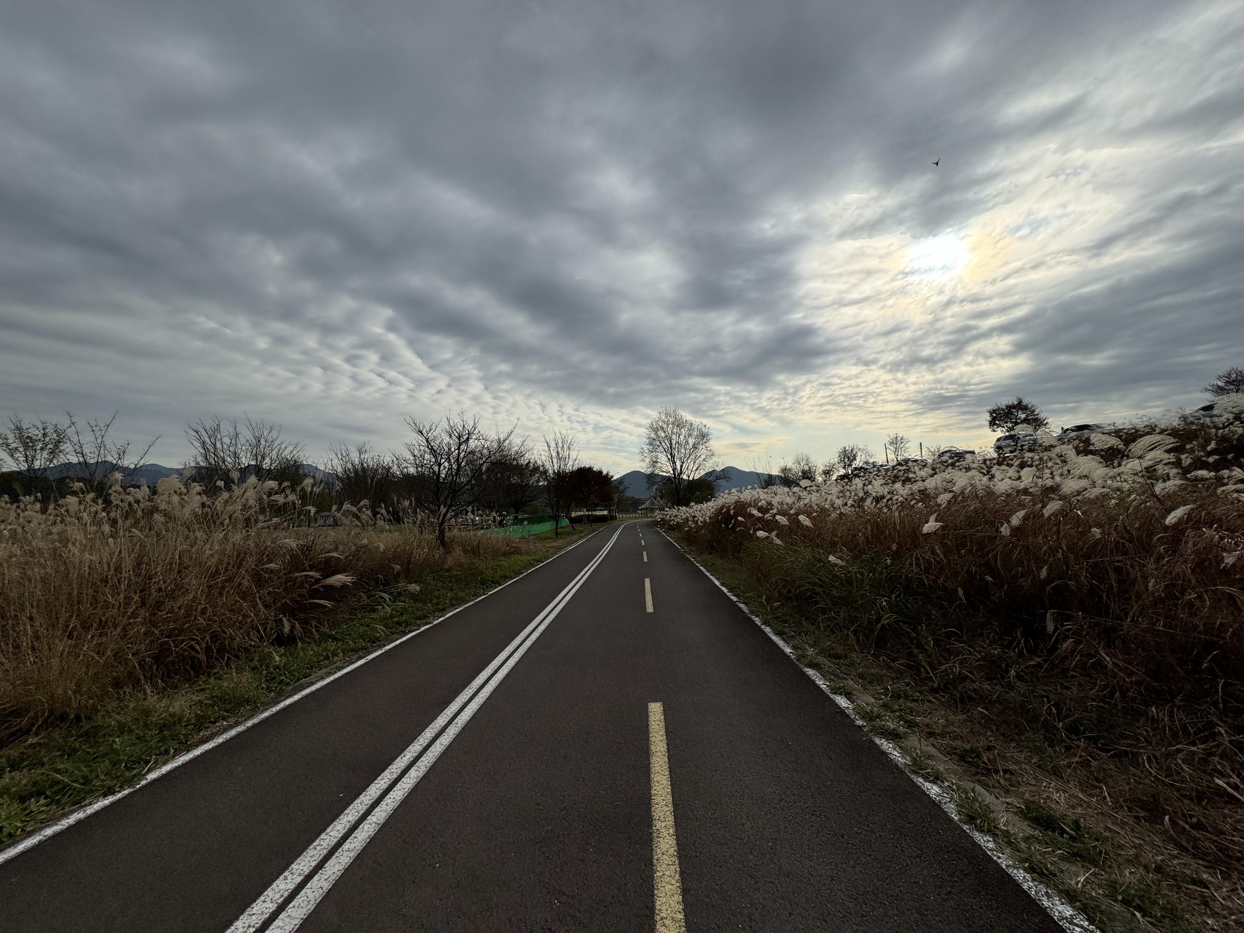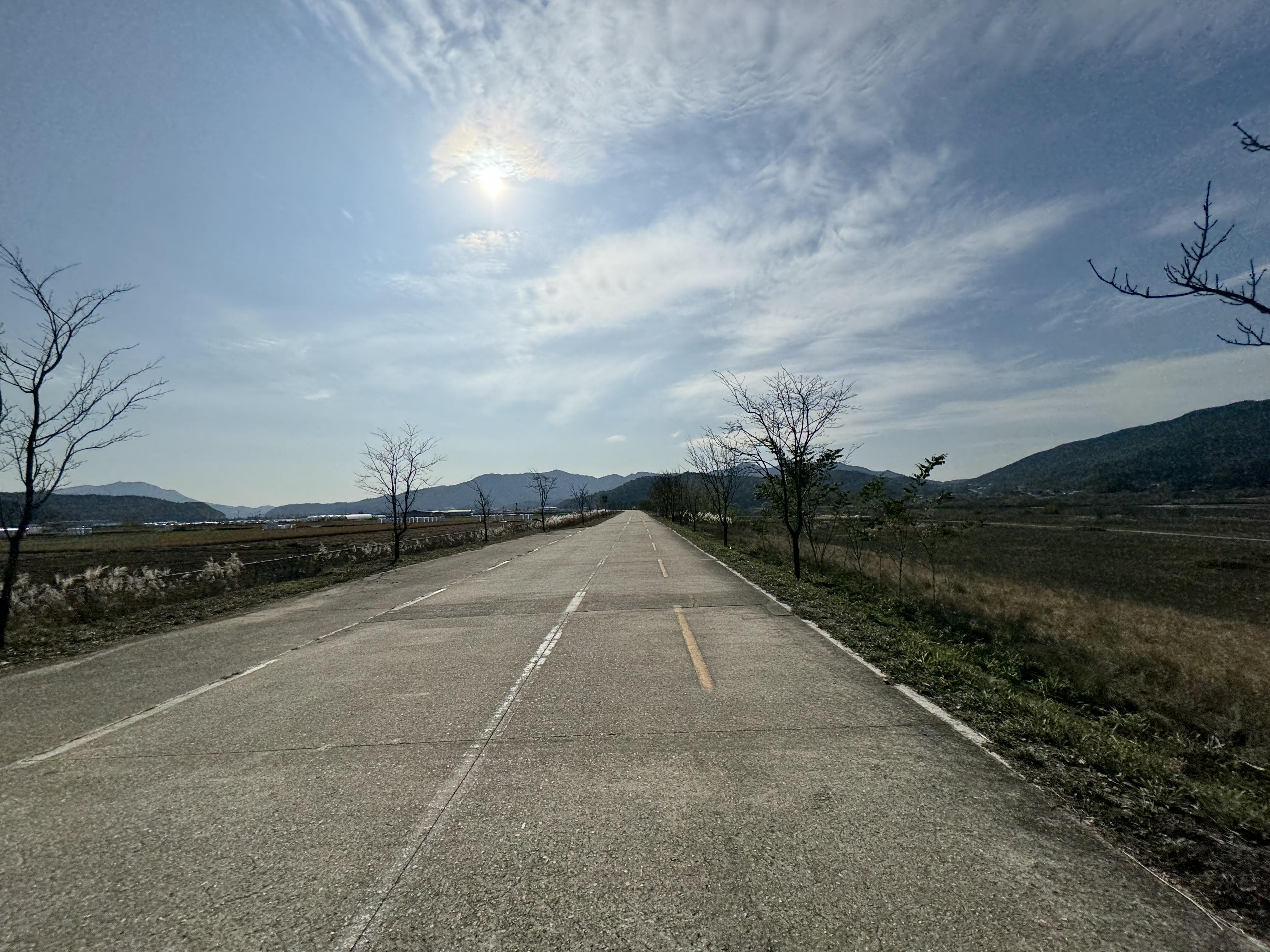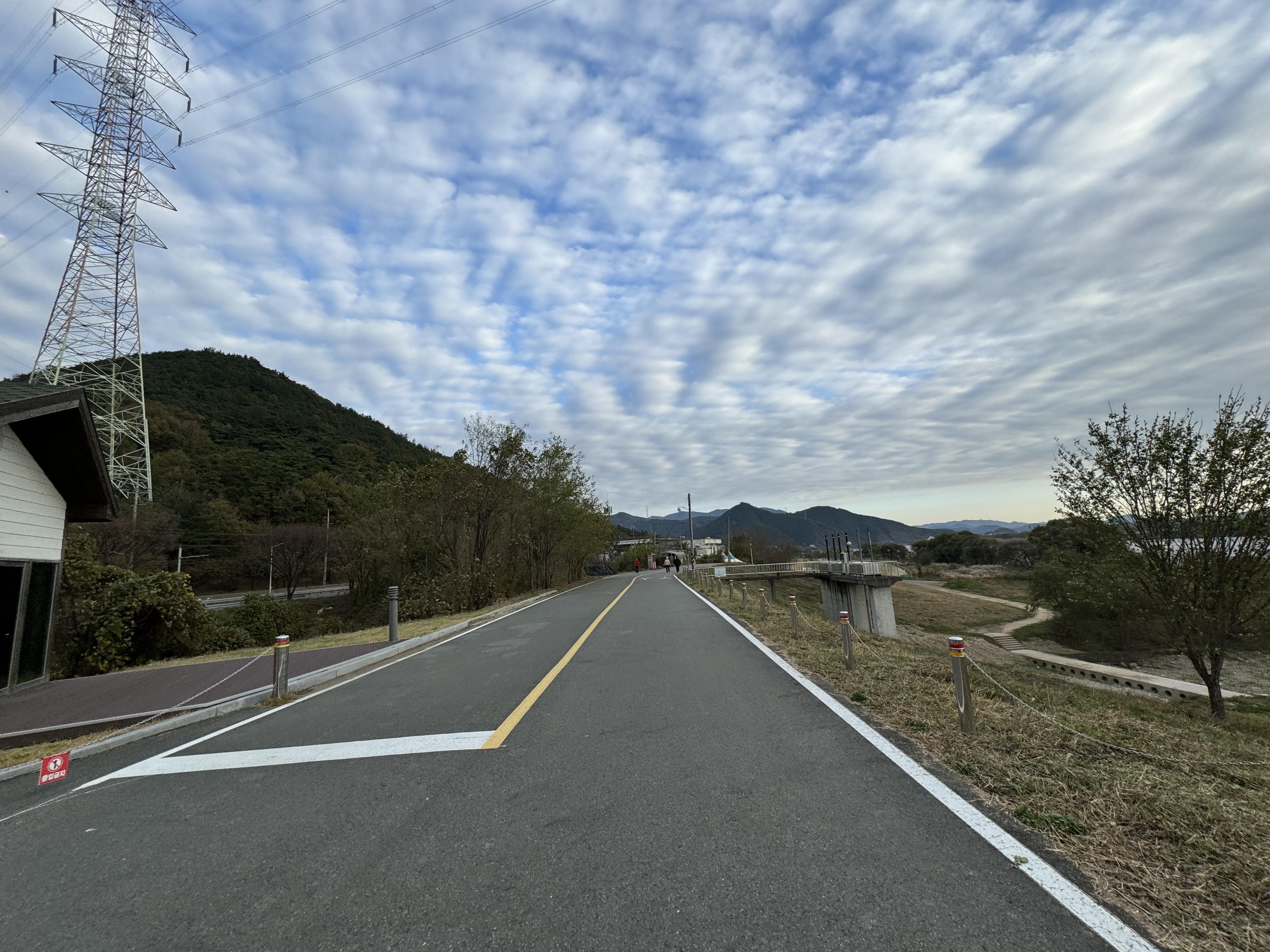 도동서원을 출발해서 달리고 있으니 이제는 그래, 밝을 때 도착하는 건 힘들겠다 싶은 순간이 찾아왔다. 그래서 배도 고픈데 빵이라도 먹고 가자 싶어서 그냥 바닥에 털썩 주저앉아 빵을 먹었다. ㅋㅋ 두 번째 사진을 찍을 때까지만 해도 가끔씩 보이던 전기 자전거를 탄 분이 있었는데 어느 순간 휑하고 날아가버려서 그 다음부터는 도저히 보이질 않았다.