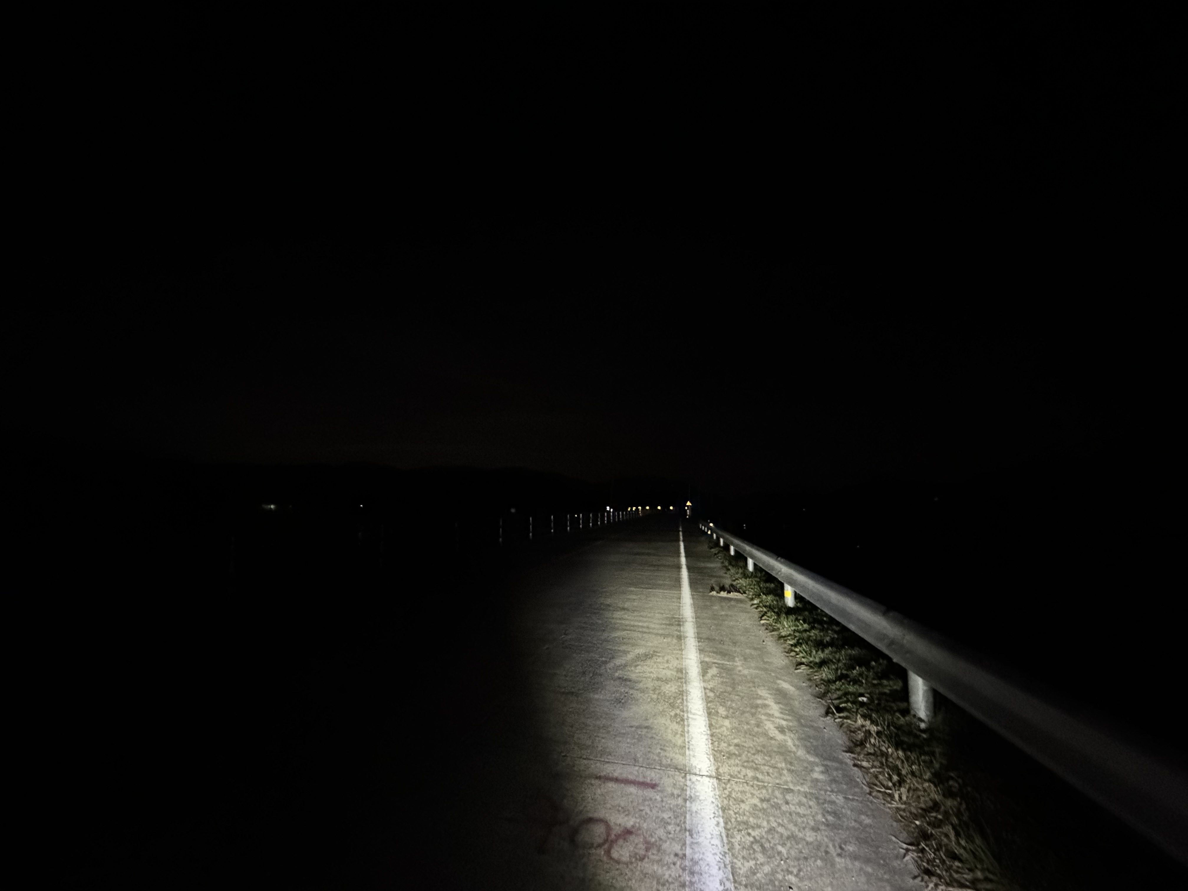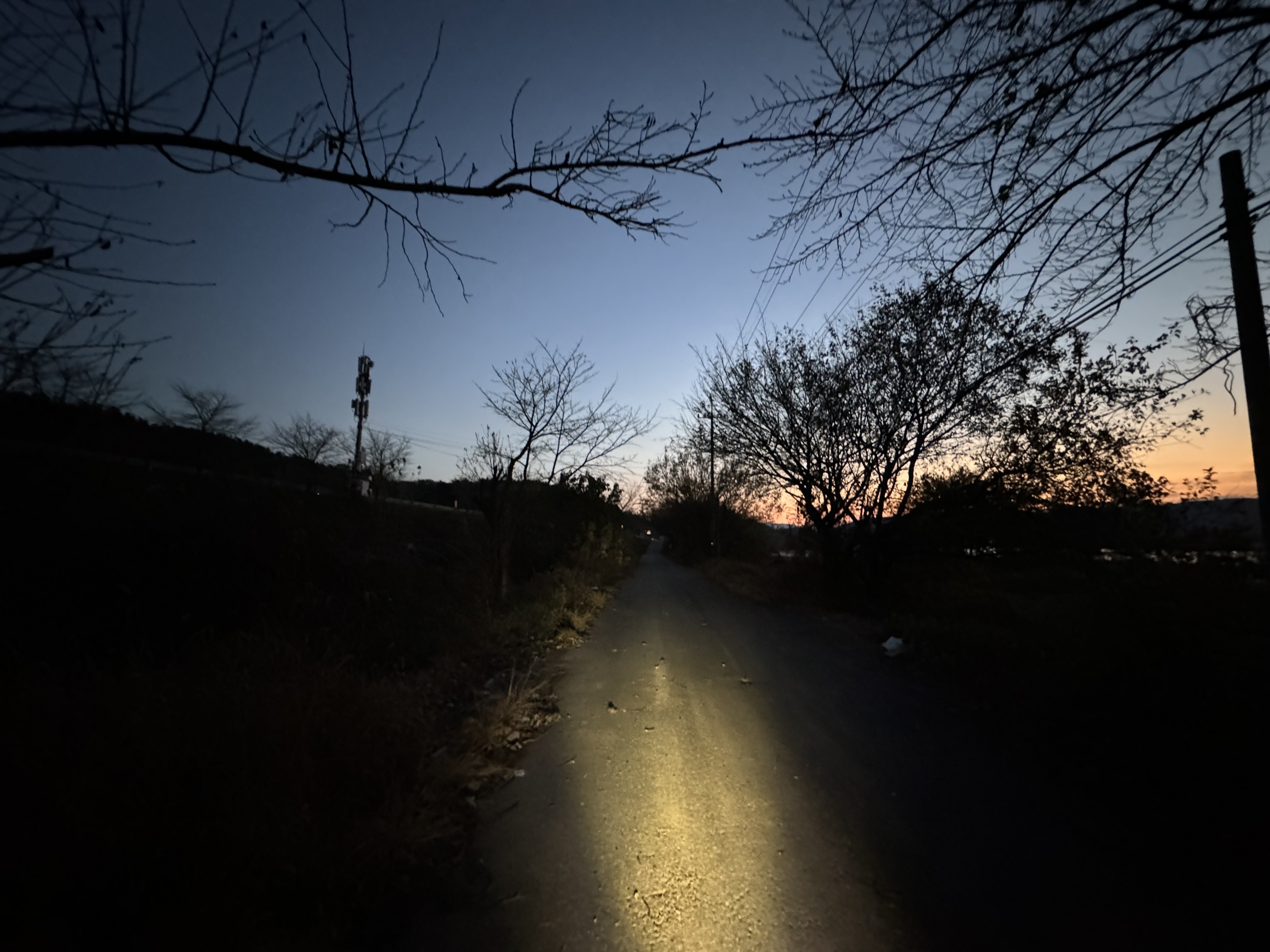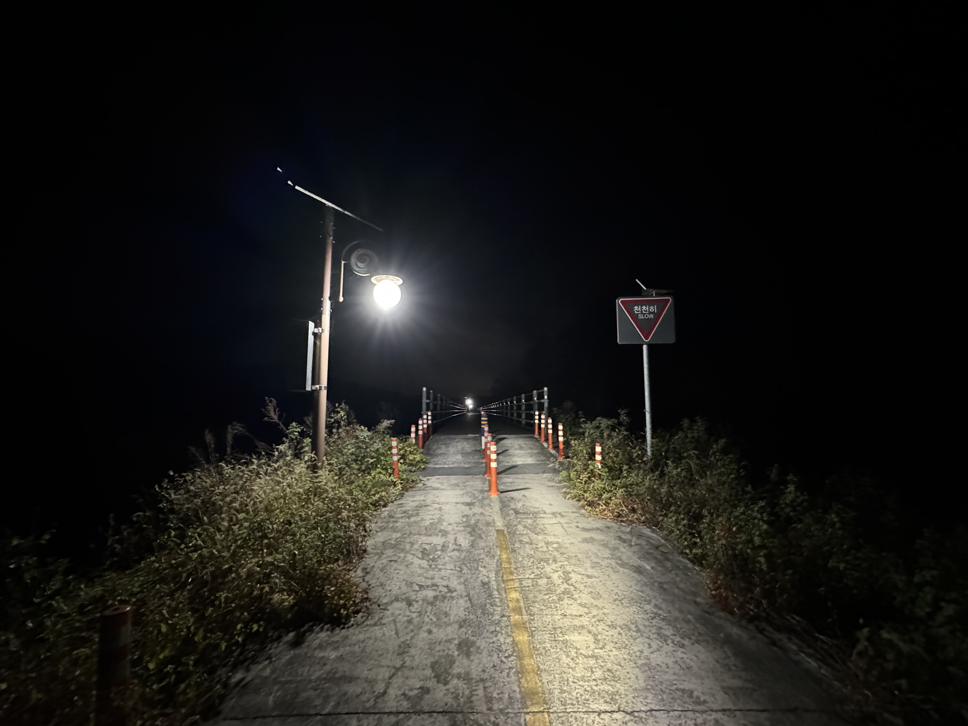 어둠을 헤치며 적포삼거리를 향해서 가던 길에 갑자기 예상치도 못 했던 가로등이 나왔다. 어? 여긴 왜 이렇게 밝지? 이 쪽 구간은 라이더들을 위해 가로등이 설치가 되어 있는건가? 라고 감탄 했는데 잘 생각해보니 사진으로는 잘 보이지 않지만 이 쪽에는 커다란 암벽이 하나 있는데 아마 이 암벽을 보러 온 사람들을 위한 가로등인 것 같았다. 그도 그런 게 암벽 구간이 끝나니 바로 가로등이 없어졌었다...