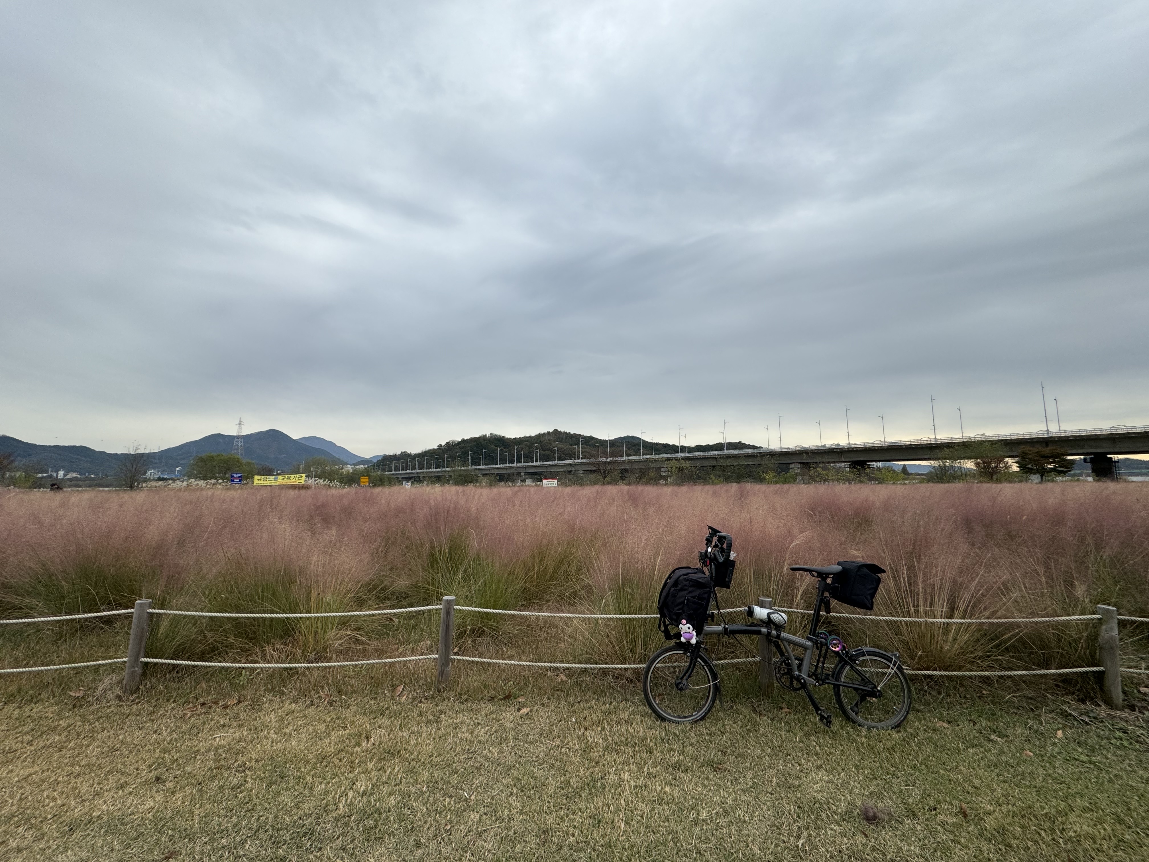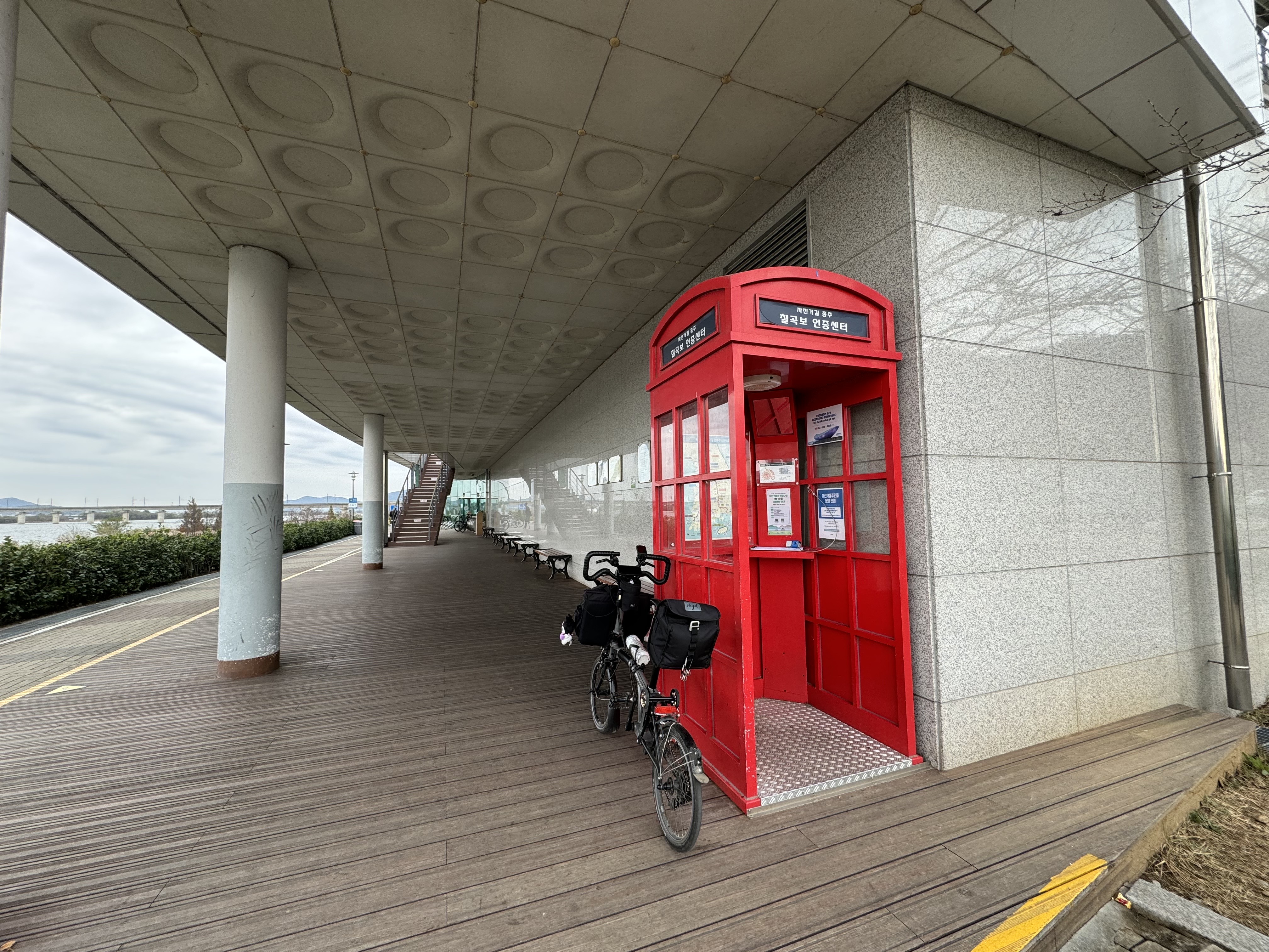 생태공원이라더니 생태교란종이라는 핑크뮬리를 매우 많이 심어놓았던 보행자가 매우 많은 공원을 지나면 곧바로 칠곡보 인증센터에 도착한다. 원래 이 곳도 꽤 많은 라이더가 있는 곳인데 역시나 내가 갔을 때는 텅텅 비어있었다. 다른 인증센터야 원래 사람이 별로 없다고 해도 칠곡보 인증센터가 이렇게 한적한 건 정말 처음 봤다.