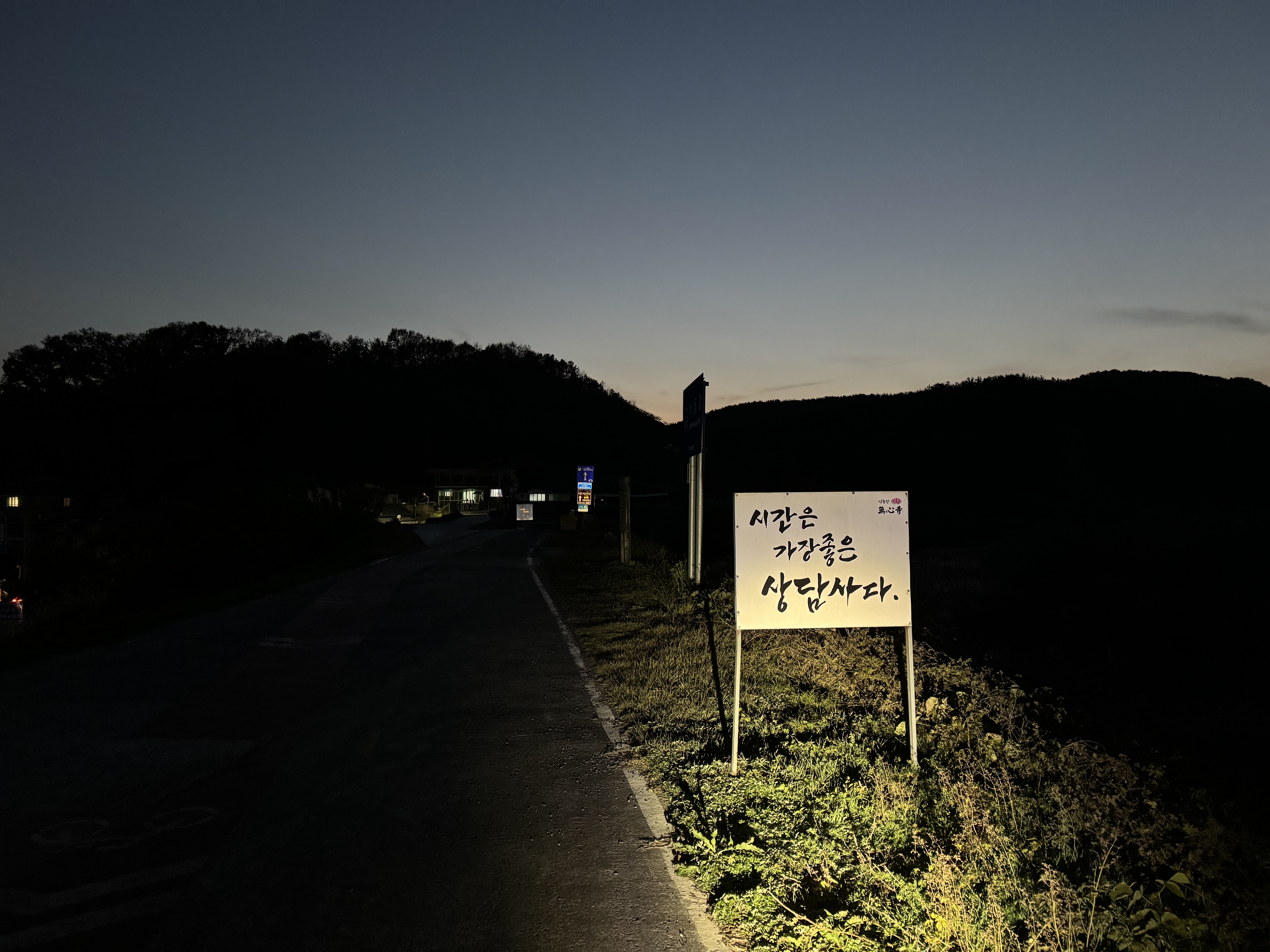 열심히 달리다보니 안내 표지판이 정신없이 붙어있는 곳이 나왔다. 여기가 바로 무심사인데 여기는 안내 표지판을 왜 이렇게 많이 붙여뒀는지 모르겠다. 하여튼 다른 곳이라면 몰라도 무심사는 절대 밤에는 못 올라가겠다 싶어서 우회를 선택했는데 사실 낮에 왔어도 우회를 했을 거다.