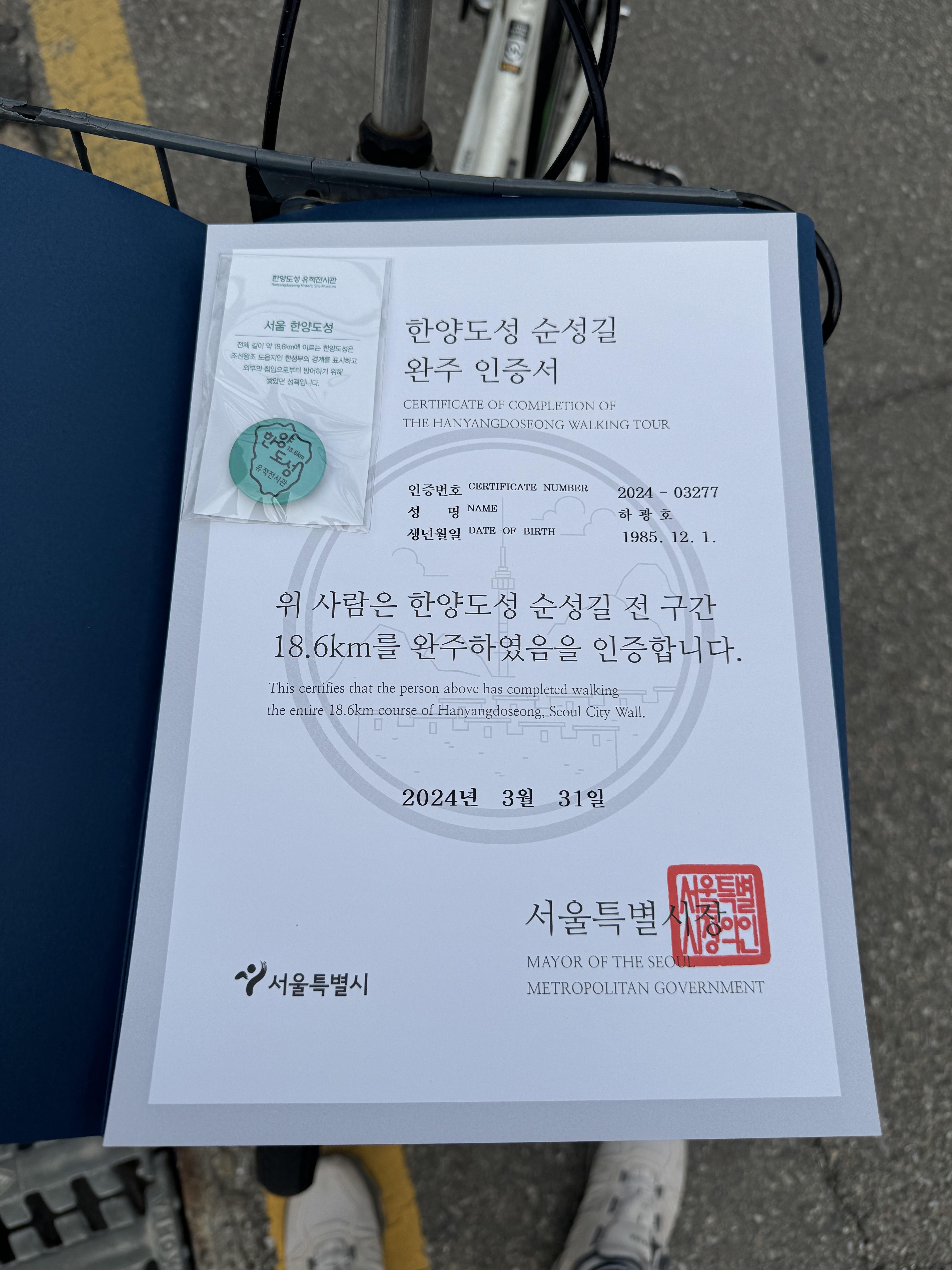 그렇게 6시간 30분에 걸친 한양도성 순성길 걷기 완주를 성공적으로 마쳤다. 근데 인증서에는 18.6km 라고 나와있는데 스트라바 상에는 오늘 걸은 거리가 25km 가 찍혀있는데 어떤 게 맞는 건지 모르겠다. 아마도 오늘 걸은 구간 중에 공식적으로는 구간에 포함되지 않는 길들이 있는 게 아닐까 하고 유추만 해본다.