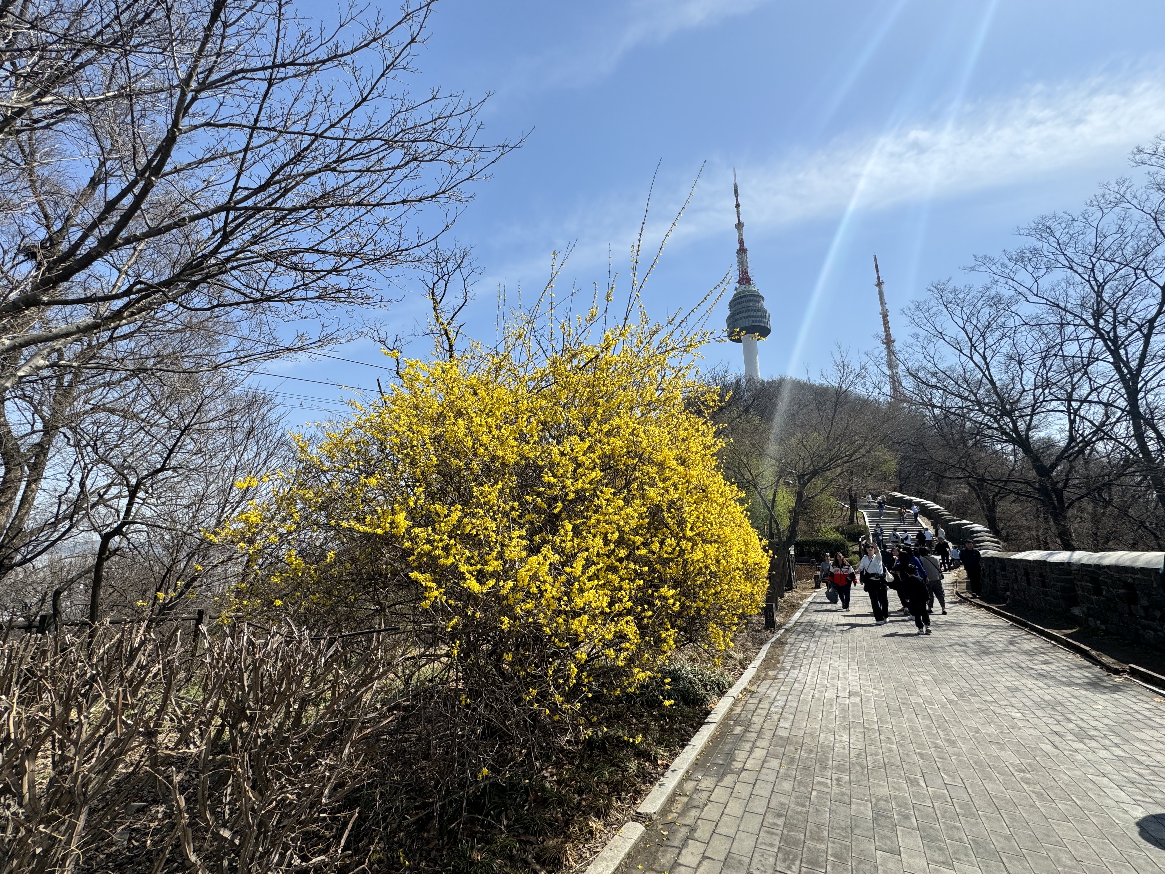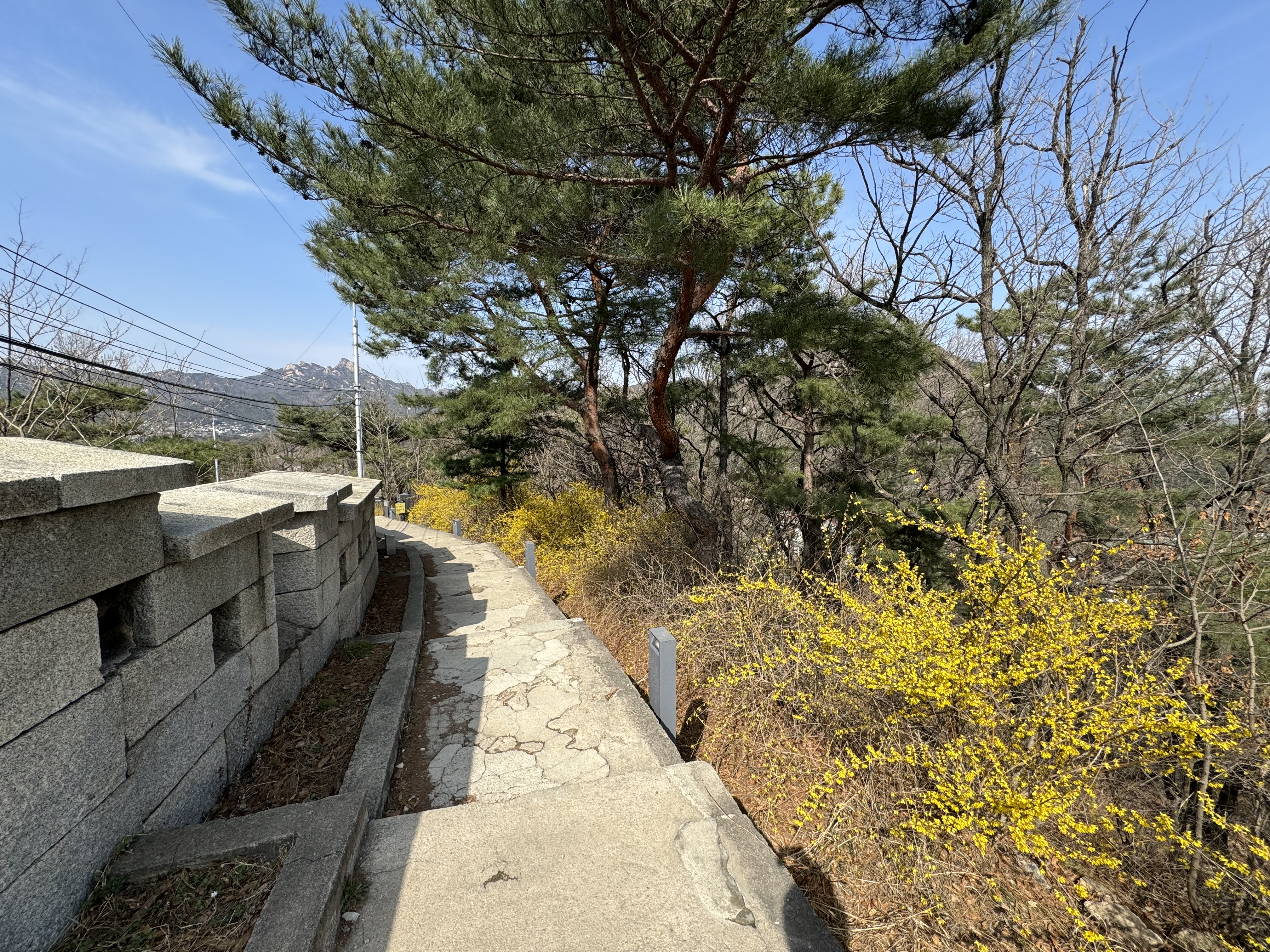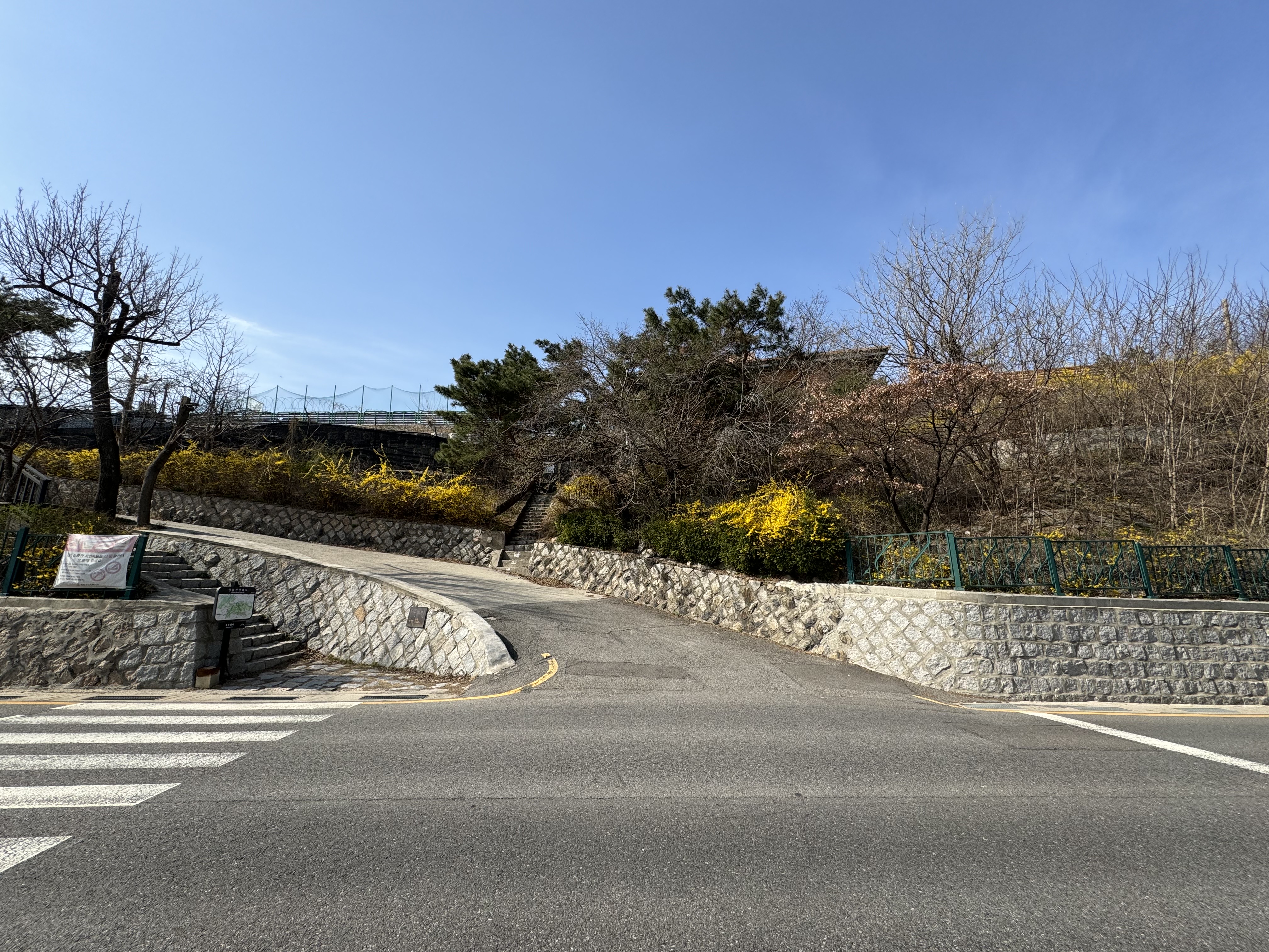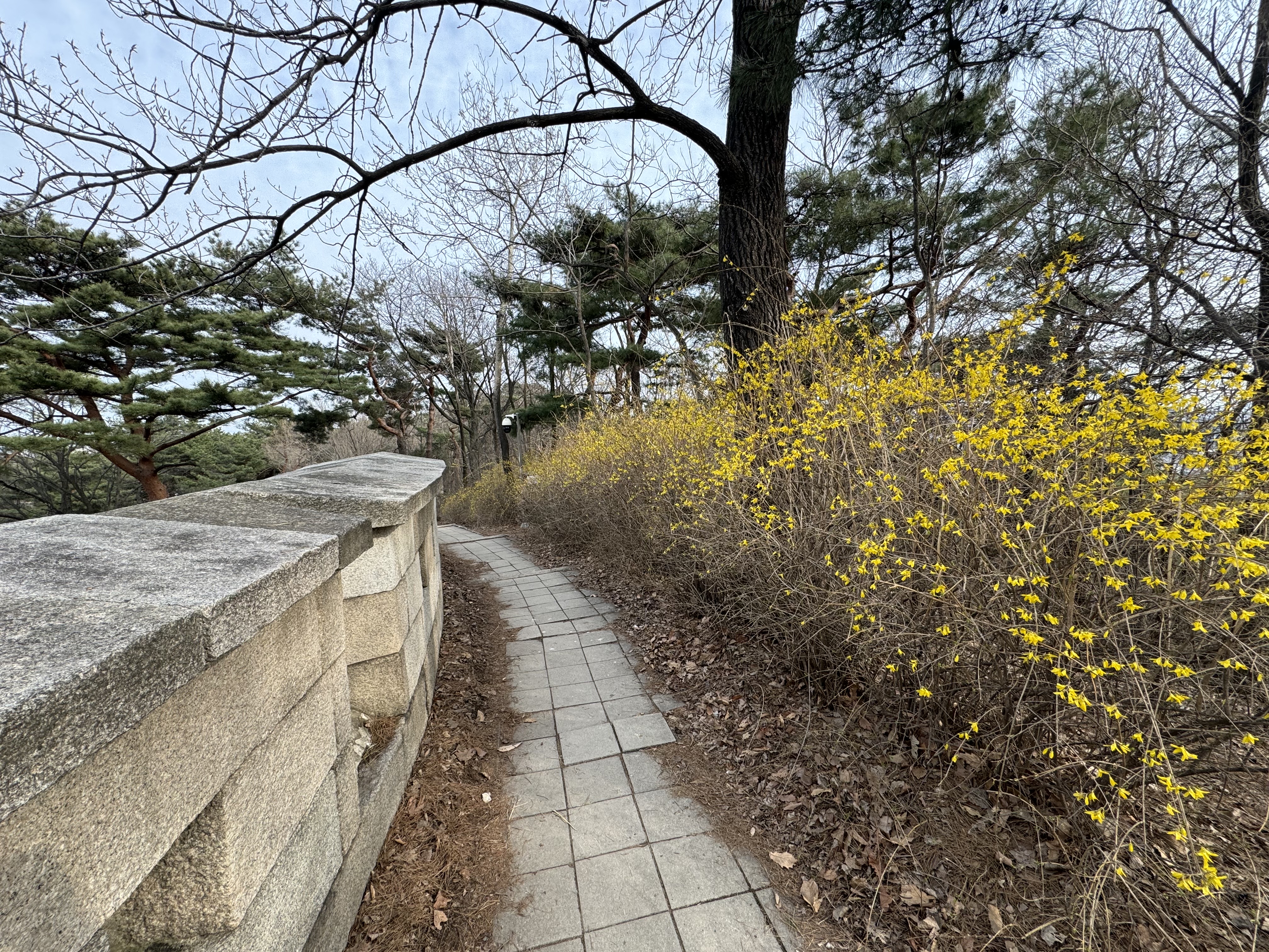 날씨가 따뜻해서 그런지 여기저기 개나리가 많이 피어있었다. 위에도 적었지만 시간이 널널할 거라고 생각해서 사진도 몇 번씩이나 찍으면서 살방살방 걷고 있으니 갑작스런 오르막이 나타났다. 솔직히... 적잖이 당황했다. 그러고보니 여기까지 오면서 카페가 하나 있길래 커피를 한 잔 하려다가 그냥 왔는데 그랬으면 큰일날 뻔 했다.