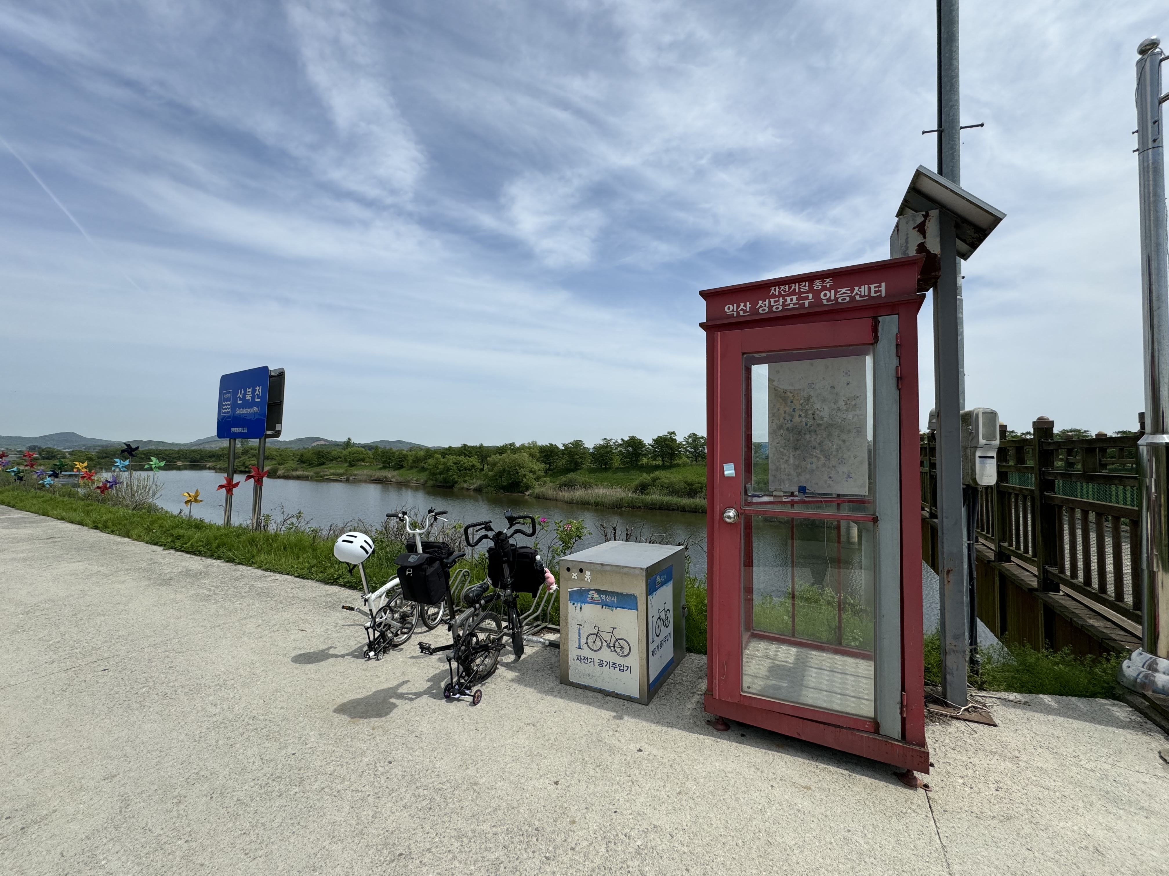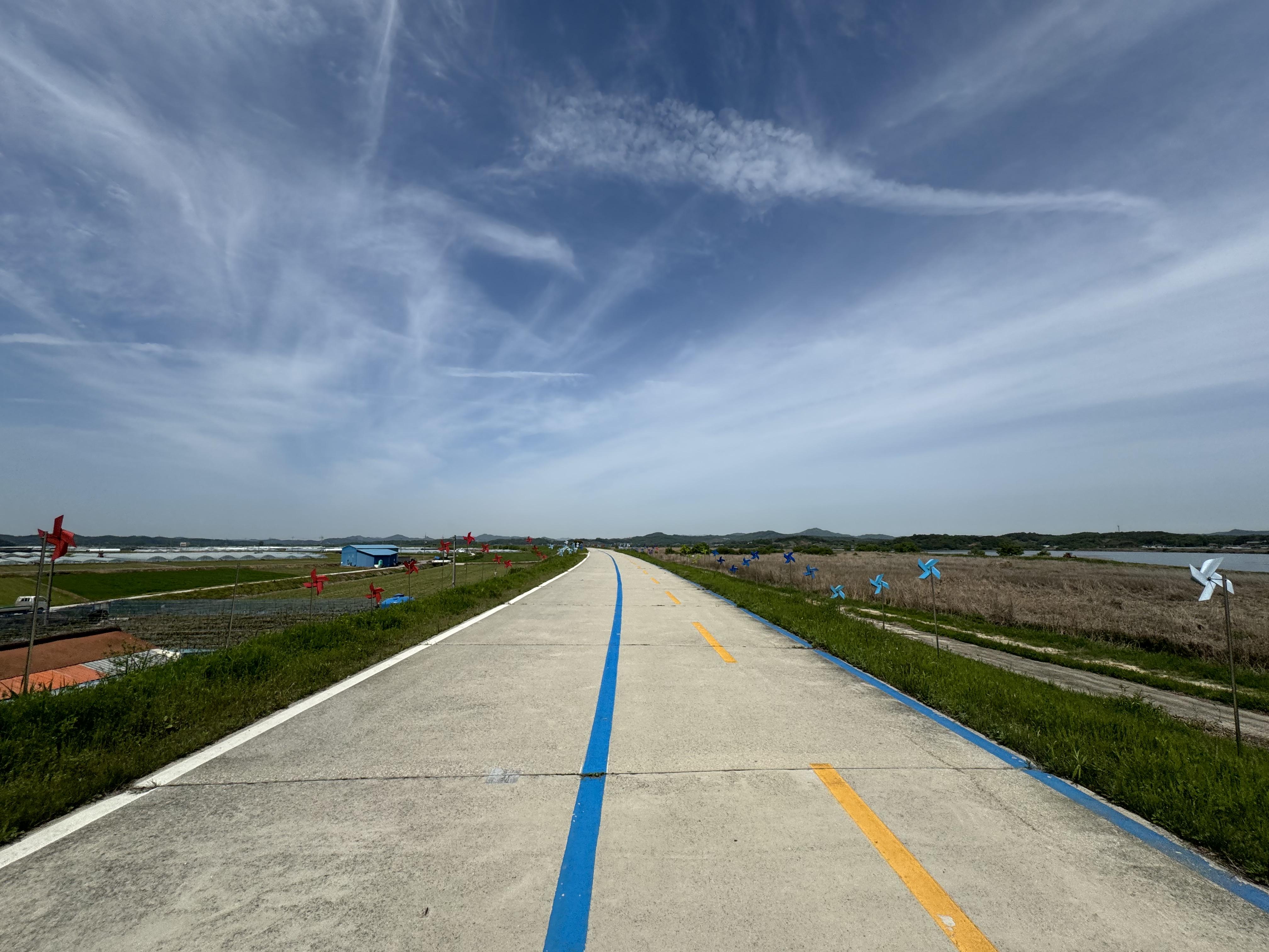 이제는 금강 종주의 정식 구간이 되어버린 것 같은 습지 공원의 우회 구간을 지나면 익산성당포구의 명물인 바람개비 길이 나온다. 여기서 영상을 좀 예쁘게 찍고 싶었지만 자전거 도로가 보이는 것과는 다르게 울퉁불퉁해서 생각보다 영상을 예쁘게 찍지는 못 해서 아쉽다.