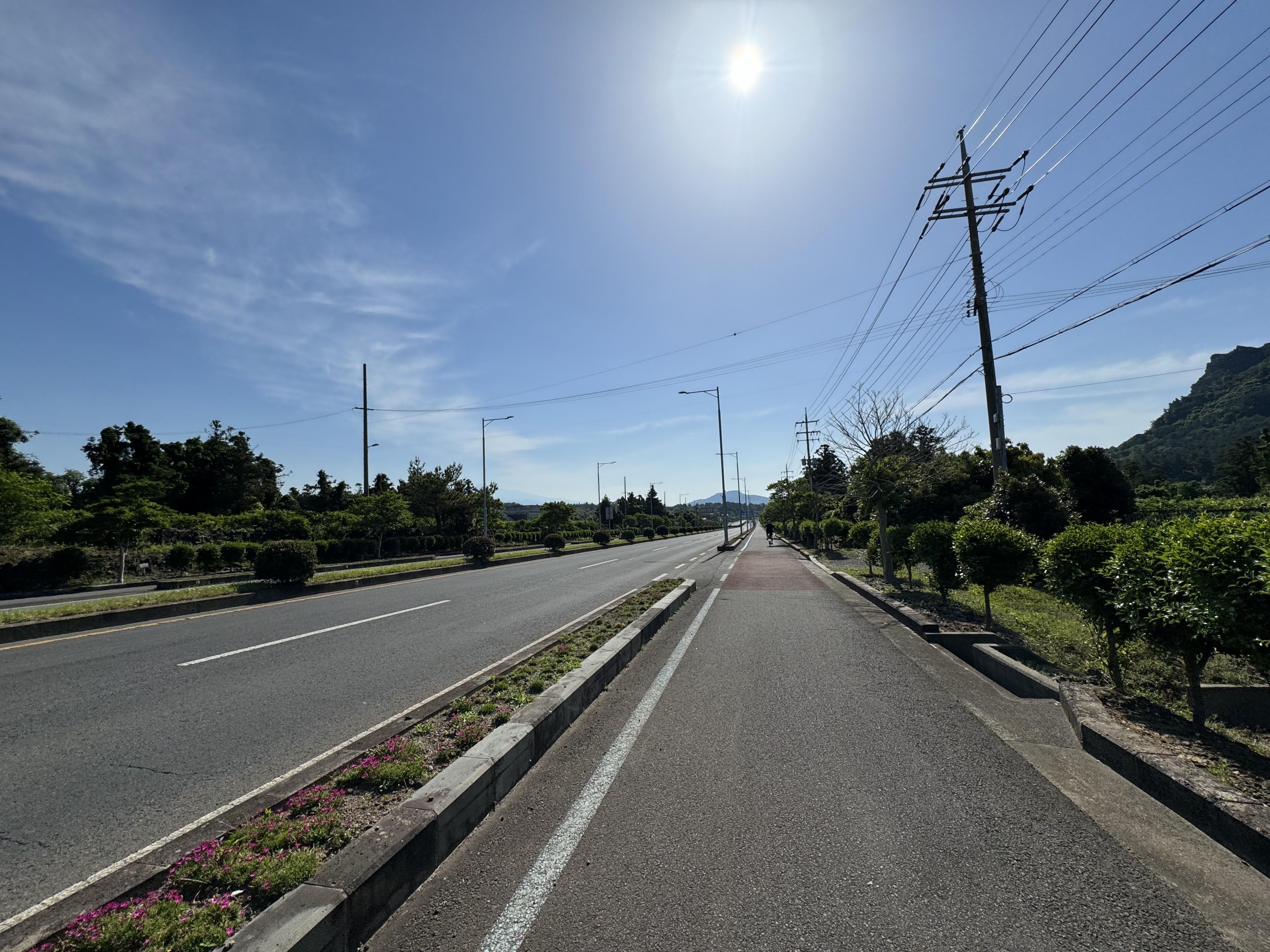 길을 따라서 열심히 달리다보니 어느덧 성산에 도착했다. 성산에 도착했으면 역시 성산일출봉과 사진을 찍어야 하니까 자전거 도로 안내판을 따라가지 않고 반대편 도로를 따라서 성산일출봉이 보이는 모래사장으로 바로 직행했다.