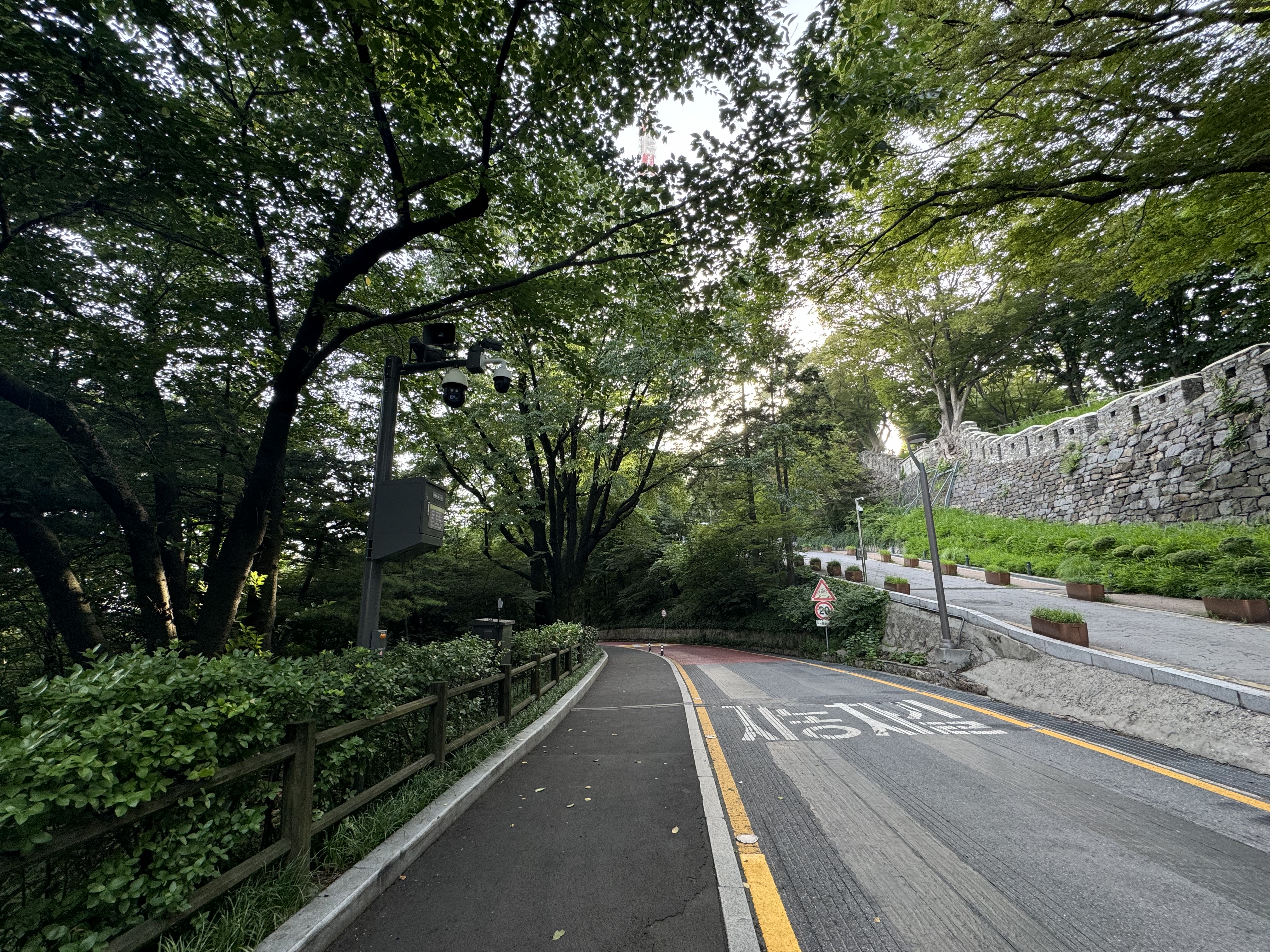 그냥 사족을 적자면 남산은 자동차길이 일방통행으로 되어 있어서 나와 같은 방향으로 한양도성 순성길 코스를 돌고 있다면 자동차가 오는 방향 쪽으로 걸어가면 코스가 맞는다. 즉, 아래 사진에 보이는 자동차길을 따라가지 말고 반대쪽으로 가면 된다.