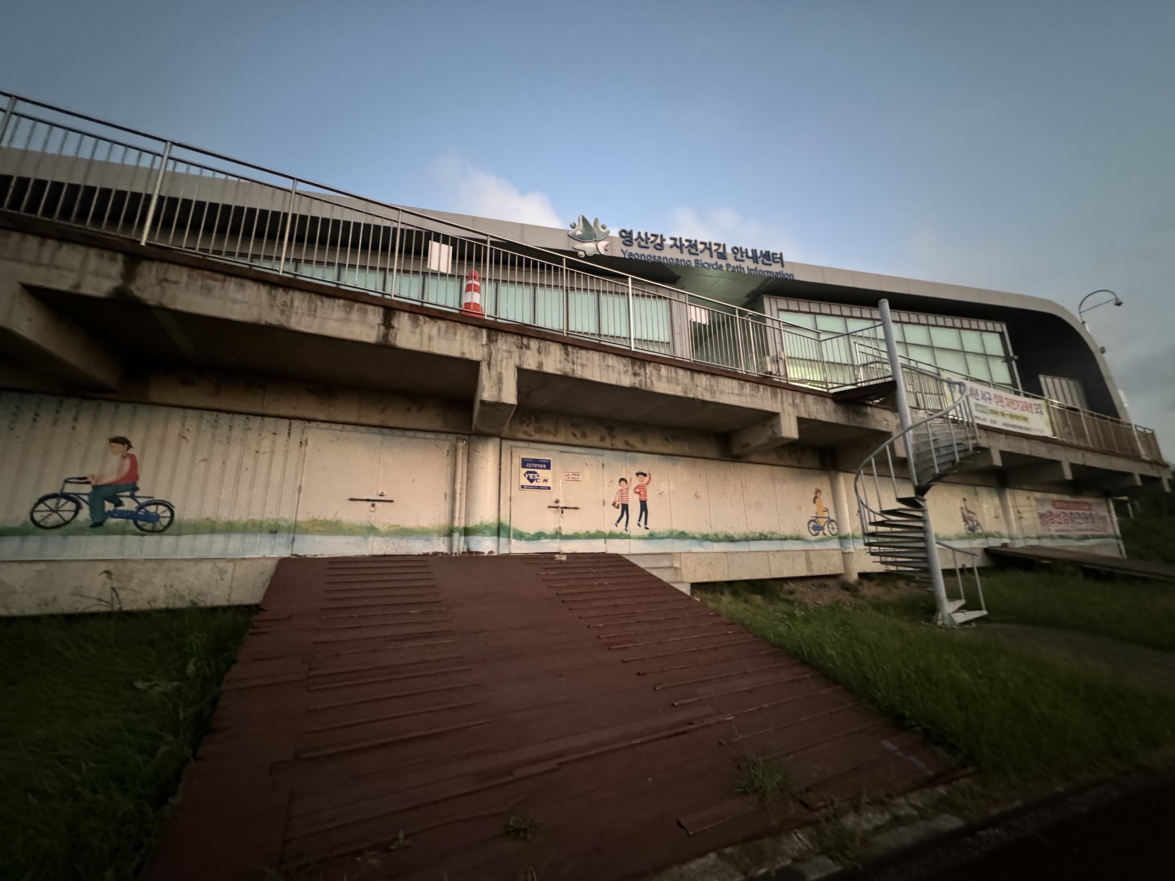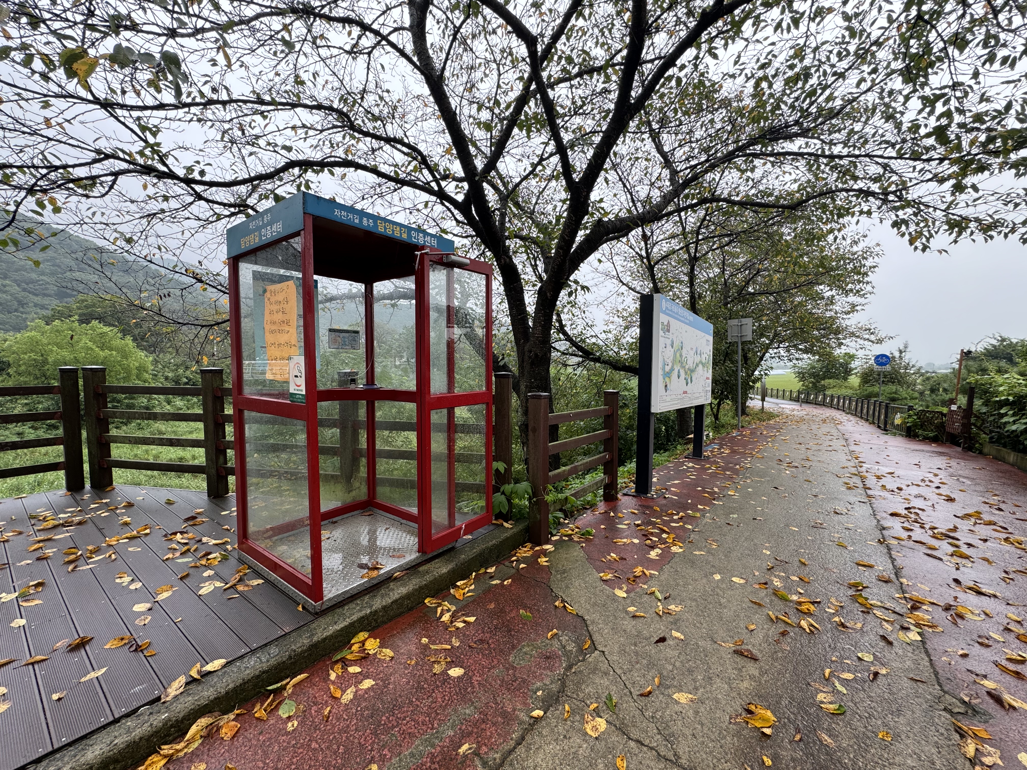 하여튼 우레탄 길을 피해서 깔끔한 뚝방 길을 따라 쭉쭉 달리다보니 20분 정도 달렸을 때 담양댐 인증센터가 나왔다. 담양공용버스터미널에서 담양댐 인증센터로 가는 자전거길의 경치가 꽤 좋은 편인데 역시나 비가 오니까 풍경을 즐길 틈이 없어서 아쉬웠다. 비가 오니 핸드폰을 자주 꺼낼 수도 없고.
